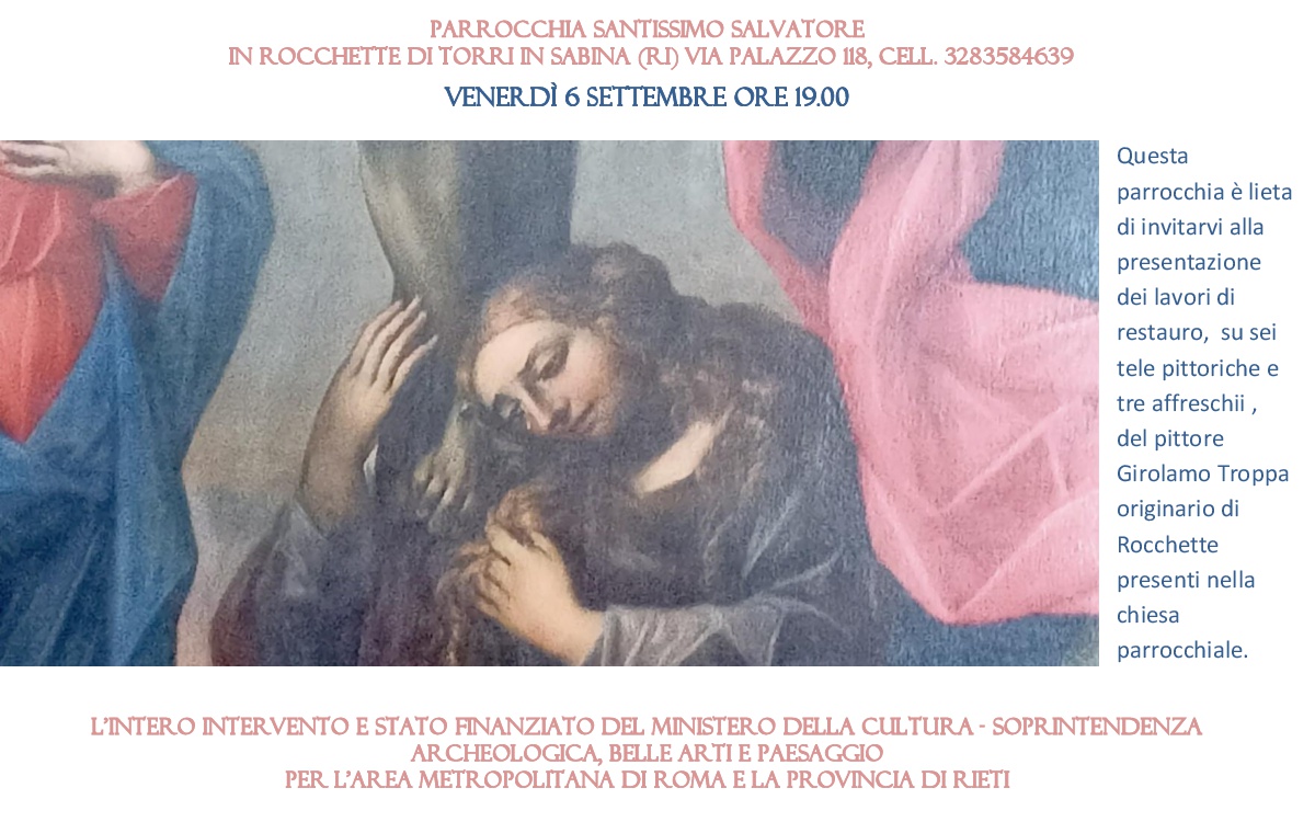 Venerdì 6 settembre presso la chiesa del Santissimo Salvatore a Rocchette di Torri in Sabina sono stati presentati i lavori di restauro delle opere del pittore Girolamo Troppa, originario di Rocchette. Sei tele: Trinità, Fuga in Egitto, Madonna con Bambino, San Filippo e San Gaetano; Crocifissione con la Madonna, Maria Maddalena e San Giovanni; Madonna del Rosario; Sant’Antonio di Padova, e di tre affreschi: Sa Sebastiano, San Lorenzo, Madonna con Bambino tra San Gandolfo e Santo. La cerimonia si è svolta alla presenza del vescovo Francesco Antonio Soddu, che ha presieduto la celebrazione eucaristica.