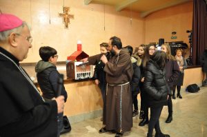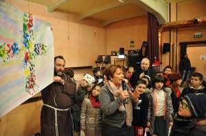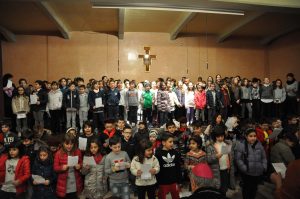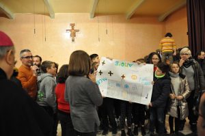 E’ stato un festoso e gioioso incontro quello del vescovo con i ragazzi dell’iniziazione cristiana, circa 160, che si sono presentati attraverso i cartelloni realizzati dai vari gruppi, dal precatechismo, ai due gruppi del primo anno, del secondo anno e della comunione e ai due gruppi del primo anno di cresima, oltre al gruppo degli esploratori.