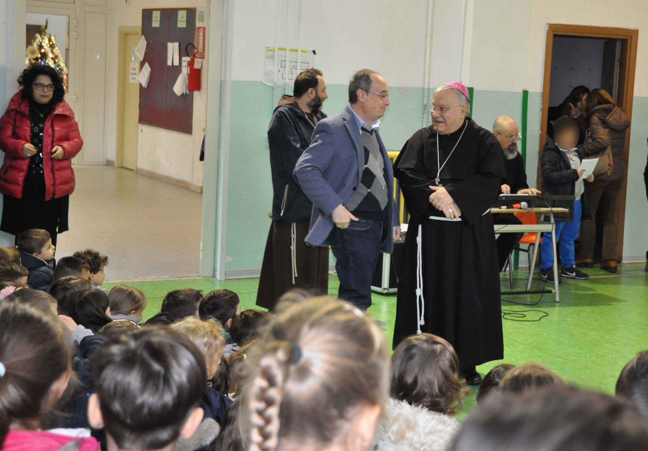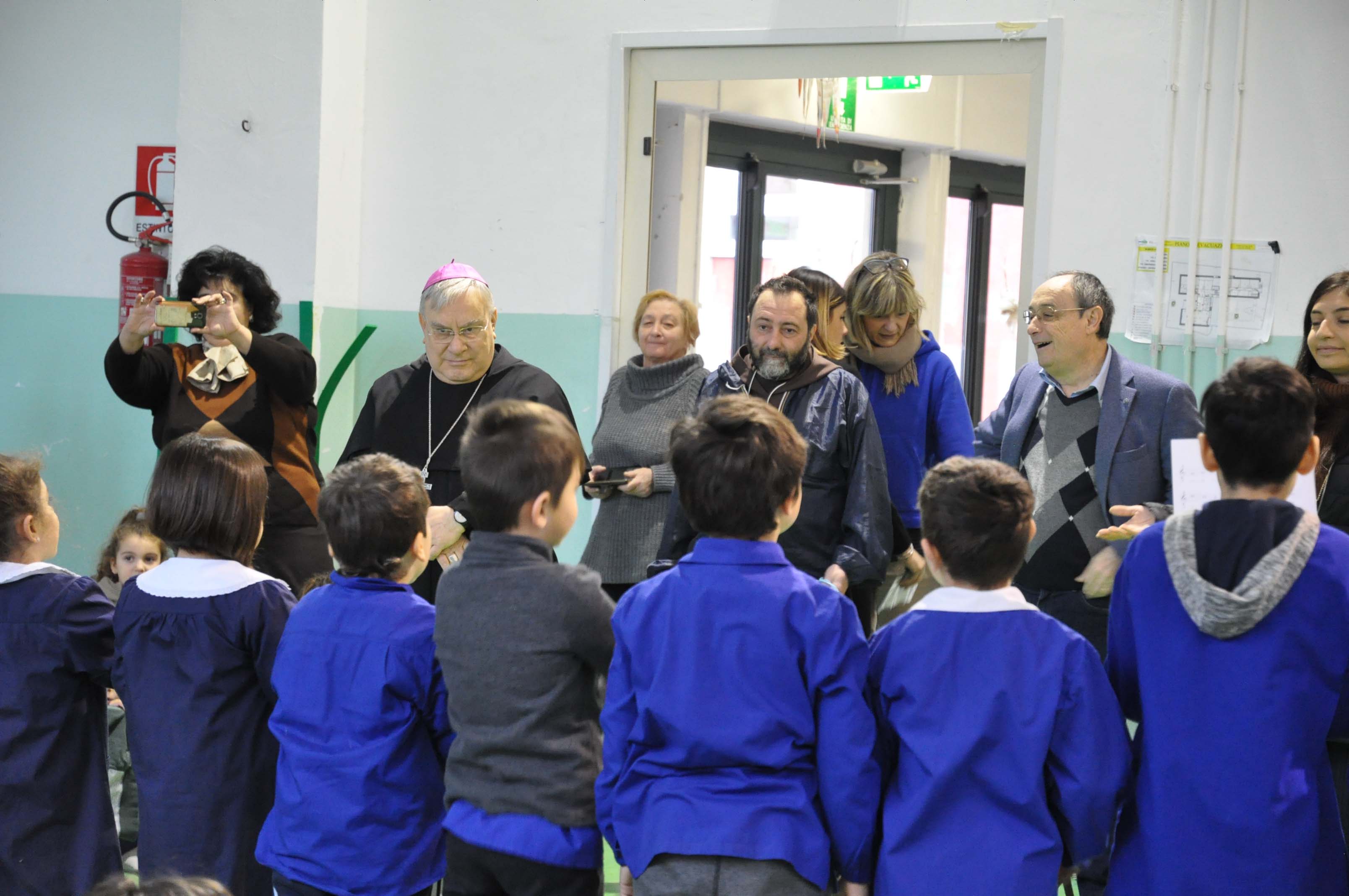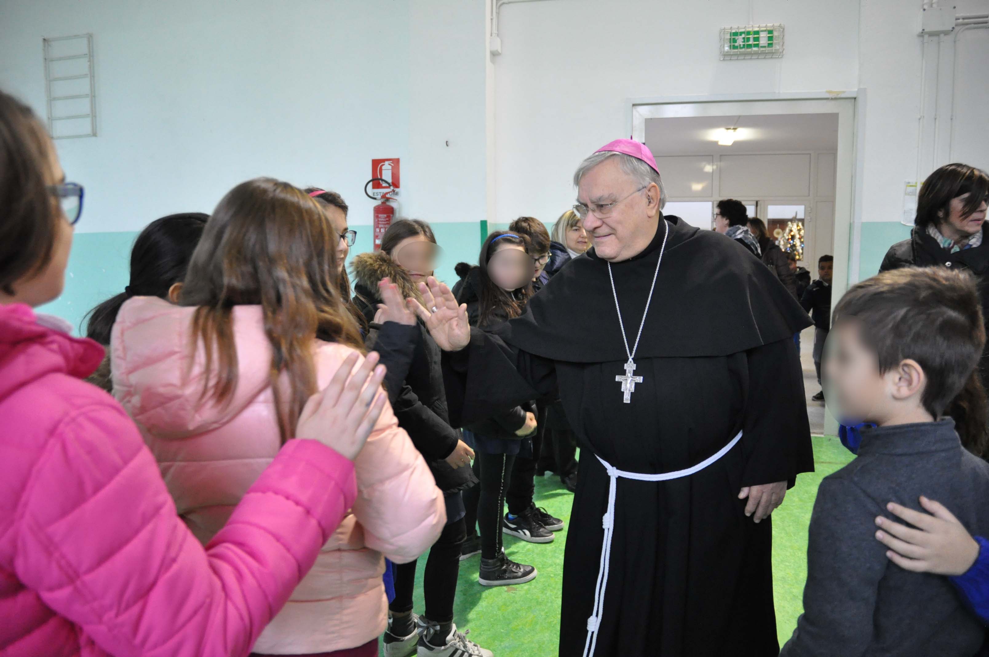 Gioioso e festante è stato l’incontro del vescovo con gli studenti, insegnanti della scuola primaria e dell’infanzia “R.Donatelli”, salutato dal dirigente scolastico Claudio Guerrini. I bambini hanno accolto il vescovo con un cartellone di benvenuto, con un canto, il suono dei flauti e tanto entusiasmo ed hanno donato al vescovo un disegno sul Natale.