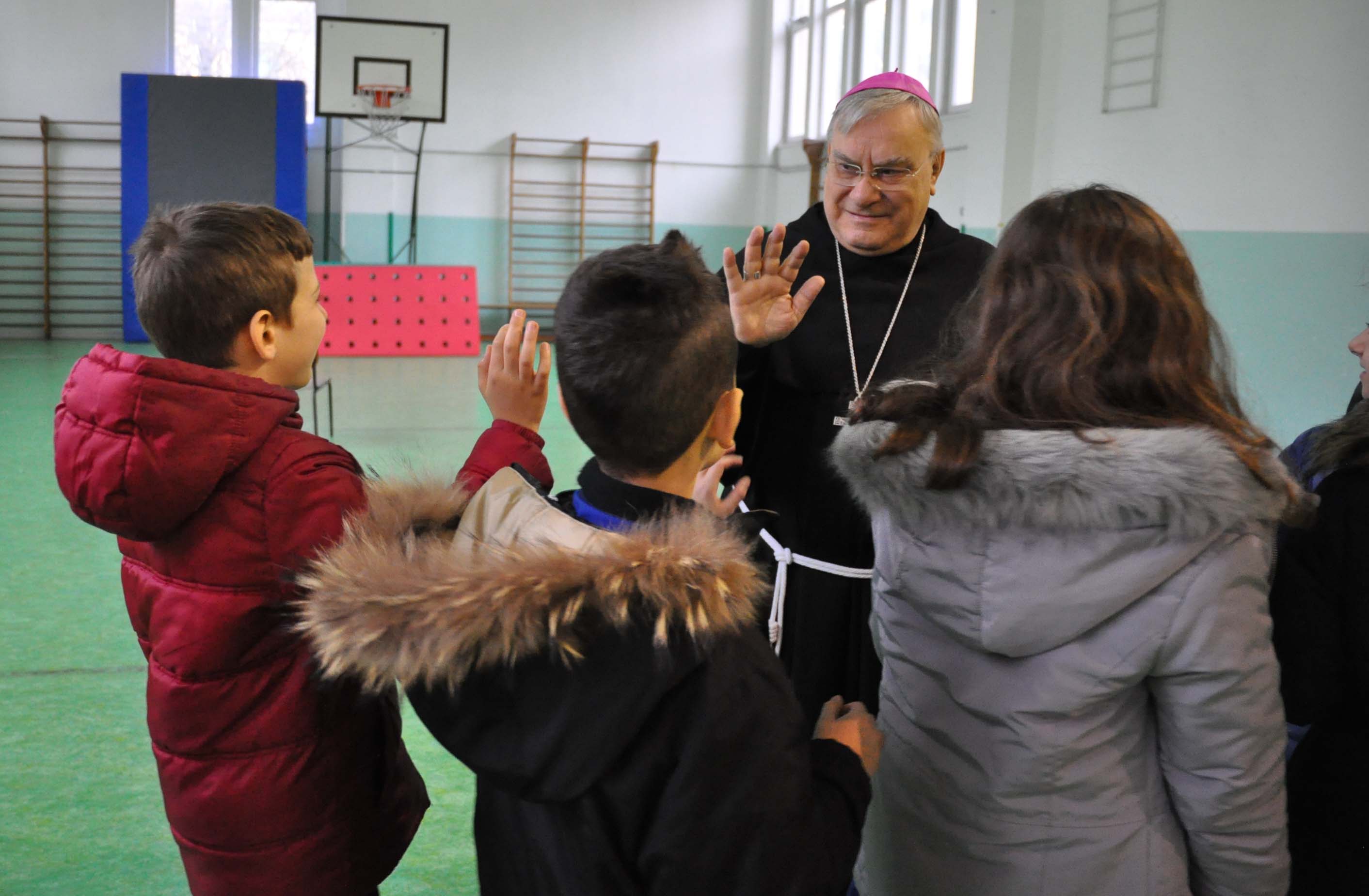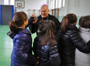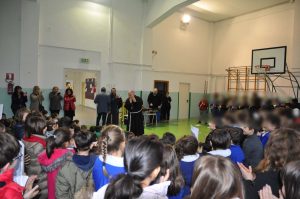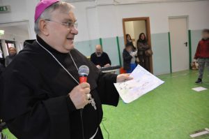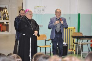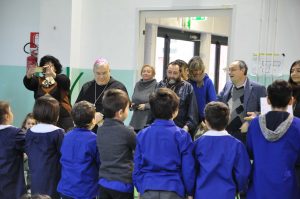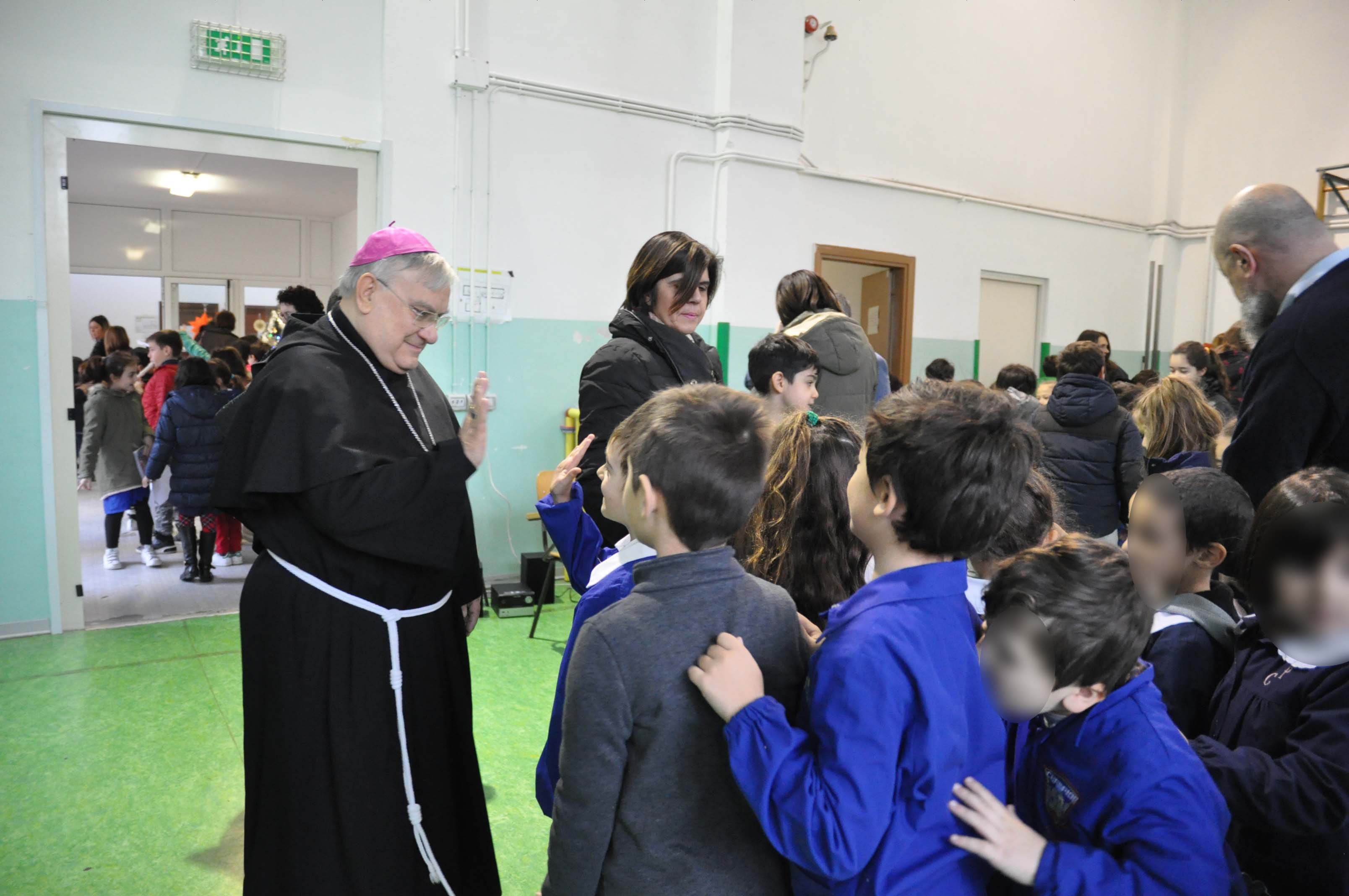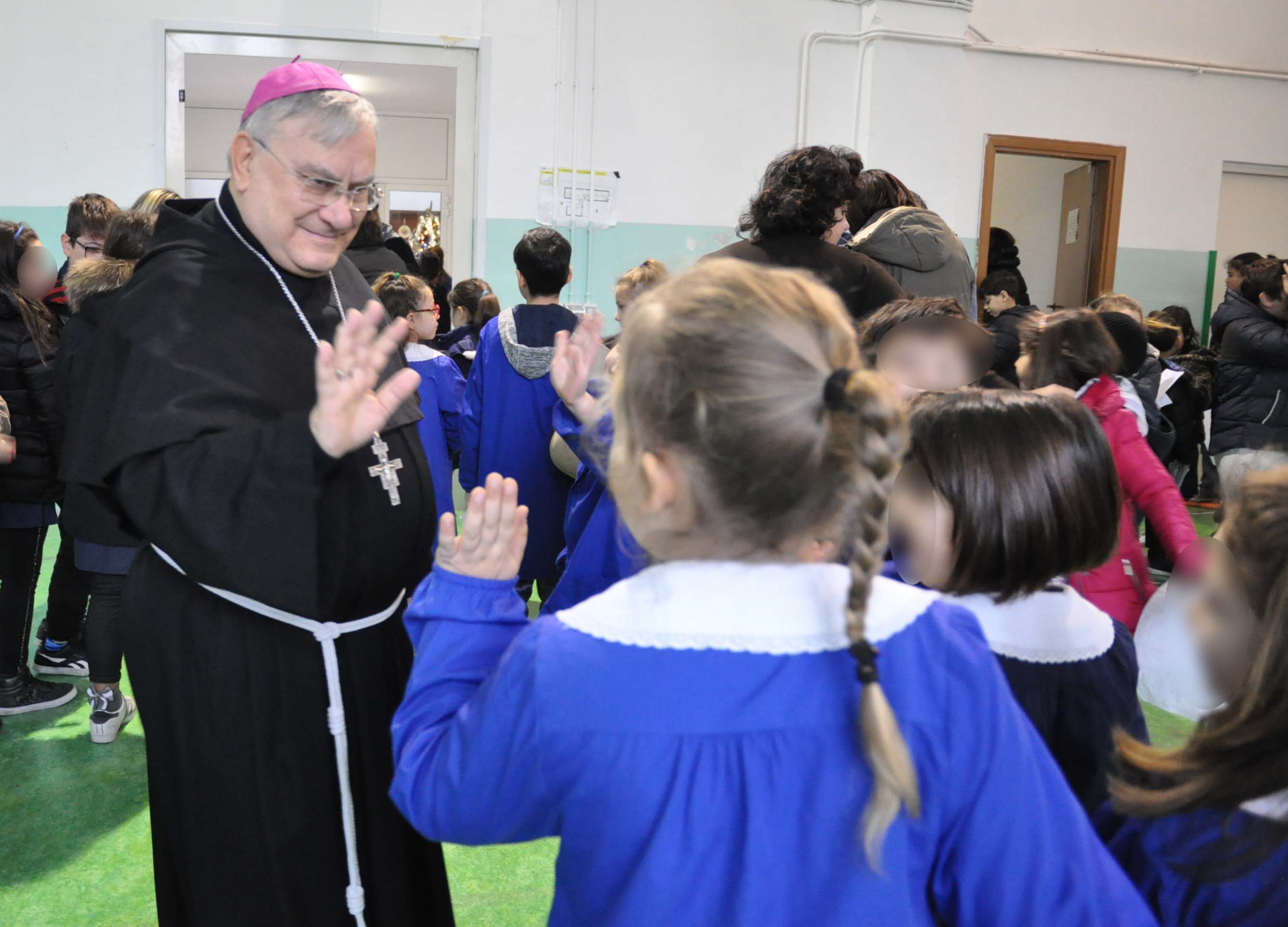 Gioioso e festante è stato l’incontro del vescovo con gli studenti, insegnanti della scuola primaria e dell’infanzia “R.Donatelli”, salutato dal dirigente scolastico Claudio Guerrini. I bambini hanno accolto il vescovo con un cartellone di benvenuto, con un canto, il suono dei flauti e tanto entusiasmo ed hanno donato al vescovo un disegno sul Natale.