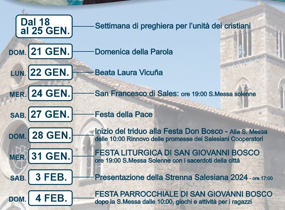 Domenica 28 gennaio, rinnovo delle promesse dei salesiani cooperatori alla messa delle ore 10.00. A seguire incontro con i genitori della prima comunione.