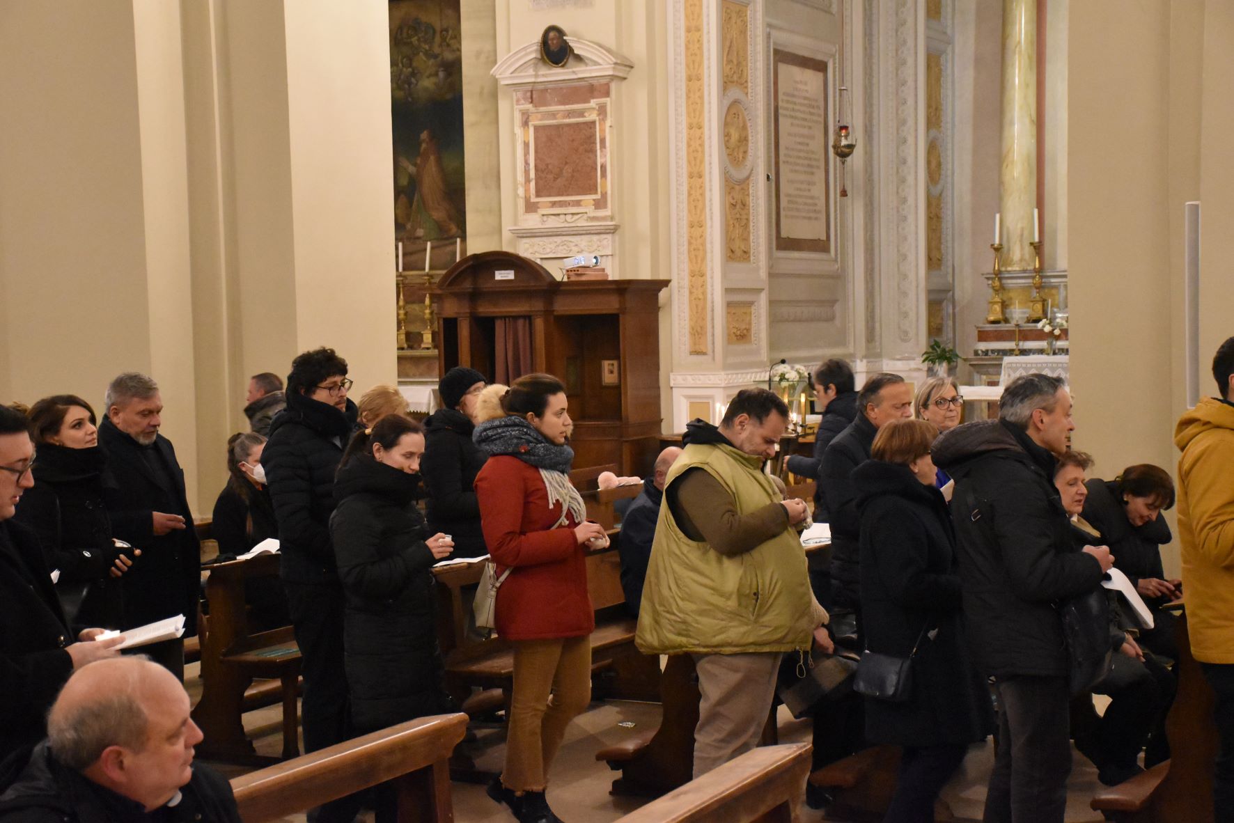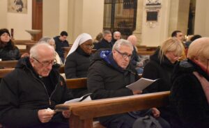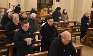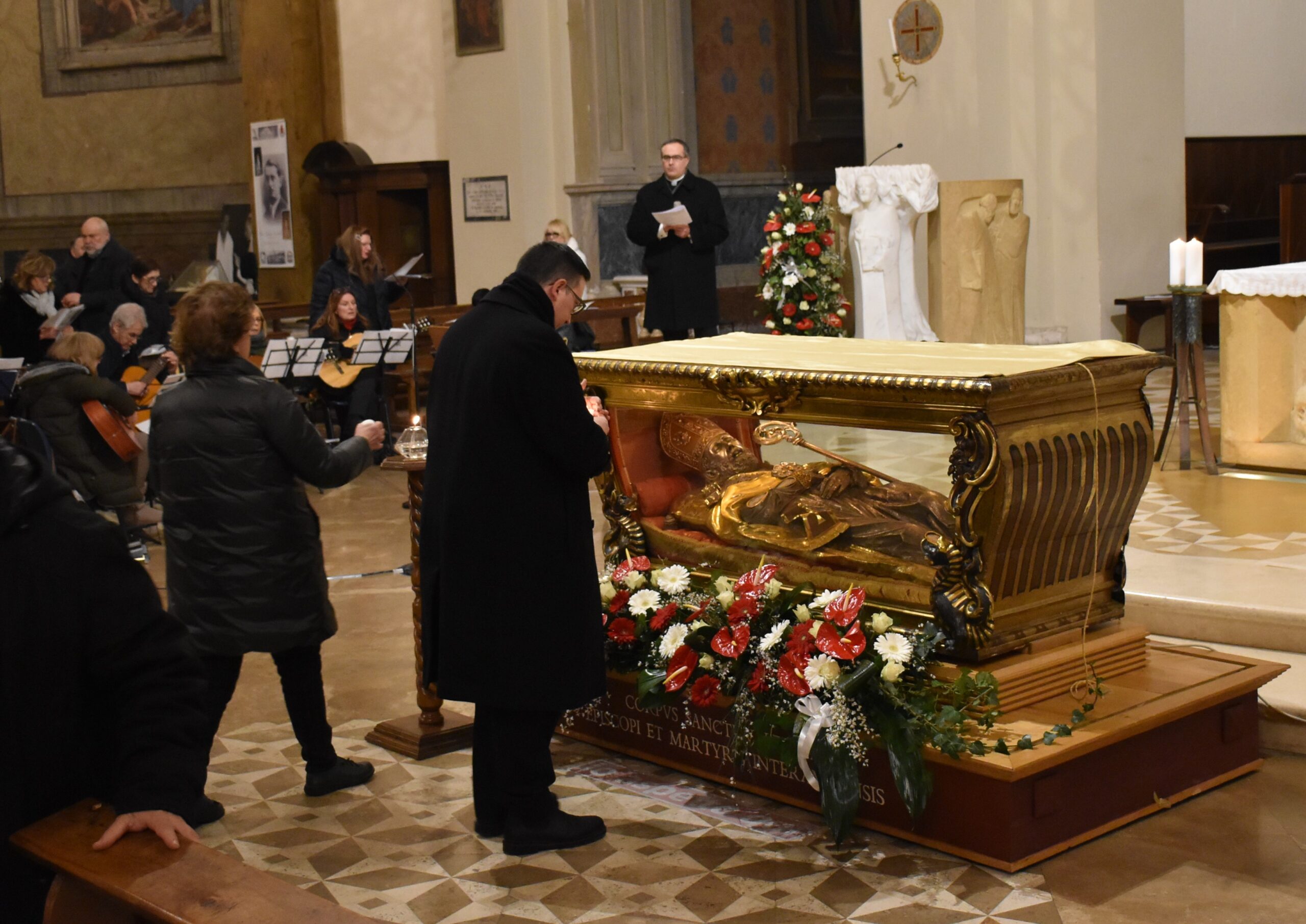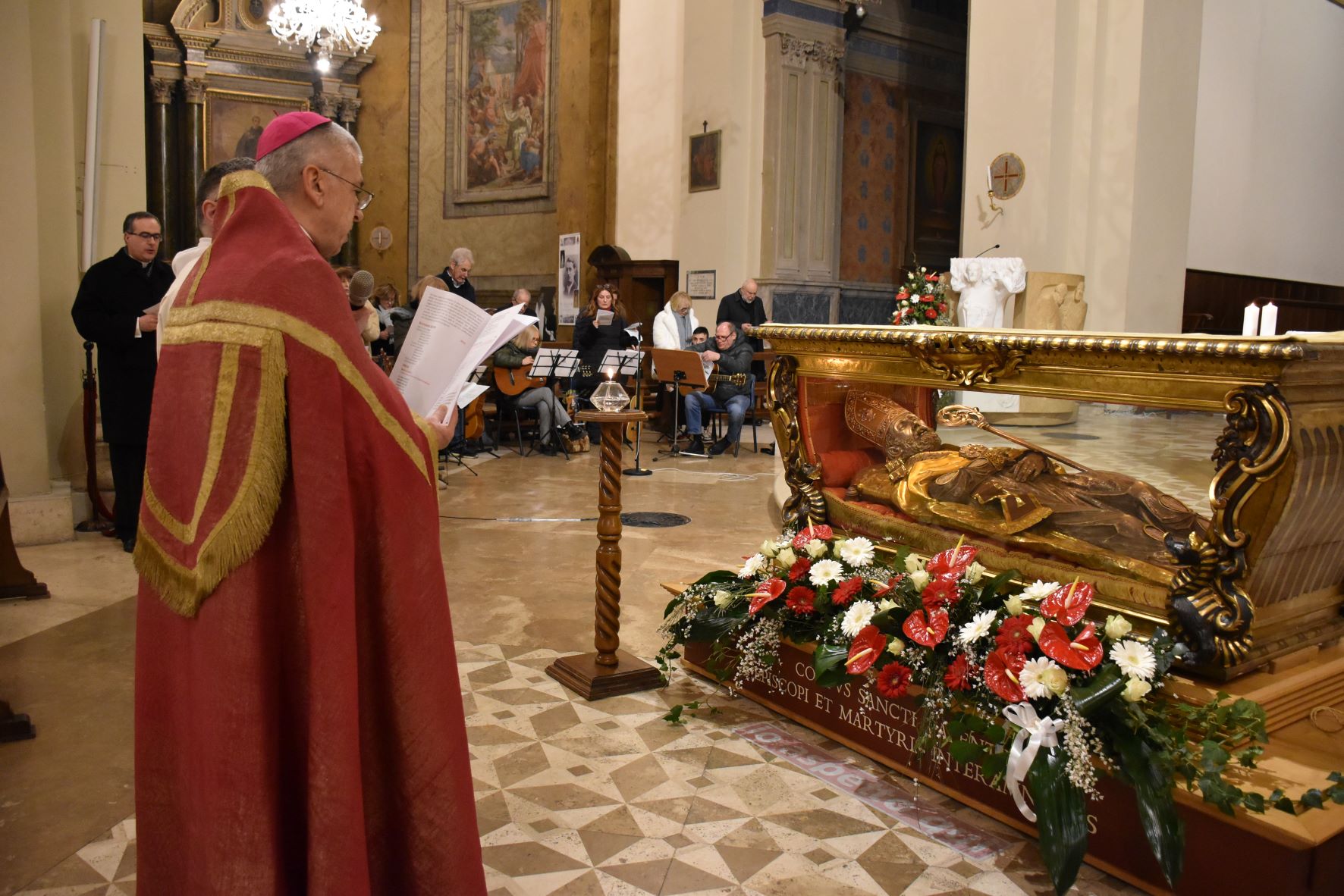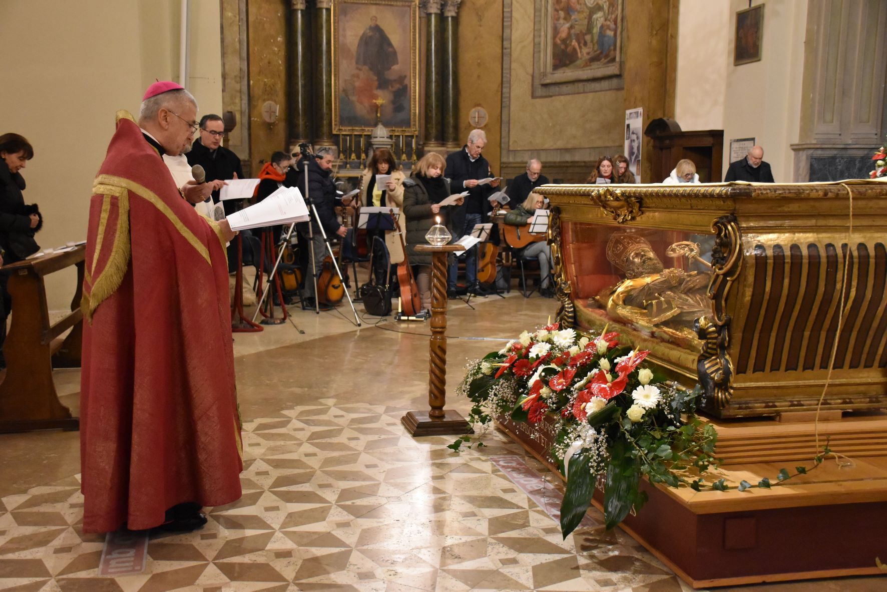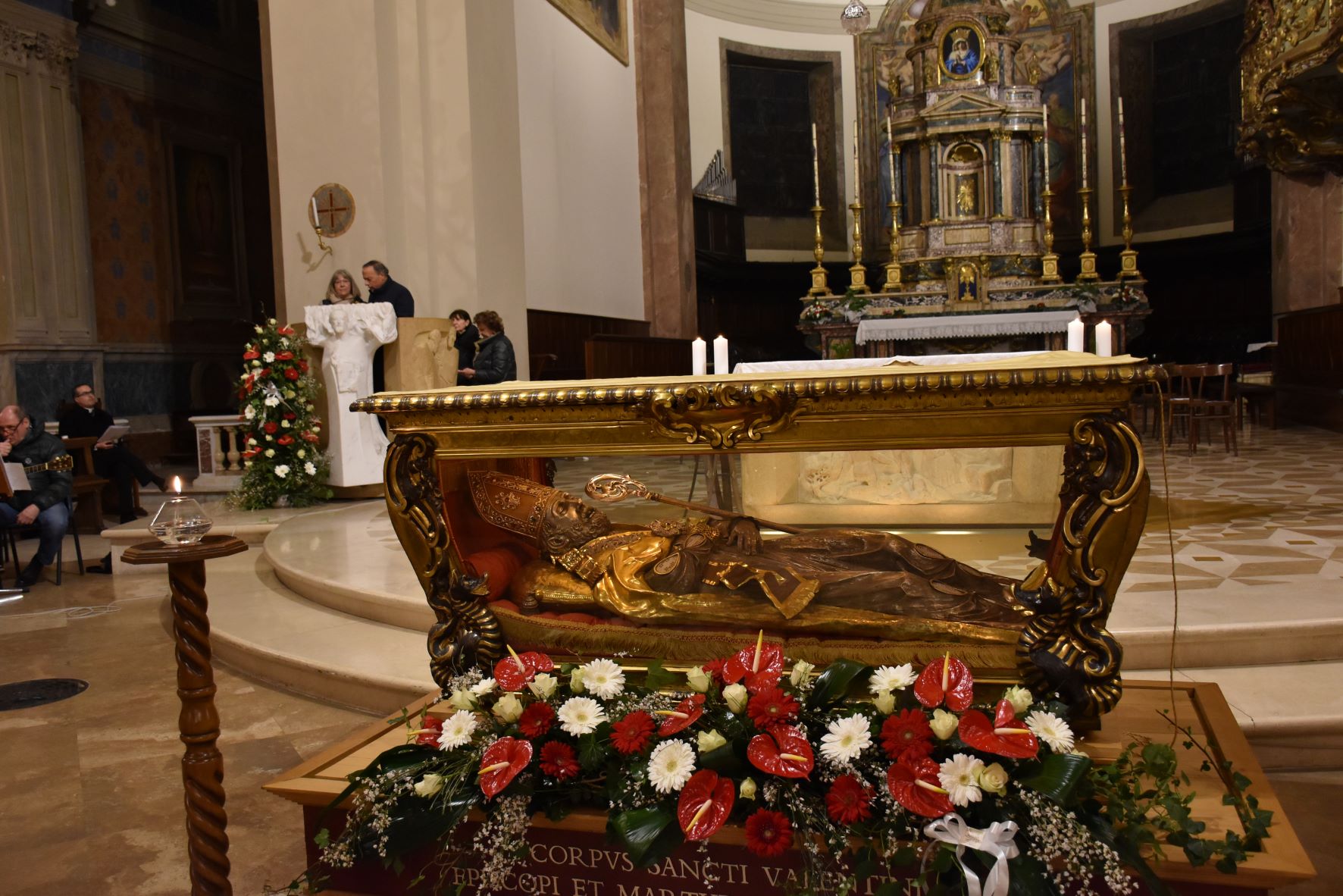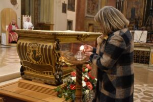 L’urna con le reliquie di San Valentino è arrivata in Cattedrale a Terni nella serata di sabato 11 febbraio, scortata dalle forze dell’ordine e accolta sul sagrato della cattedrale dal vescovo Francesco Antonio Soddu e dal vicario genarale don Salvatore Ferdinandi, don Matteo Antonelli e don Enzo Greco. E’ seguita la veglia di preghiera iniziata con la deposizione della lampada davanti all’urna del Santo da parte del vescovo mentre veniva cantato l’inno a San Valentino. Sono poi stati letti i Salmi, brani del Vangelo, e un brano tratto dai Discorsi di Sant’Agostino, la preghiera al Santo, letti da un giovane, una famiglia, da alcuni medici, e rappresentanti del mondo del lavoro. Al termine sacerdoti, fedeli delle varie parrocchie, movimenti e associazioni della diocesi hanno acceso un lumino alla lampada accanto all’urna, in segno di devozione al patrono, da portare nelle proprie case come segno di speranza.