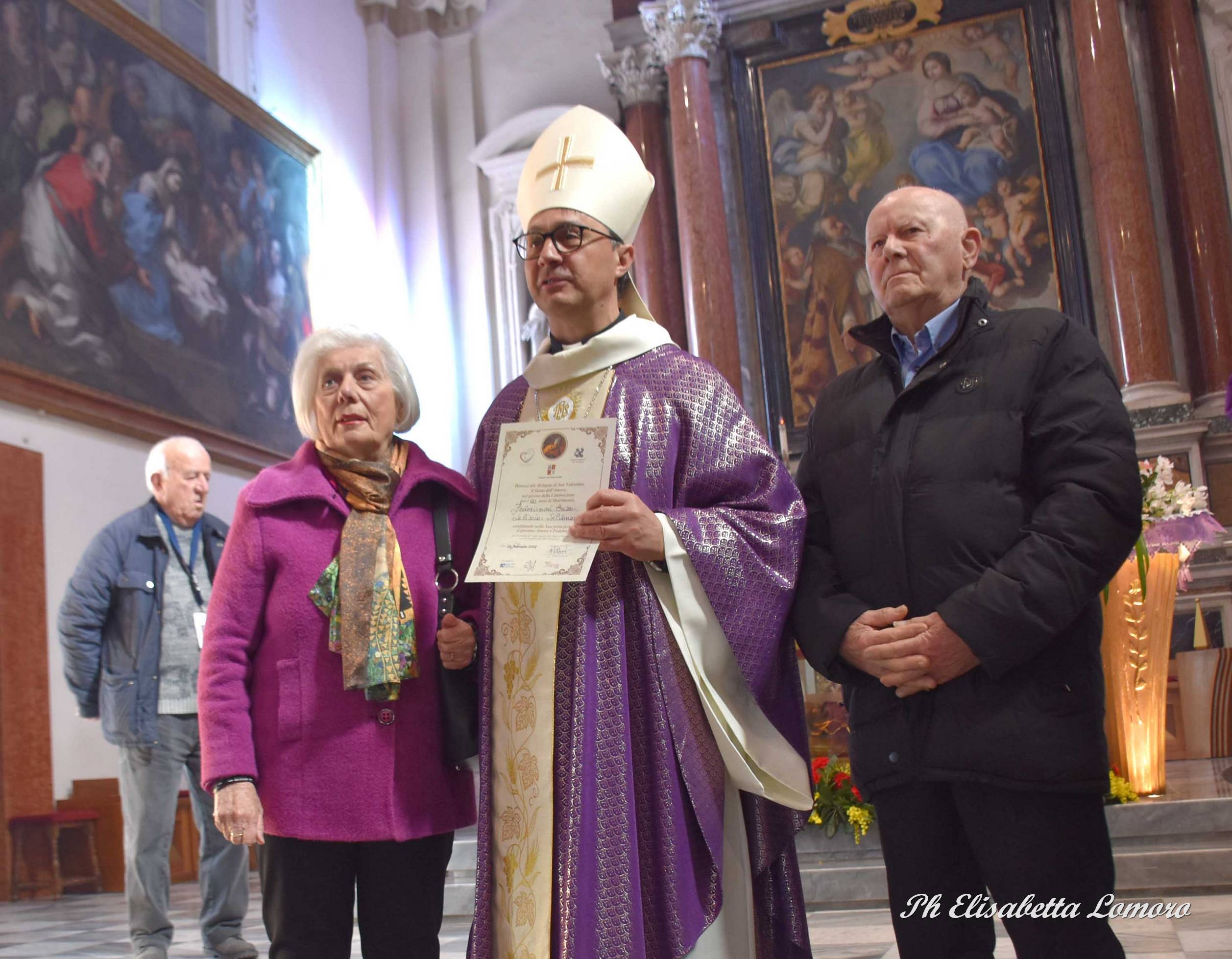“Oggi in cui celebriamo l’amore sponsale- ha detto il vescovo Nappa – voi siete simbolo dell’amore oblativo e donante, dell’amore comiungale dove ci si accorge di esistere insieme a qualcuno, in modo dialettico, perchè nessuna coppia non ha avuto mai problemi. E’ come lasciare qualcosa perchè l’amore in cui ho creduto possa continuare. Siamo qui per ringraziare il Signore e per chiedere sostegno nel cammino della vita sponsale, per far vivere il compimento di questo amore che nella vita avete sperimentato, alimentato, a volte maltrattato. Siamo però ancora davanti al Signore, nonostante tutto, perchè continui a benederci per intecessione di San Valentino principe dell’amore”.