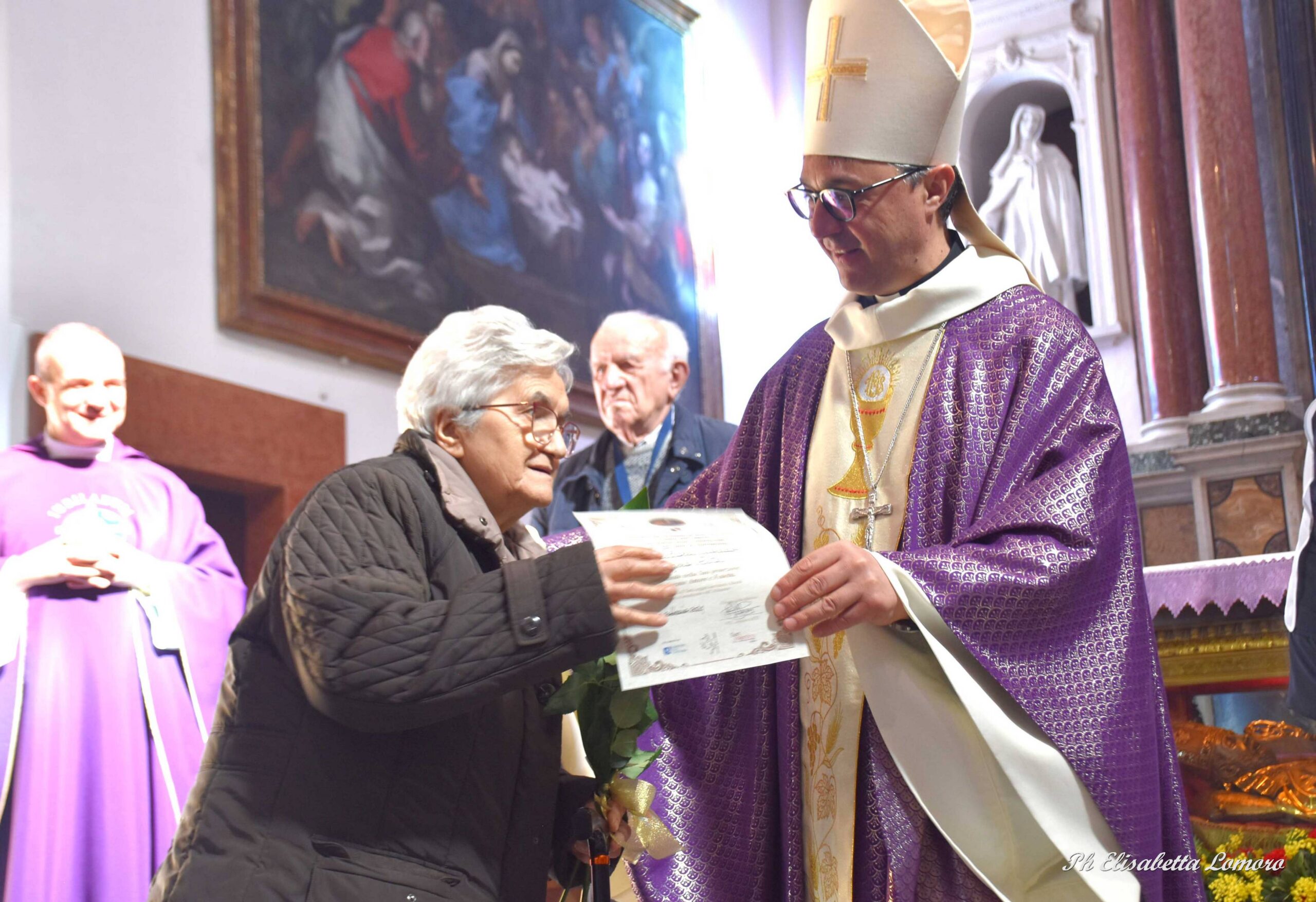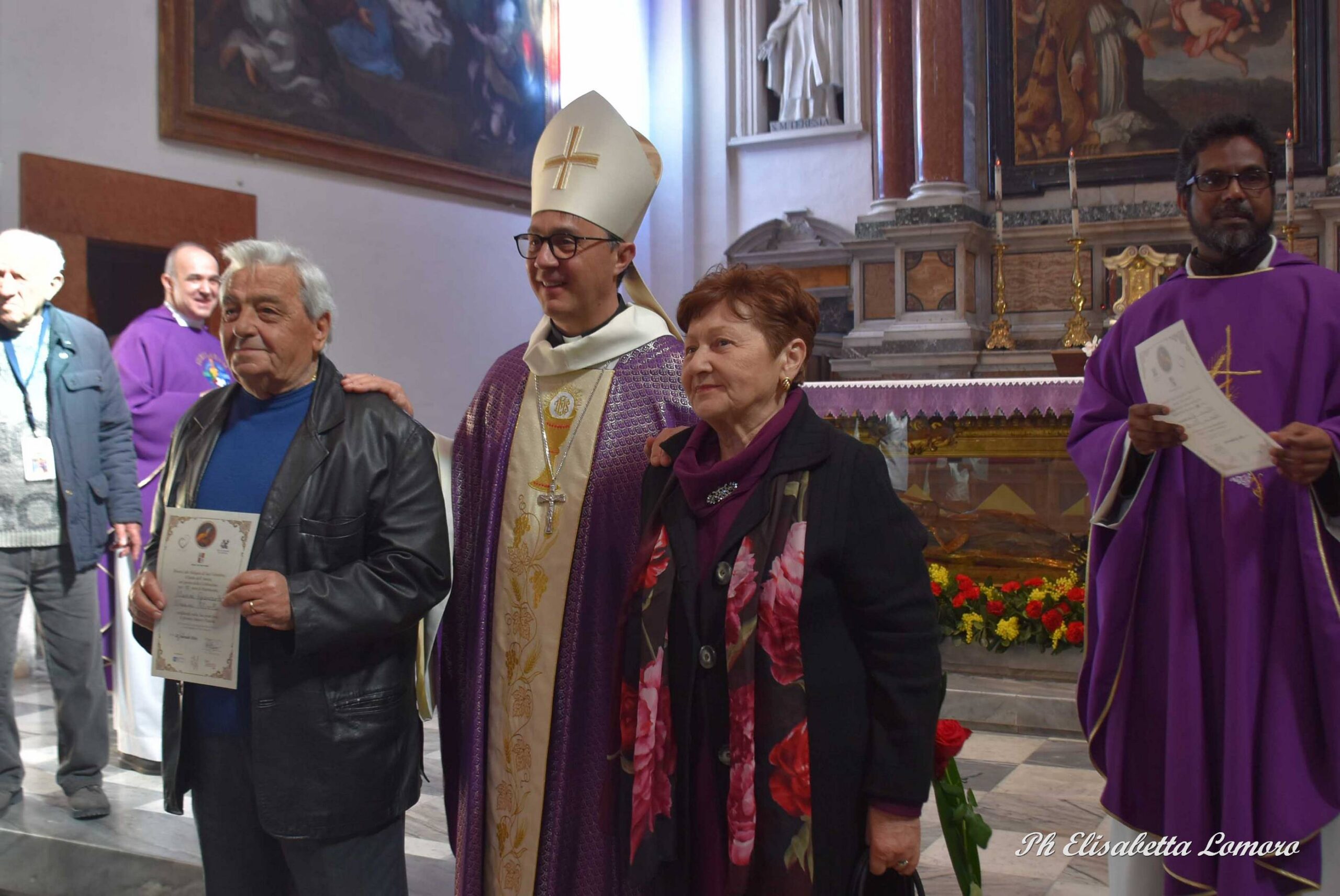 Alle coppie di sposi è stata donata una rosa rossa e la pergamena ricordo dell’anniversario consegnata a ciascuno al termine della celebrazione da mons. Nappa.