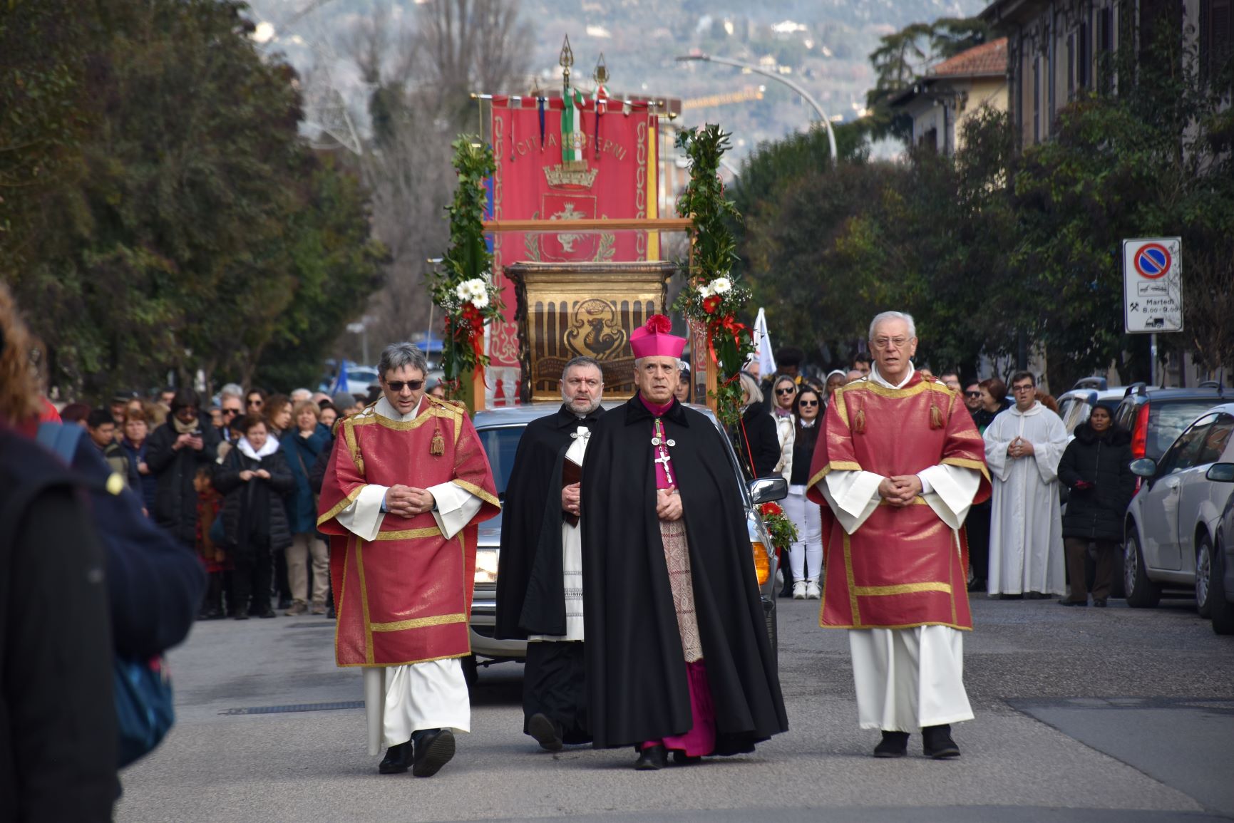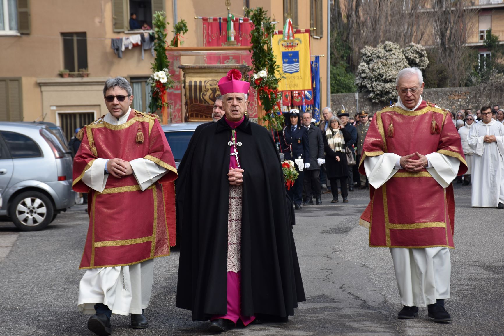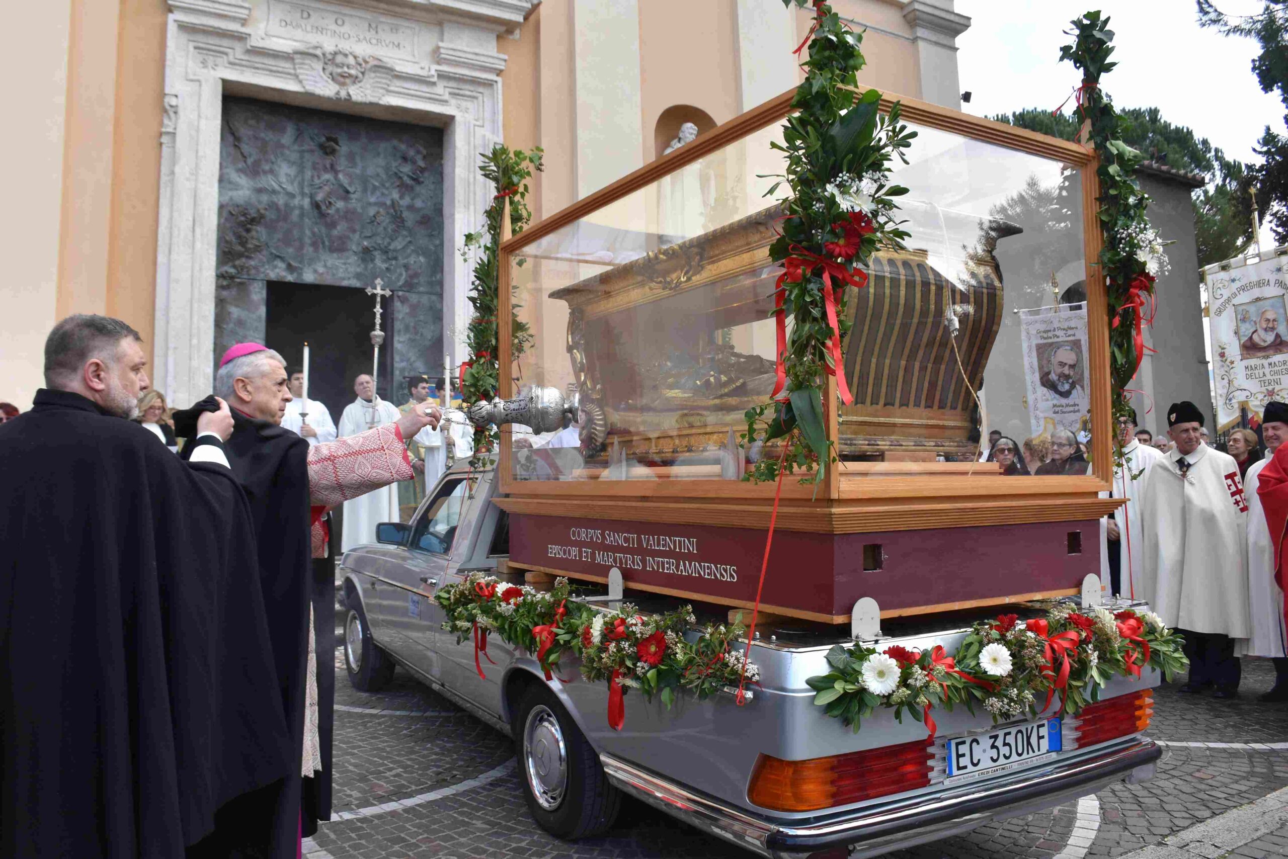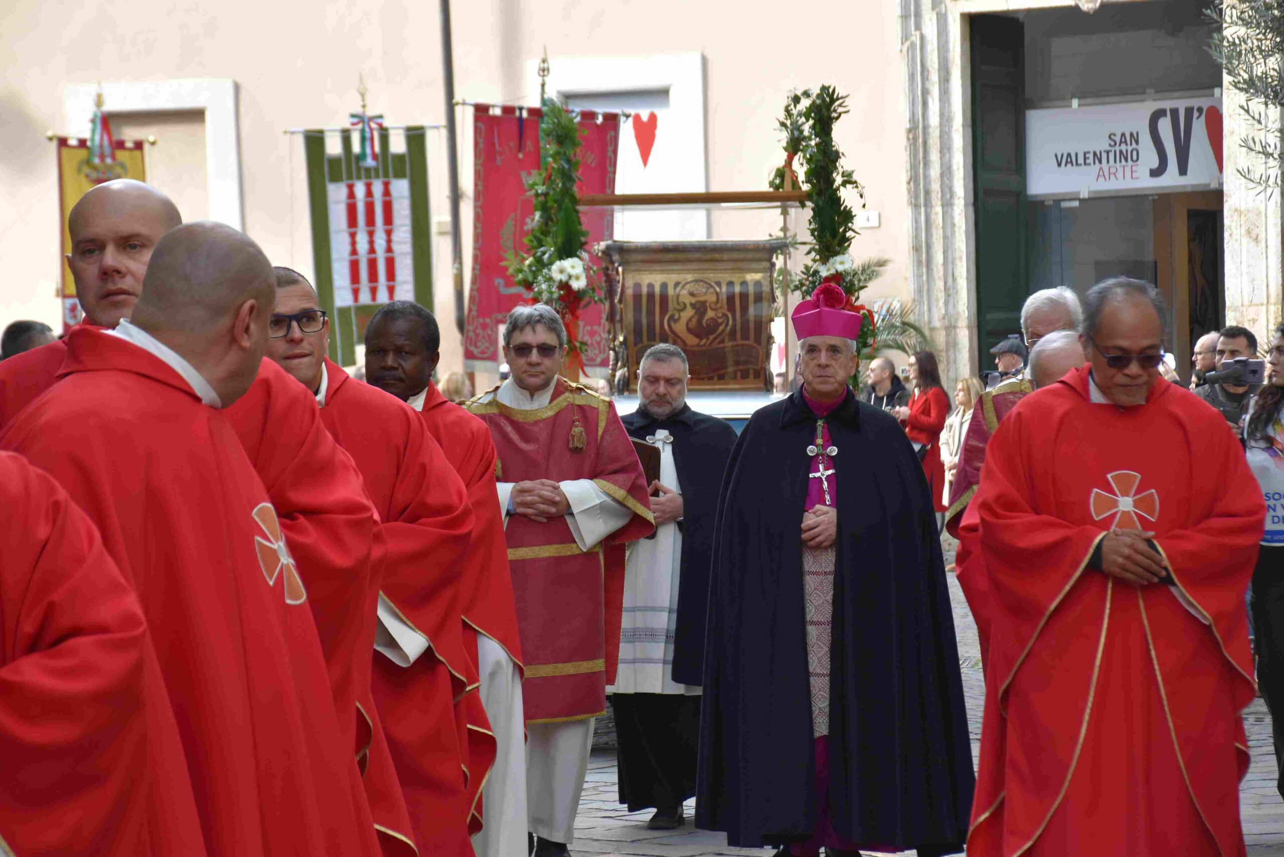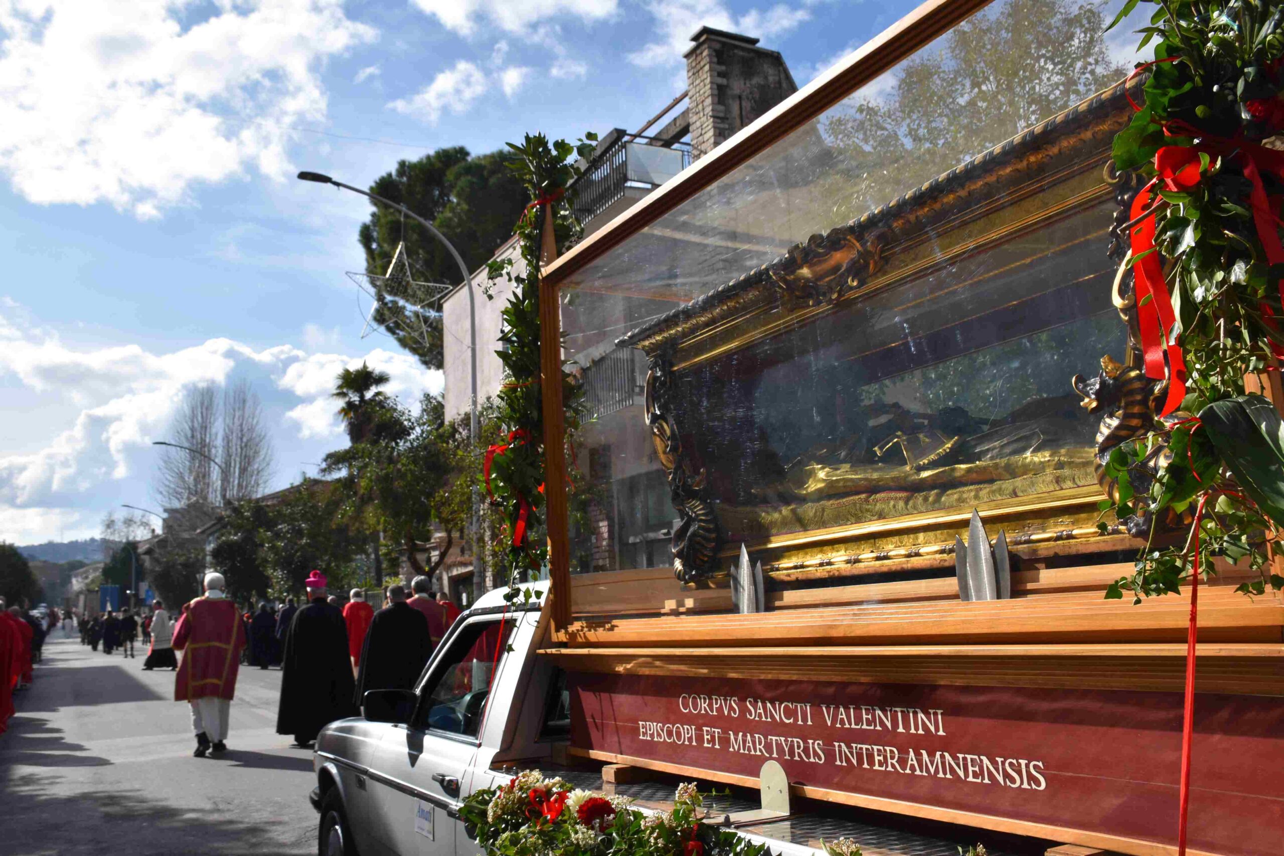 La processione è stata accompagnata dai gonfaloni del Comune, Regione e Provincia e da quelli delle confraternite, insieme ai rappresentanti di movimenti e associazioni diocesane, dalle istituzioni civili e militari presenti alla celebrazione del pontificale, dai figuranti in abiti storici del 1600 e dai tamburini e musici del terziere di Mezule di Narni. Sul sagrato c’è stato la preghiera del presidente dell’Azione Cattolica diocesana Rita Pileri: «San Valentino facci tornare al cuore delle cose! Rendi questa città capace di guardare con amore verso l’altro, verso le vie e le piazze perché siamo capaci di usarle con il rispetto con il quale trattiamo le nostre cose più importanti, quelle che vorremmo lasciare ai nostri figli. Fa in modo che questa città sia ancora capace di promuovere la cultura dello scambio, dell’ascolto e del dialogo, ne abbiamo bisogno per tornare a guardare al futuro, per non ripiegarci su noi stessi, per promuovere la partecipazione attiva per la ricerca del bene comune e della pace». IL TESTO INTEGRALE DELLA PREGHIERA