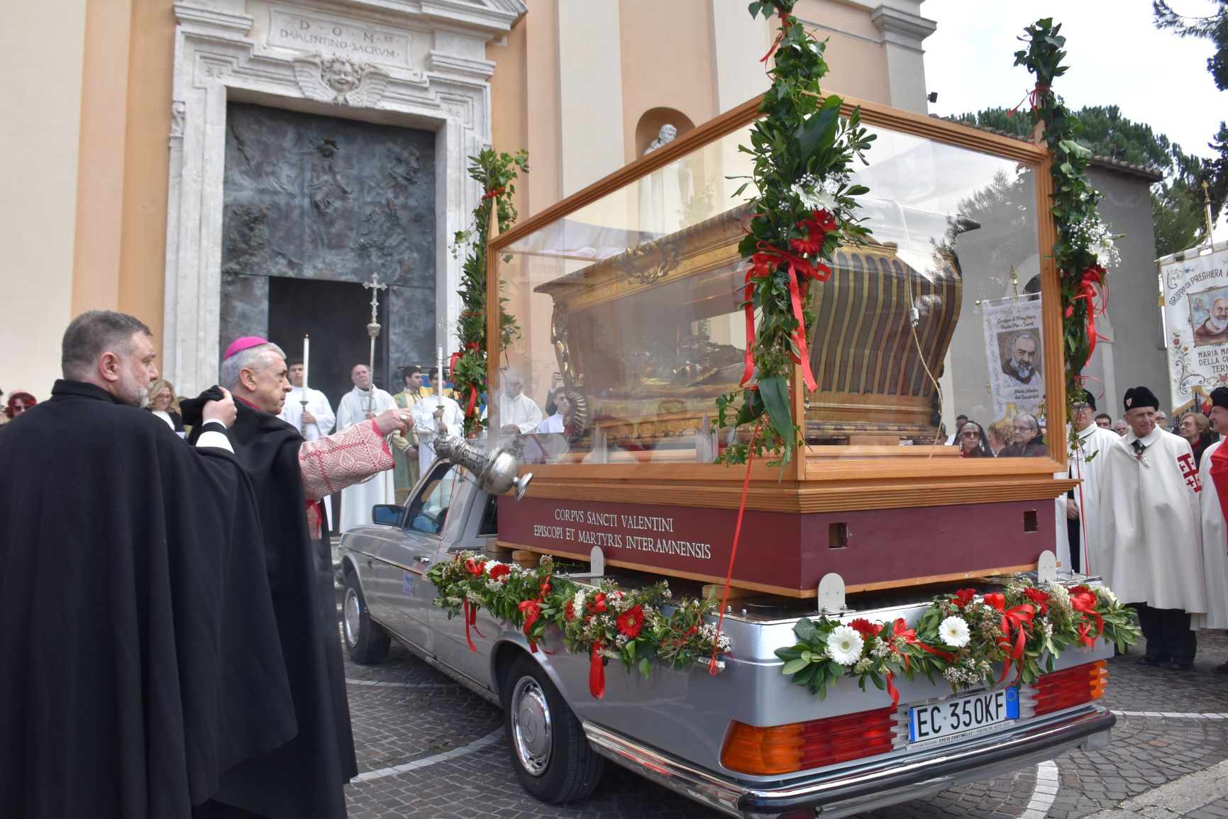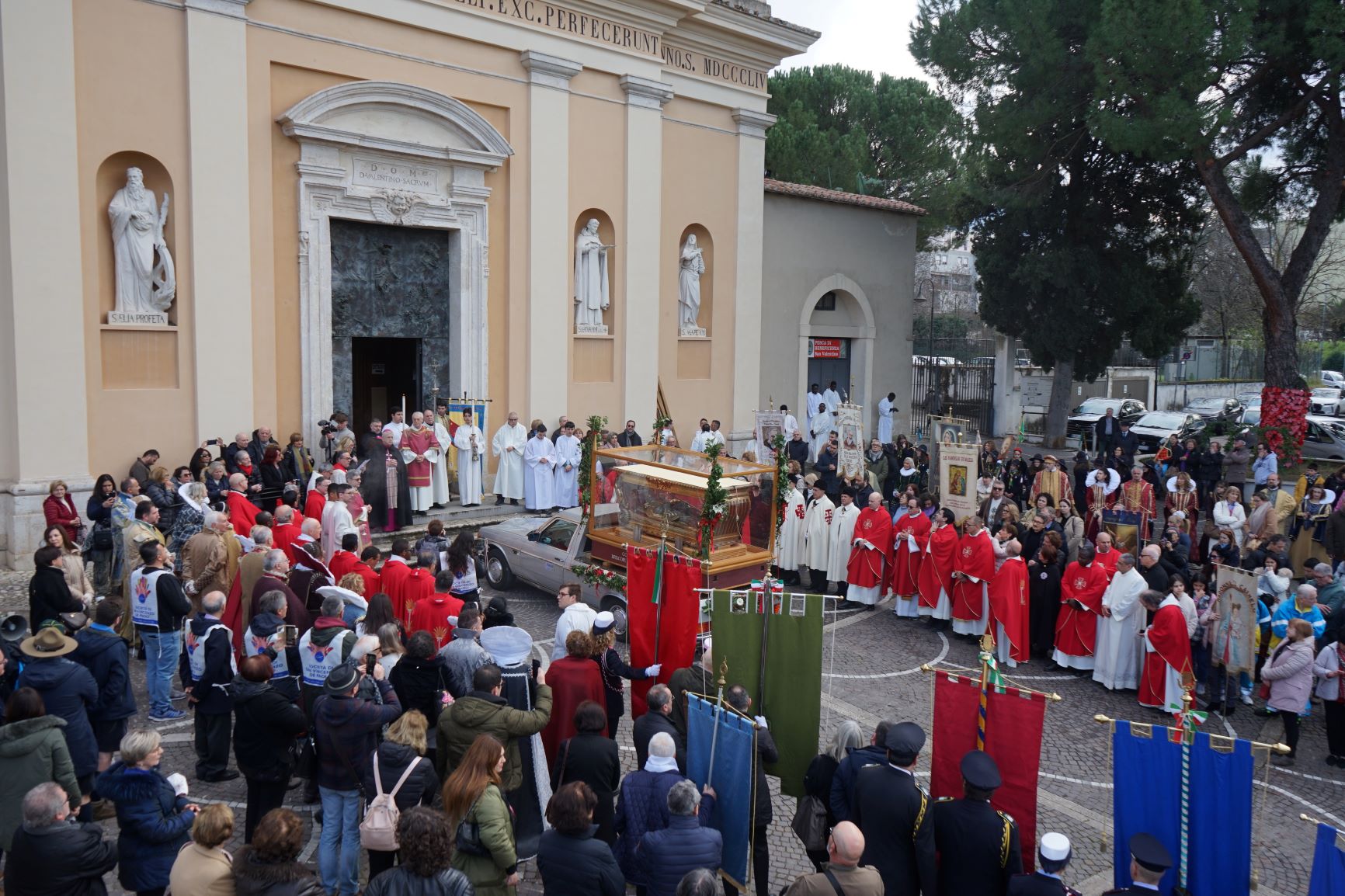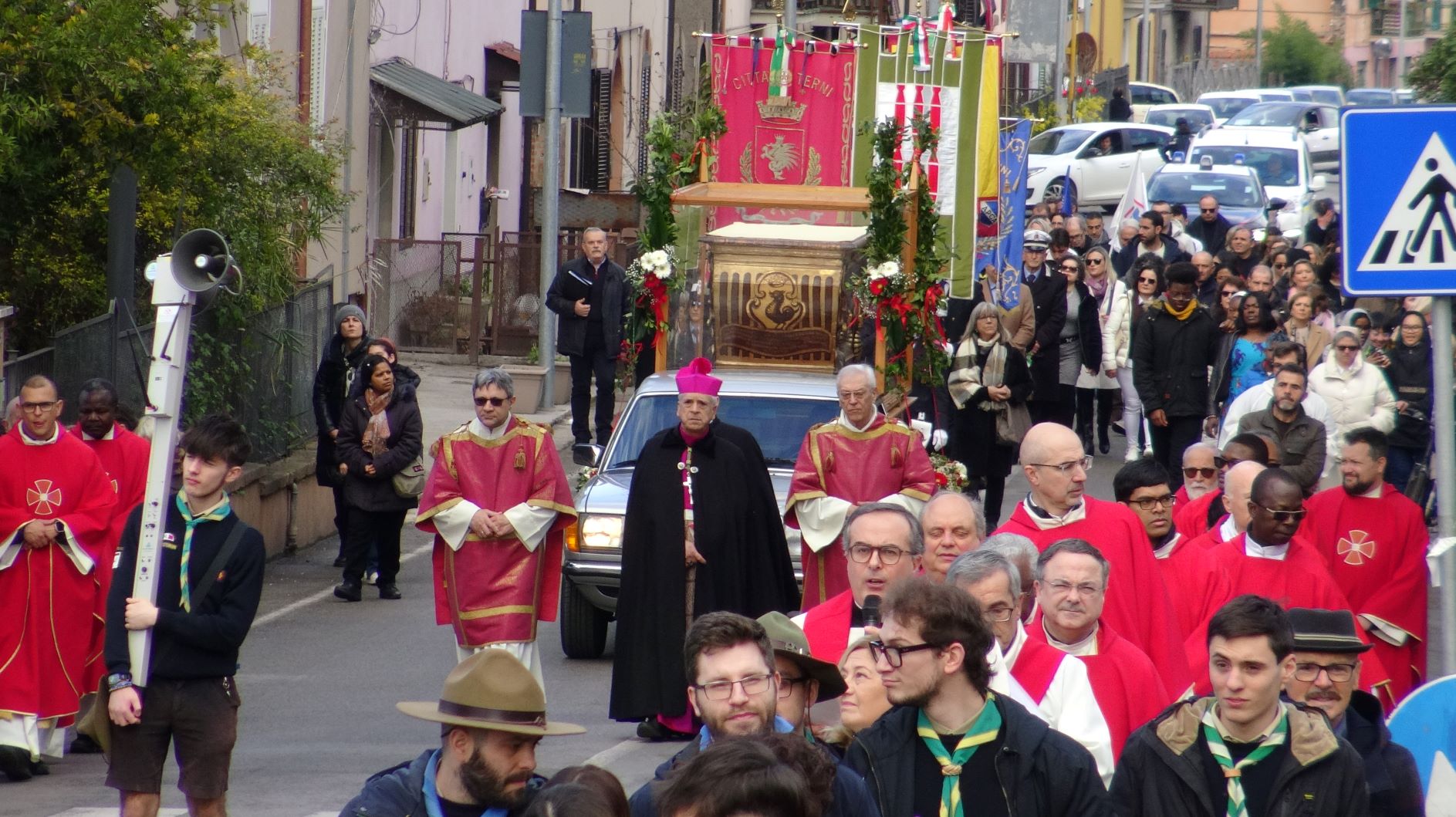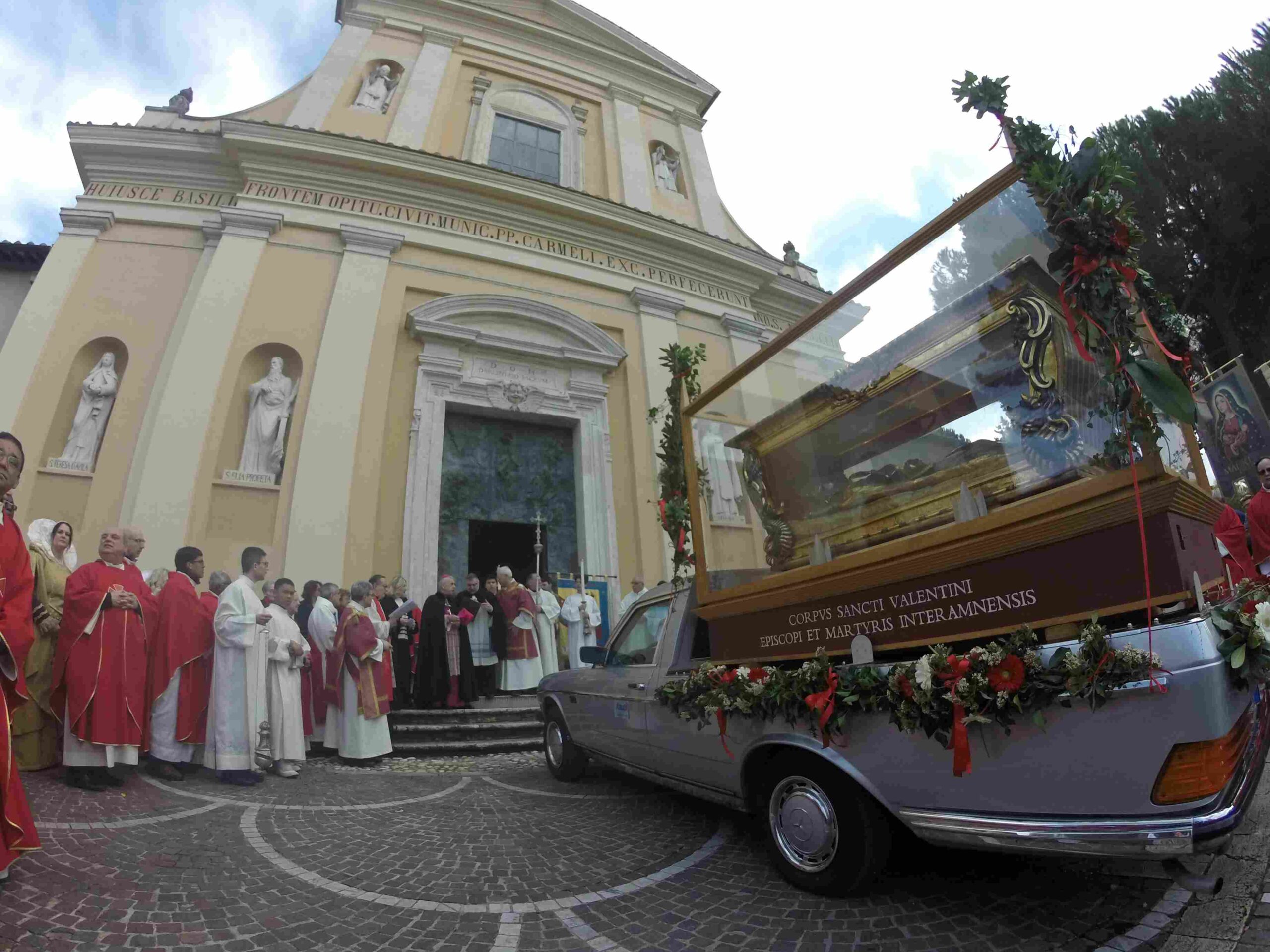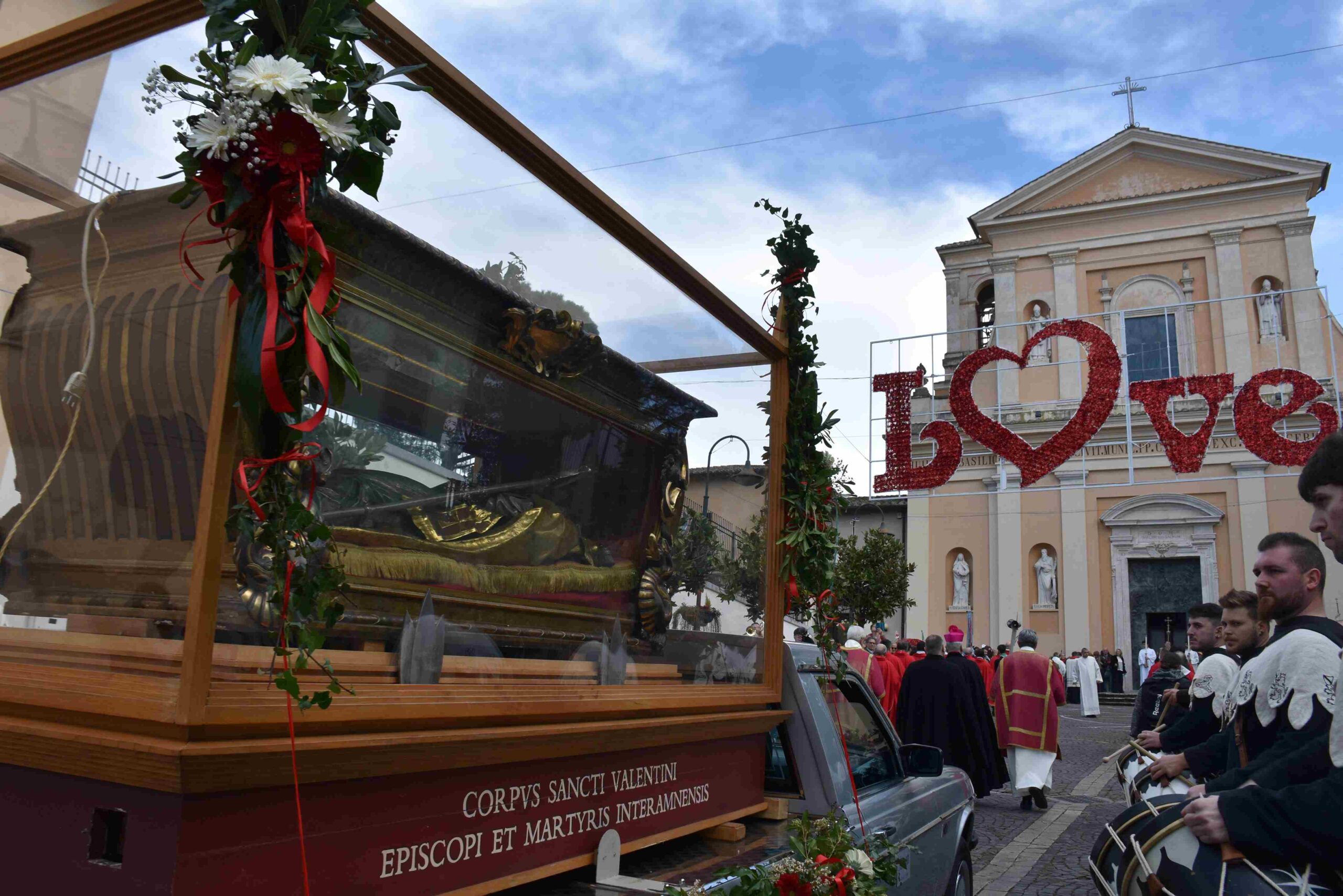La processione è stata accompagnata dai gonfaloni del Comune, Regione e Provincia e da quelli delle confraternite, insieme ai rappresentanti di movimenti e associazioni diocesane, dalle istituzioni civili e militari presenti alla celebrazione del pontificale, dai figuranti in abiti storici del 1600 e dai tamburini e musici del terziere di Mezule di Narni. Sul sagrato c’è stato la preghiera del presidente dell’Azione Cattolica diocesana Rita Pileri: «San Valentino facci tornare al cuore delle cose! Rendi questa città capace di guardare con amore verso l’altro, verso le vie e le piazze perché siamo capaci di usarle con il rispetto con il quale trattiamo le nostre cose più importanti, quelle che vorremmo lasciare ai nostri figli. Fa in modo che questa città sia ancora capace di promuovere la cultura dello scambio, dell’ascolto e del dialogo, ne abbiamo bisogno per tornare a guardare al futuro, per non ripiegarci su noi stessi, per promuovere la partecipazione attiva per la ricerca del bene comune e della pace». IL TESTO INTEGRALE DELLA PREGHIERA