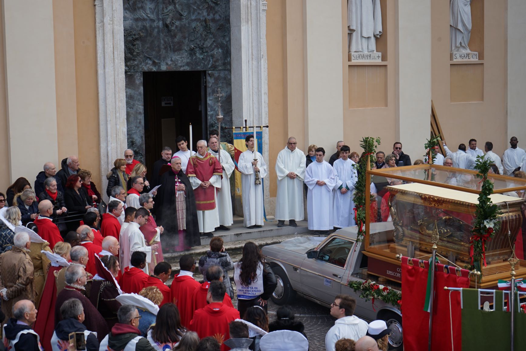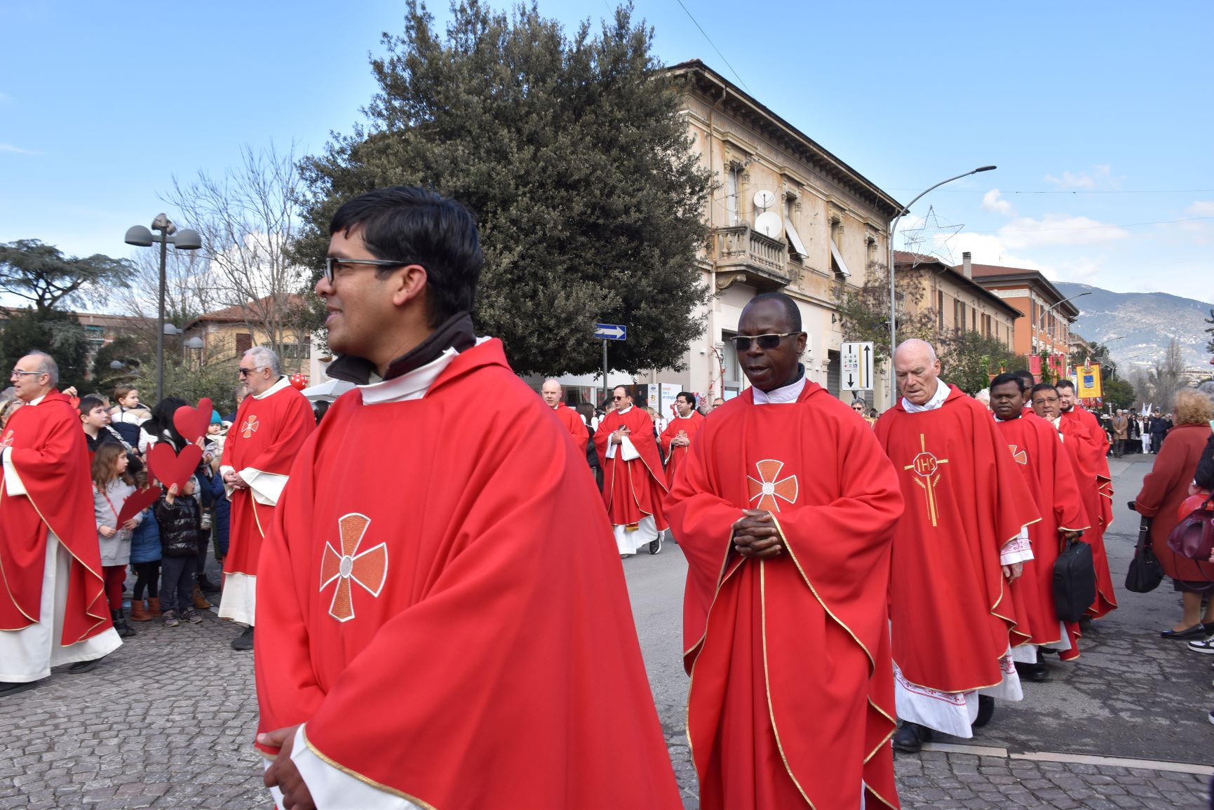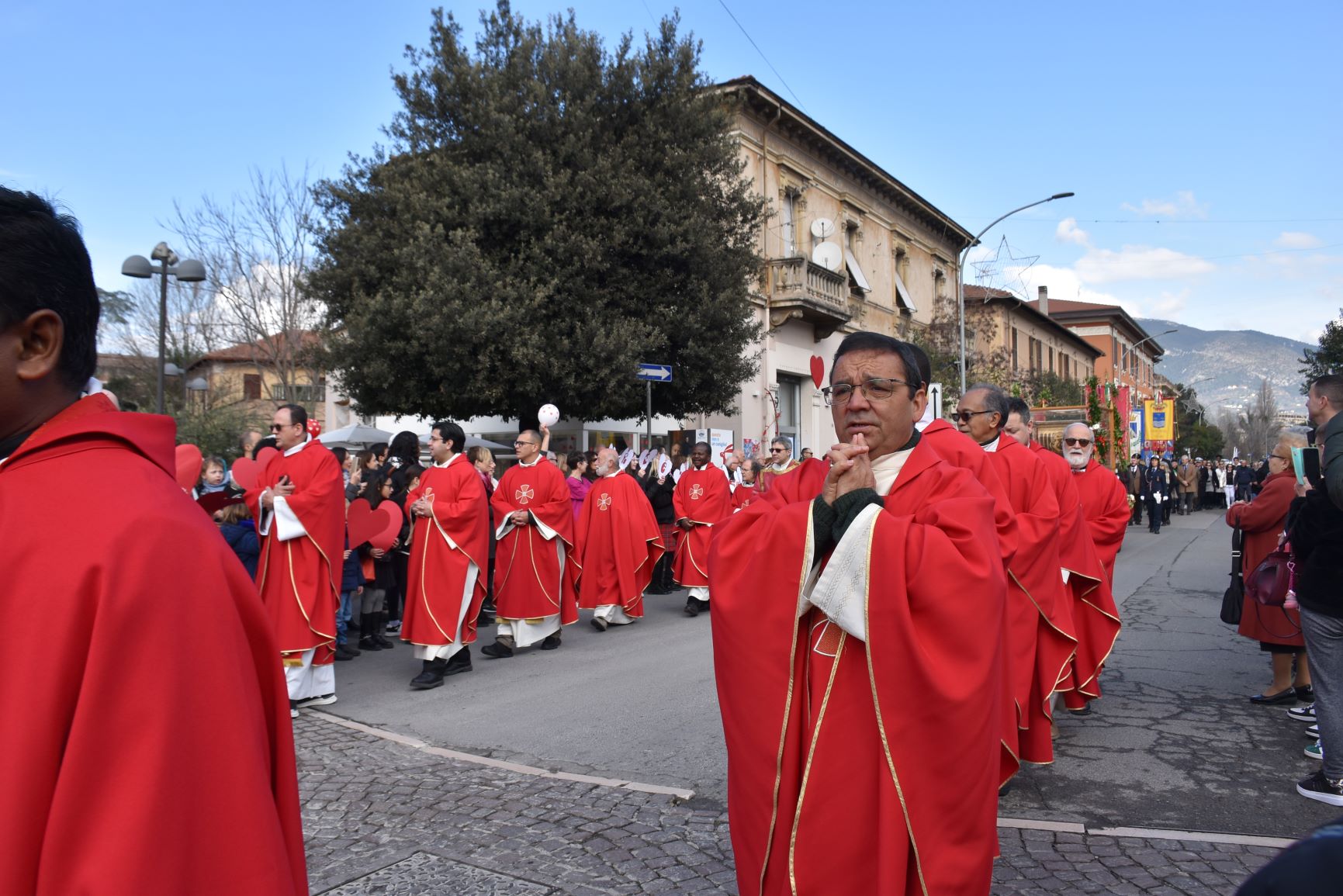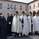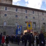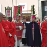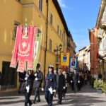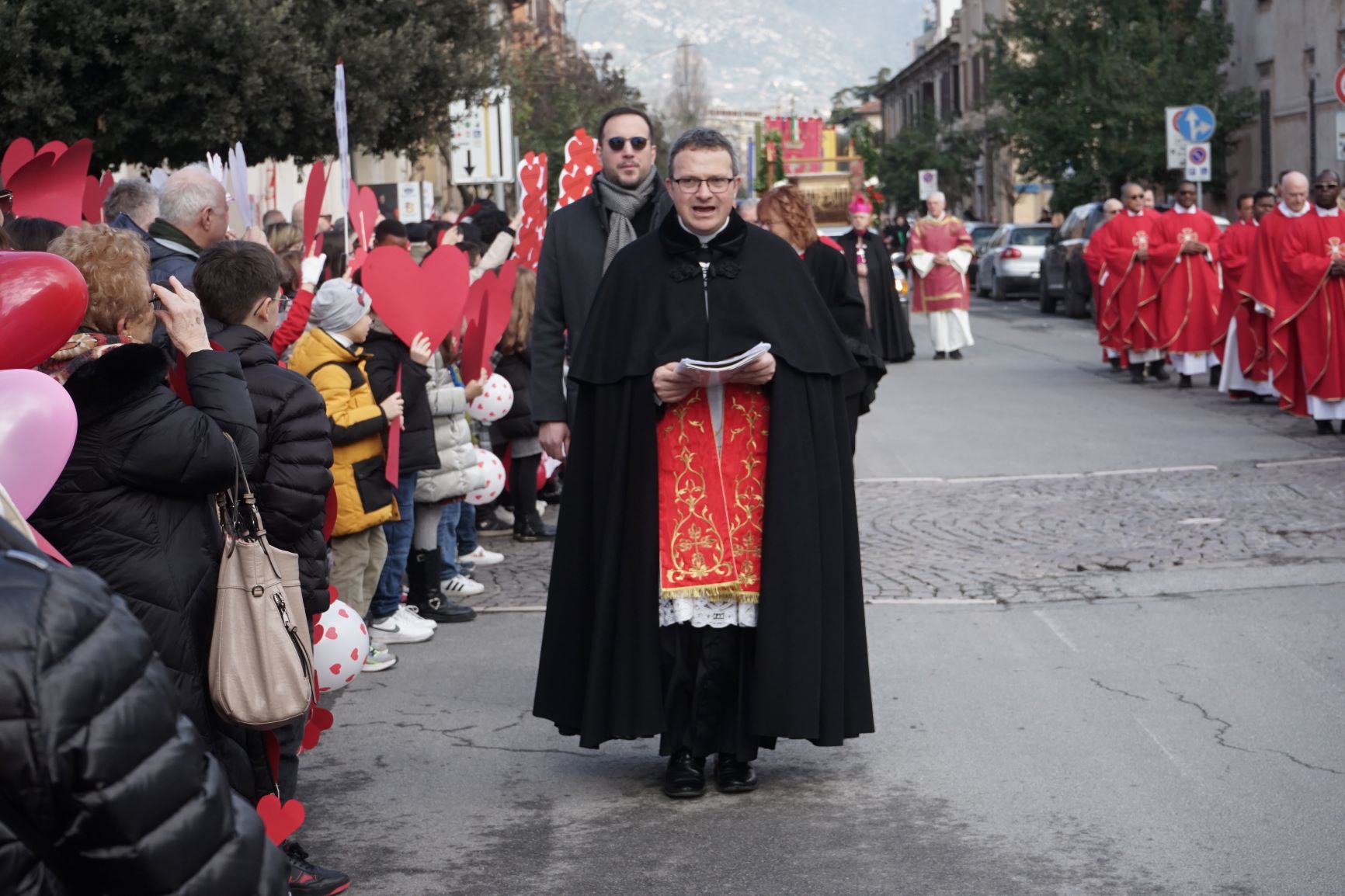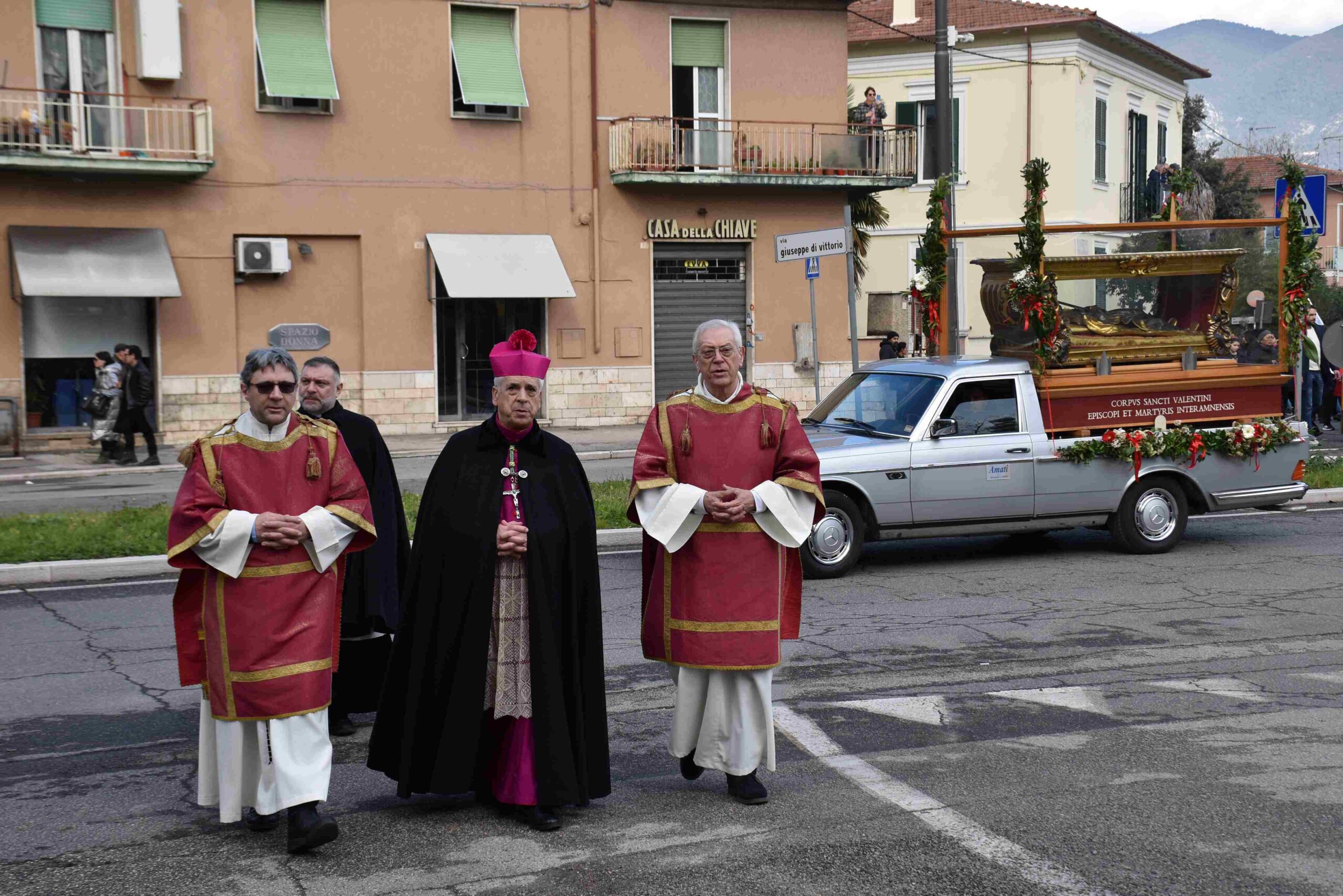 La processione è stata accompagnata dai gonfaloni del Comune, Regione e Provincia e da quelli delle confraternite, insieme ai rappresentanti di movimenti e associazioni diocesane, dalle istituzioni civili e militari presenti alla celebrazione del pontificale, dai figuranti in abiti storici del 1600 e dai tamburini e musici del terziere di Mezule di Narni. Sul sagrato c’è stato la preghiera del presidente dell’Azione Cattolica diocesana Rita Pileri: «San Valentino facci tornare al cuore delle cose! Rendi questa città capace di guardare con amore verso l’altro, verso le vie e le piazze perché siamo capaci di usarle con il rispetto con il quale trattiamo le nostre cose più importanti, quelle che vorremmo lasciare ai nostri figli. Fa in modo che questa città sia ancora capace di promuovere la cultura dello scambio, dell’ascolto e del dialogo, ne abbiamo bisogno per tornare a guardare al futuro, per non ripiegarci su noi stessi, per promuovere la partecipazione attiva per la ricerca del bene comune e della pace». IL TESTO INTEGRALE DELLA PREGHIERA