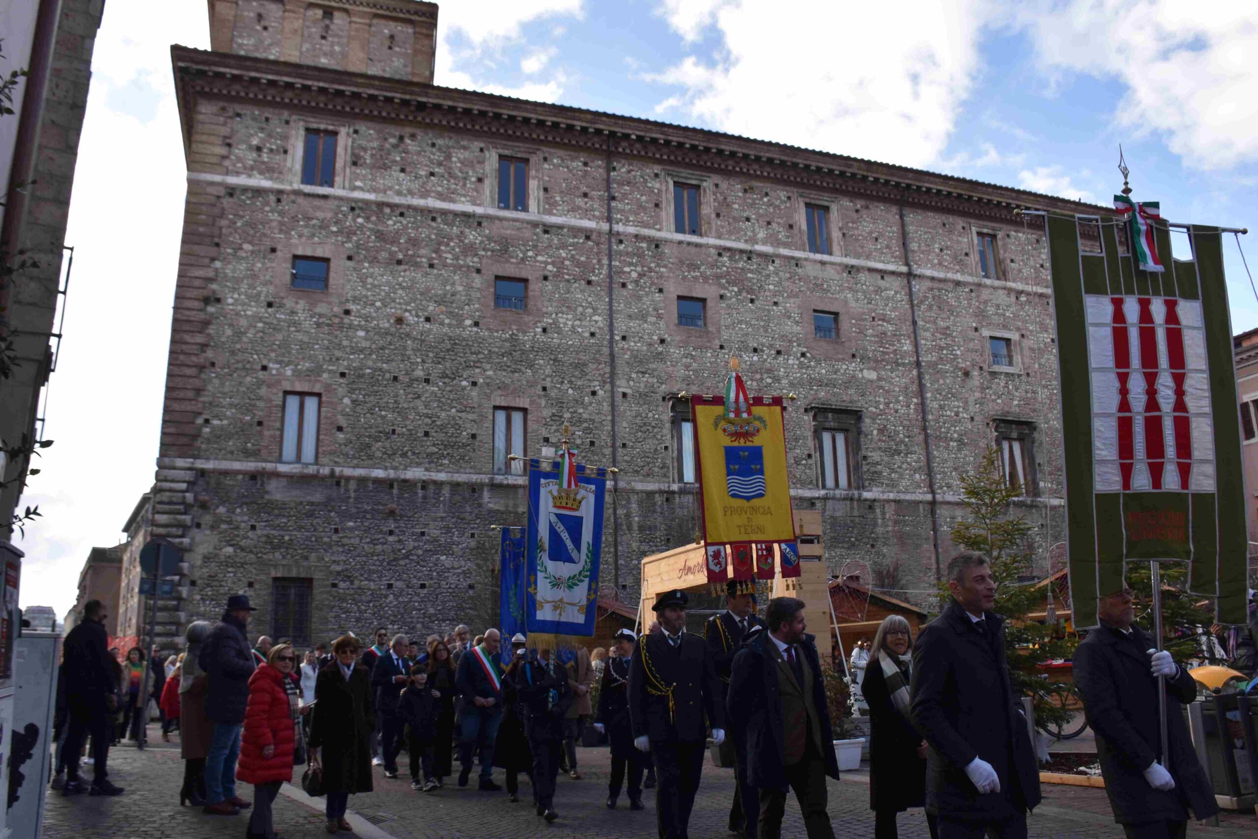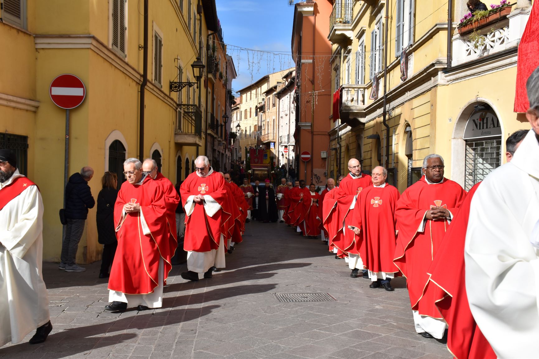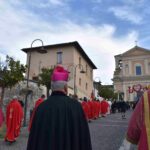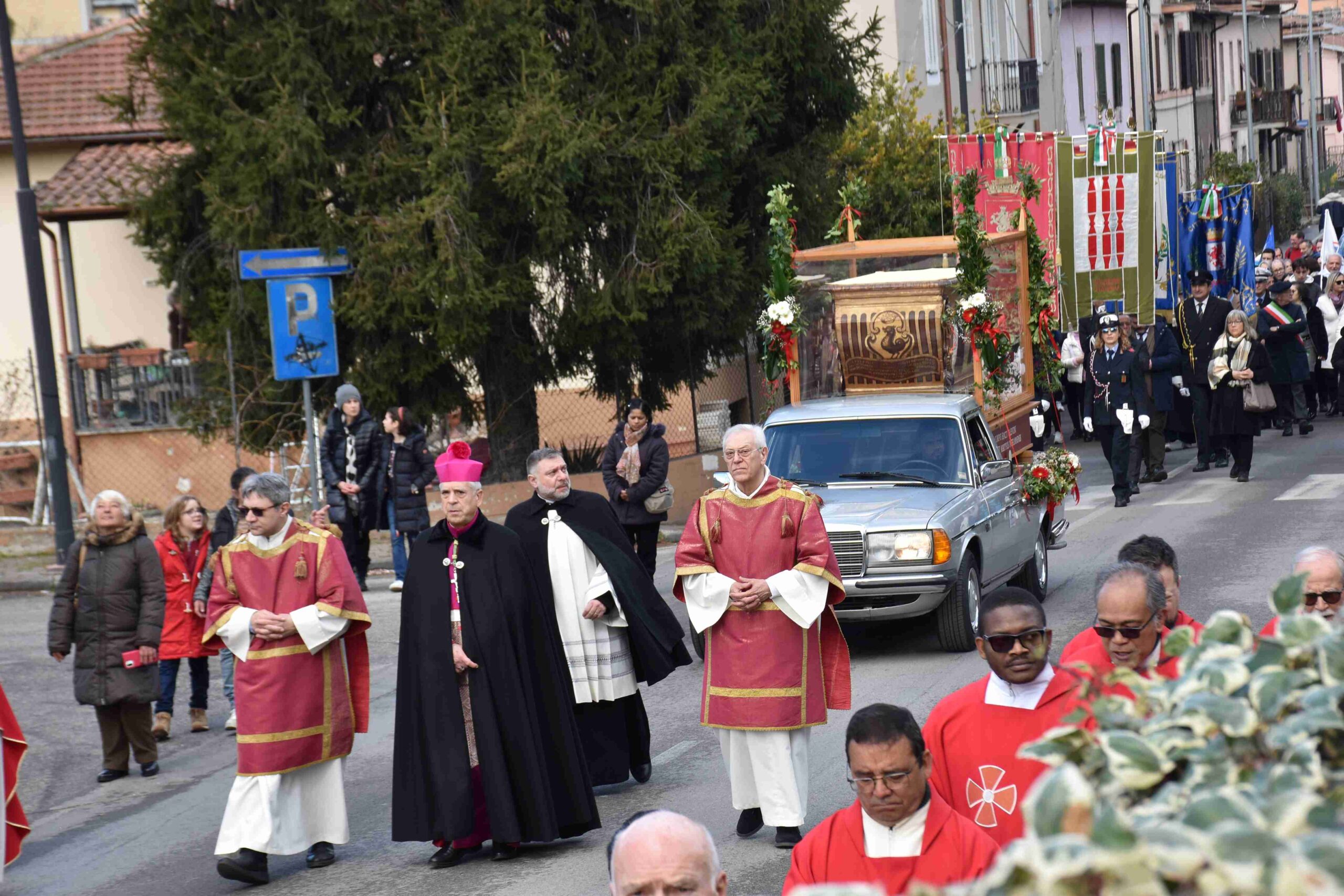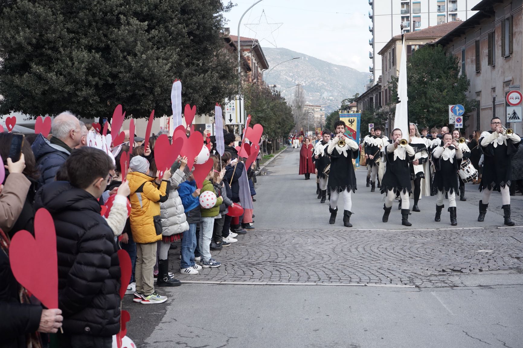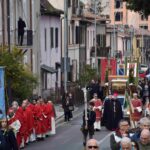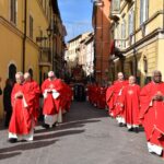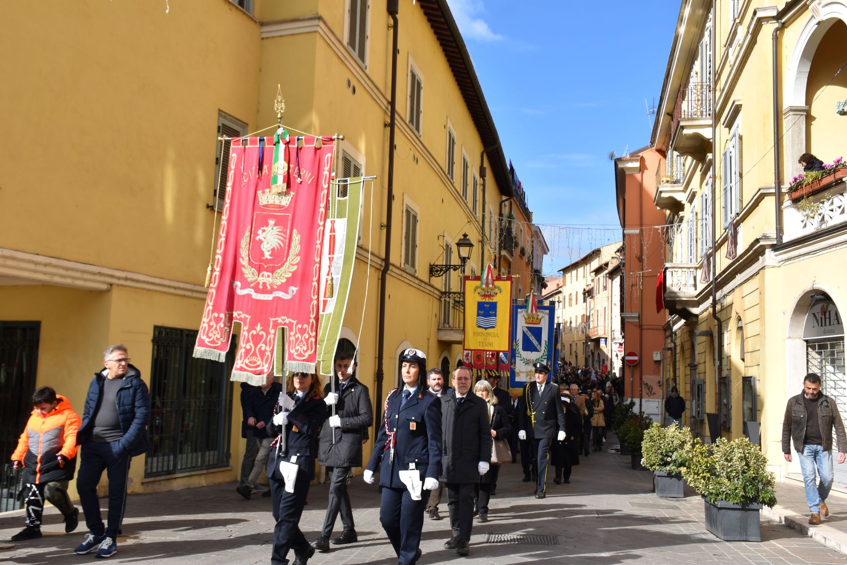 La processione è stata accompagnata dai gonfaloni del Comune, Regione e Provincia e da quelli delle confraternite, insieme ai rappresentanti di movimenti e associazioni diocesane, dalle istituzioni civili e militari presenti alla celebrazione del pontificale, dai figuranti in abiti storici del 1600 e dai tamburini e musici del terziere di Mezule di Narni. Sul sagrato c’è stato la preghiera del presidente dell’Azione Cattolica diocesana Rita Pileri: «San Valentino facci tornare al cuore delle cose! Rendi questa città capace di guardare con amore verso l’altro, verso le vie e le piazze perché siamo capaci di usarle con il rispetto con il quale trattiamo le nostre cose più importanti, quelle che vorremmo lasciare ai nostri figli. Fa in modo che questa città sia ancora capace di promuovere la cultura dello scambio, dell’ascolto e del dialogo, ne abbiamo bisogno per tornare a guardare al futuro, per non ripiegarci su noi stessi, per promuovere la partecipazione attiva per la ricerca del bene comune e della pace». IL TESTO INTEGRALE DELLA PREGHIERA
