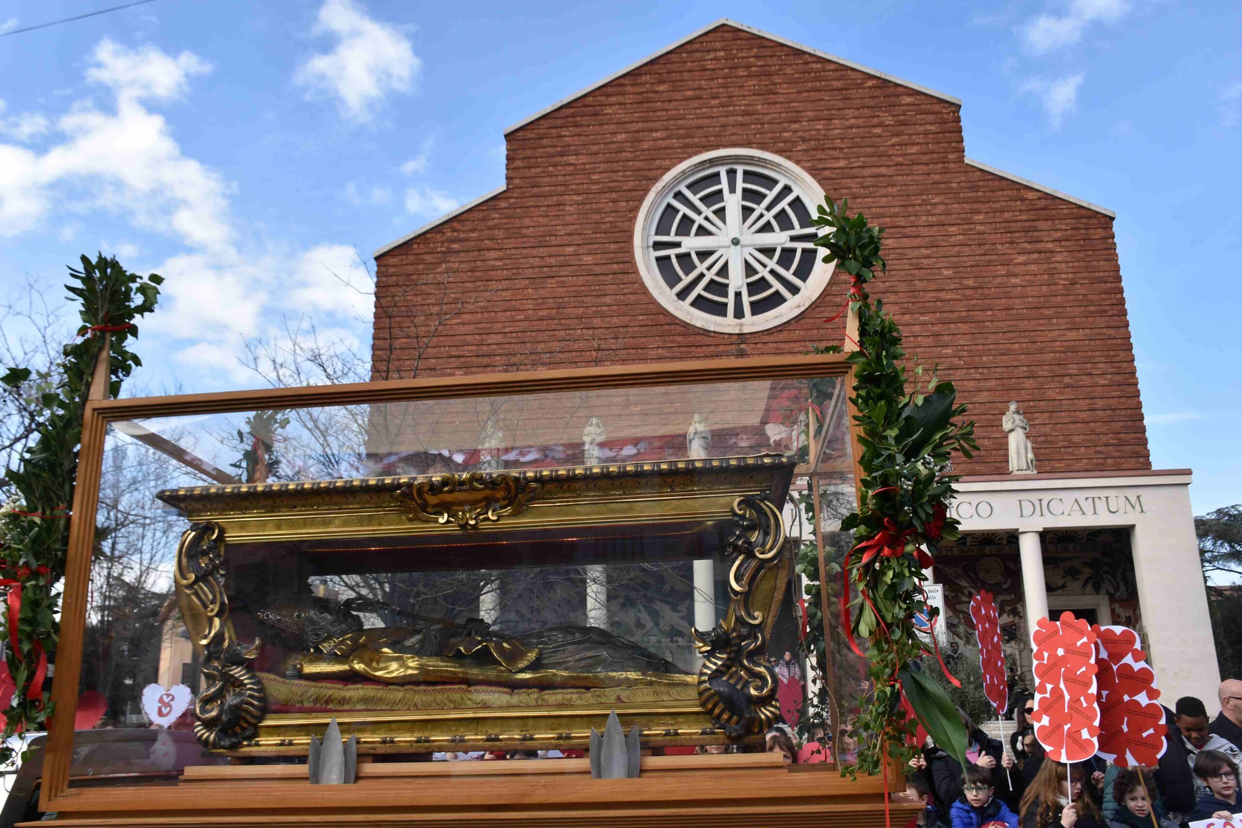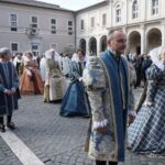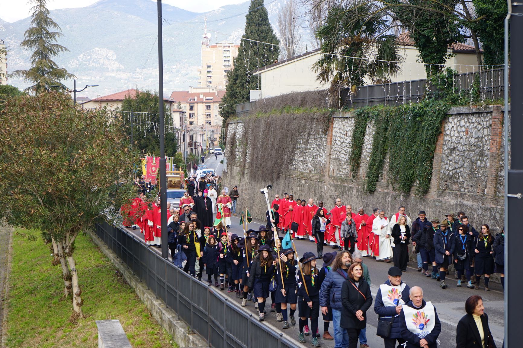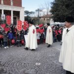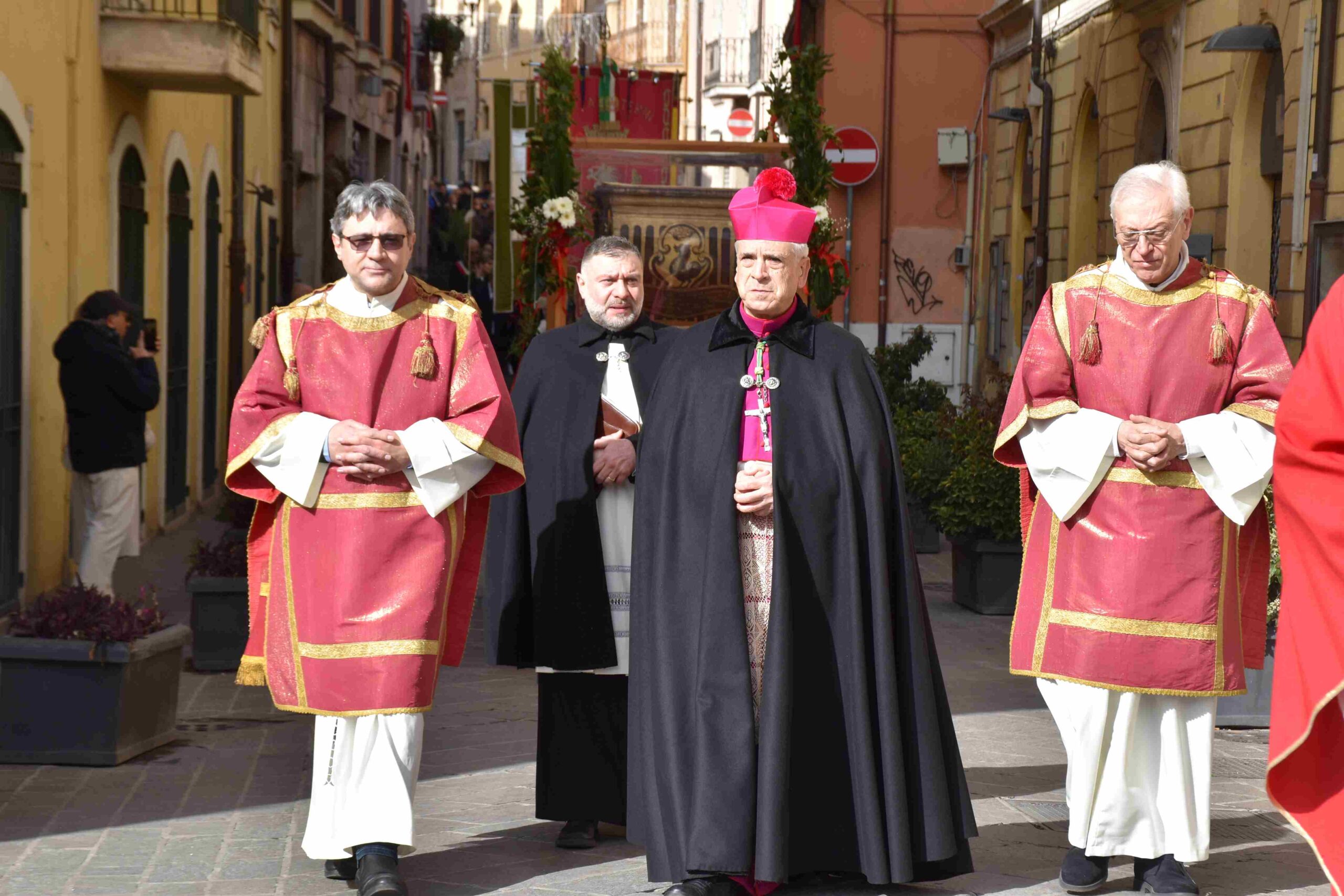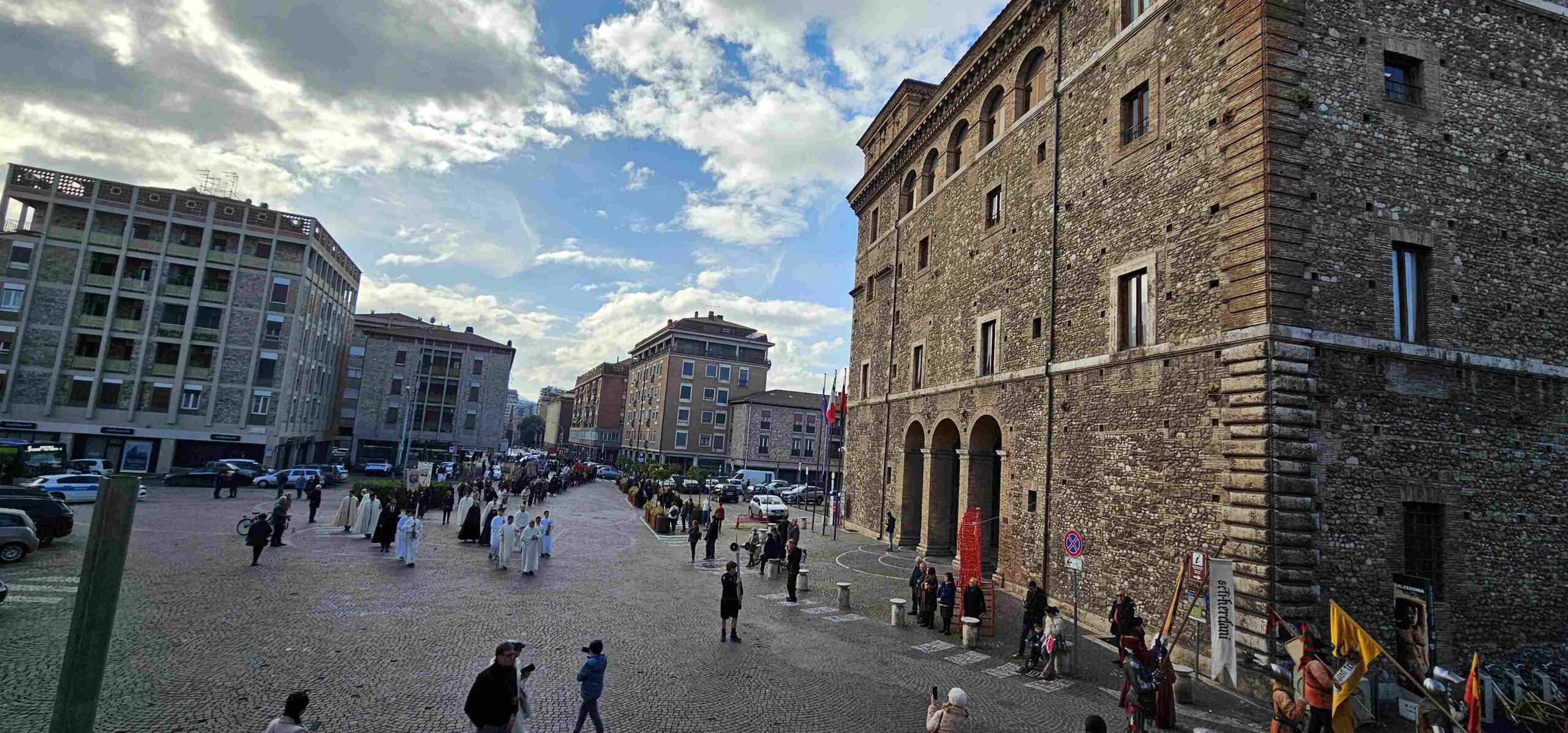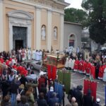 La processione è stata accompagnata dai gonfaloni del Comune, Regione e Provincia e da quelli delle confraternite, insieme ai rappresentanti di movimenti e associazioni diocesane, dalle istituzioni civili e militari presenti alla celebrazione del pontificale, dai figuranti in abiti storici del 1600 e dai tamburini e musici del terziere di Mezule di Narni. Sul sagrato c’è stato la preghiera del presidente dell’Azione Cattolica diocesana Rita Pileri: «San Valentino facci tornare al cuore delle cose! Rendi questa città capace di guardare con amore verso l’altro, verso le vie e le piazze perché siamo capaci di usarle con il rispetto con il quale trattiamo le nostre cose più importanti, quelle che vorremmo lasciare ai nostri figli. Fa in modo che questa città sia ancora capace di promuovere la cultura dello scambio, dell’ascolto e del dialogo, ne abbiamo bisogno per tornare a guardare al futuro, per non ripiegarci su noi stessi, per promuovere la partecipazione attiva per la ricerca del bene comune e della pace». IL TESTO INTEGRALE DELLA PREGHIERA
