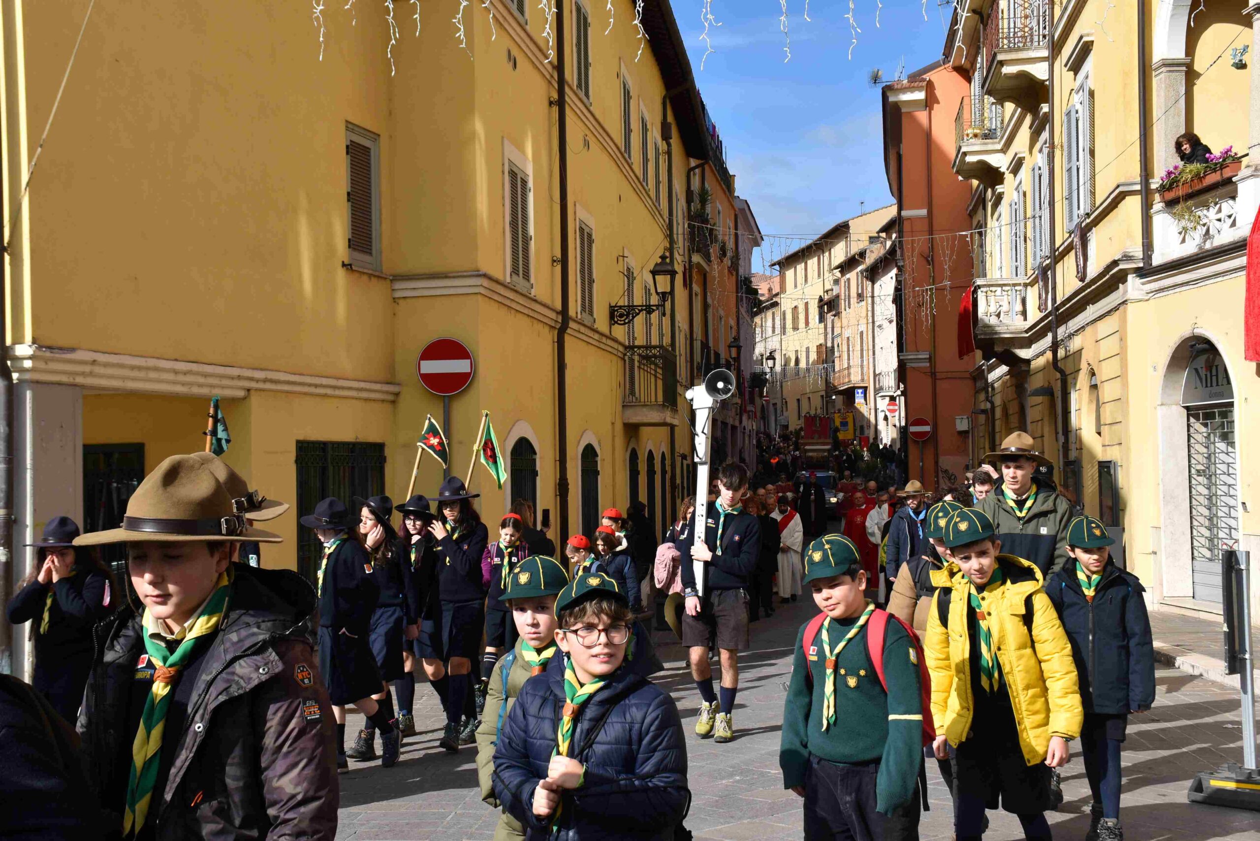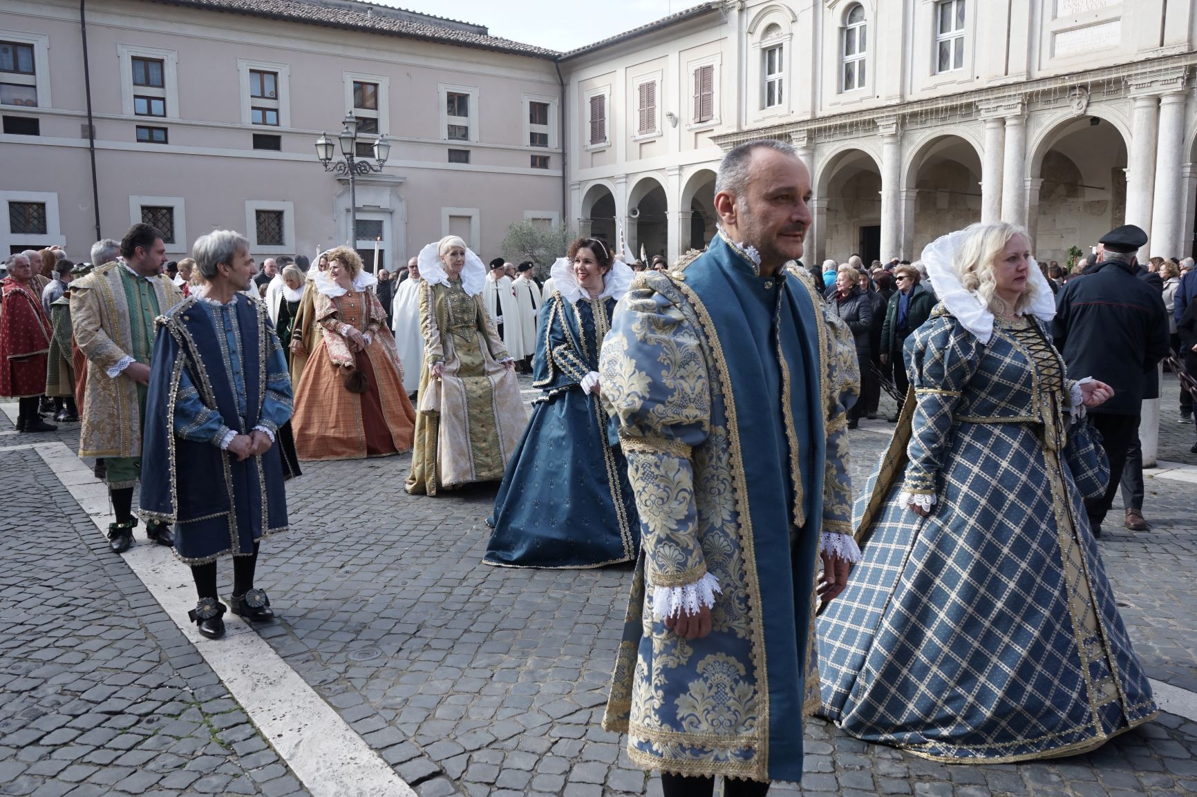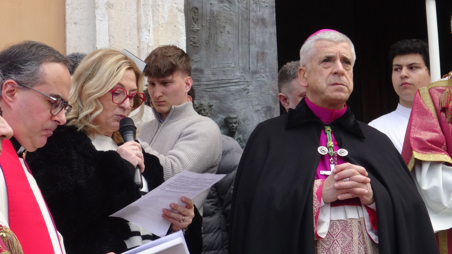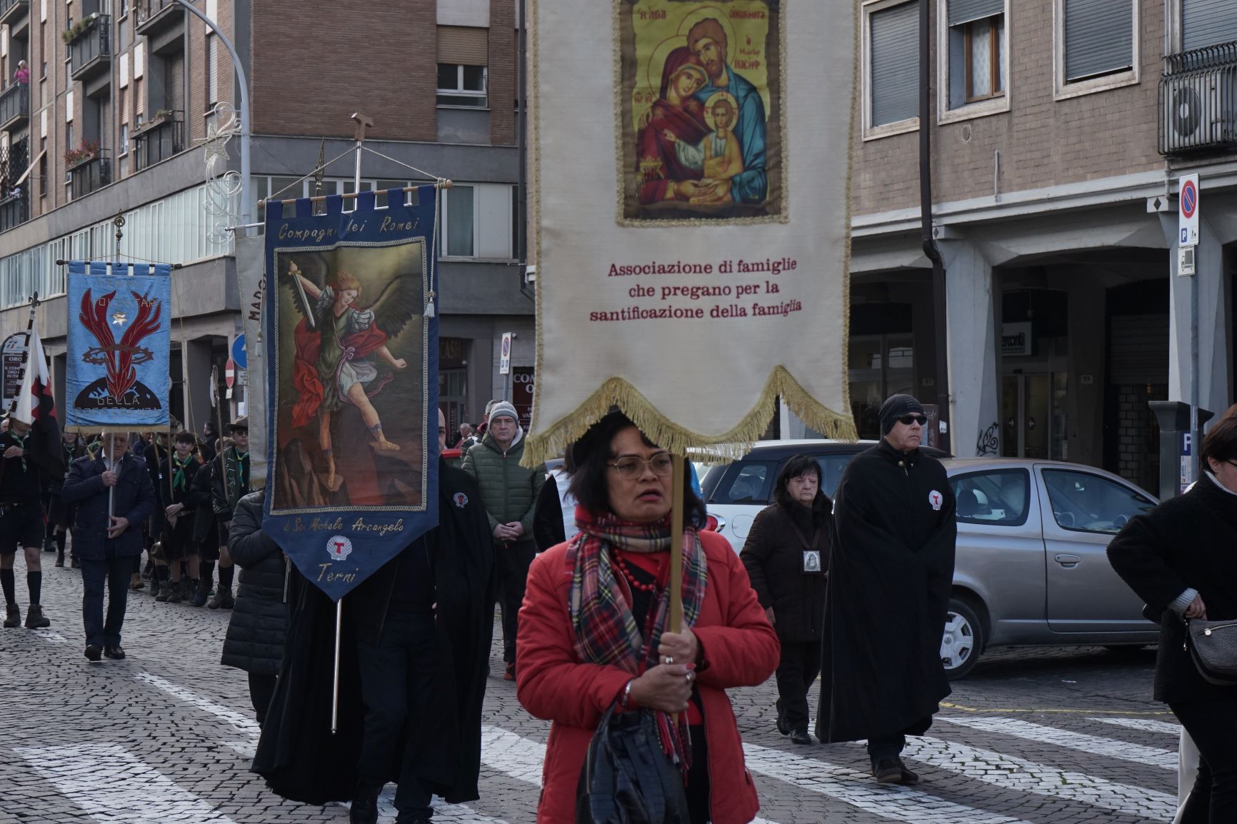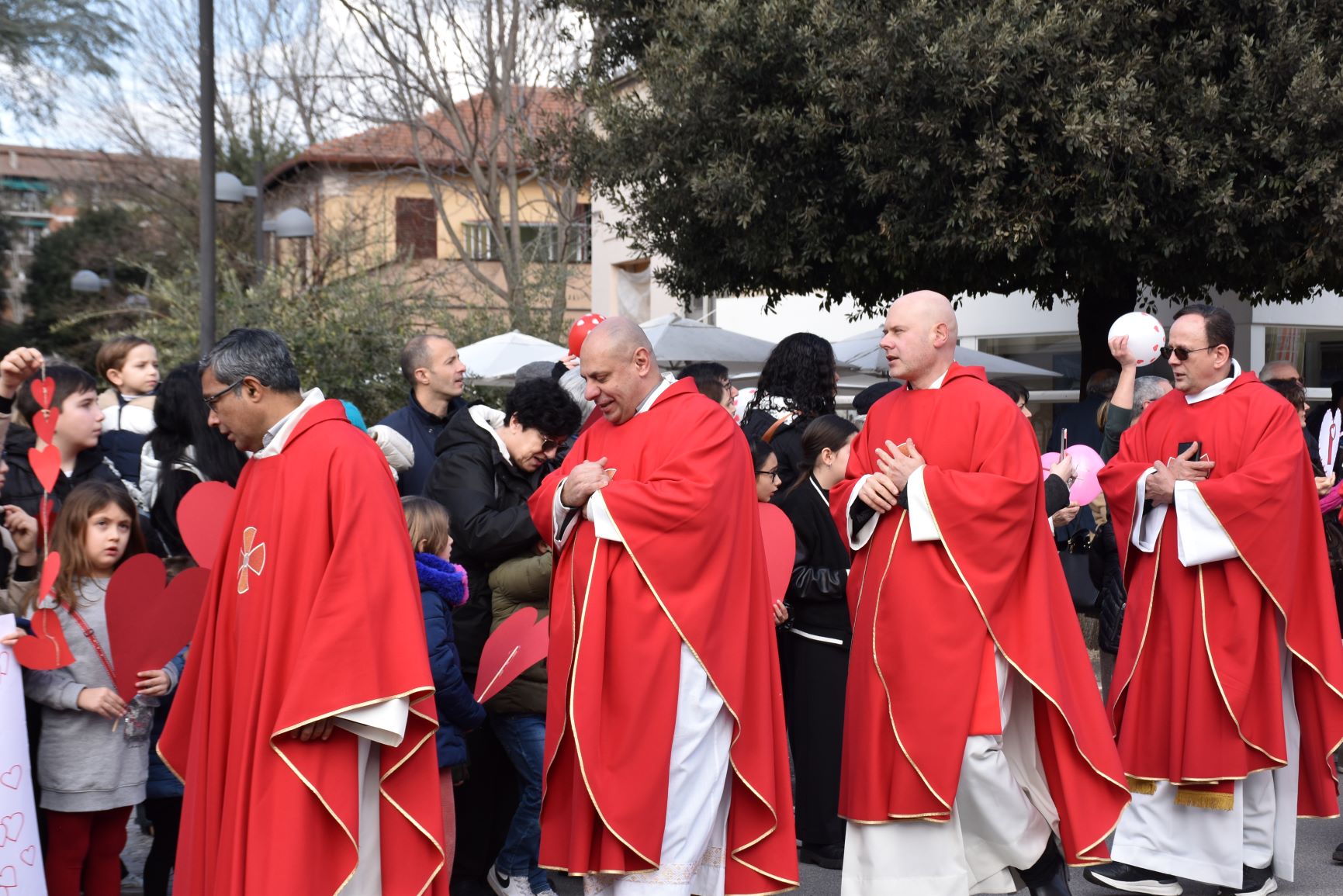 La processione è stata accompagnata dai gonfaloni del Comune, Regione e Provincia e da quelli delle confraternite, insieme ai rappresentanti di movimenti e associazioni diocesane, dalle istituzioni civili e militari presenti alla celebrazione del pontificale, dai figuranti in abiti storici del 1600 e dai tamburini e musici del terziere di Mezule di Narni. Sul sagrato c’è stato la preghiera del presidente dell’Azione Cattolica diocesana Rita Pileri: «San Valentino facci tornare al cuore delle cose! Rendi questa città capace di guardare con amore verso l’altro, verso le vie e le piazze perché siamo capaci di usarle con il rispetto con il quale trattiamo le nostre cose più importanti, quelle che vorremmo lasciare ai nostri figli. Fa in modo che questa città sia ancora capace di promuovere la cultura dello scambio, dell’ascolto e del dialogo, ne abbiamo bisogno per tornare a guardare al futuro, per non ripiegarci su noi stessi, per promuovere la partecipazione attiva per la ricerca del bene comune e della pace». IL TESTO INTEGRALE DELLA PREGHIERA