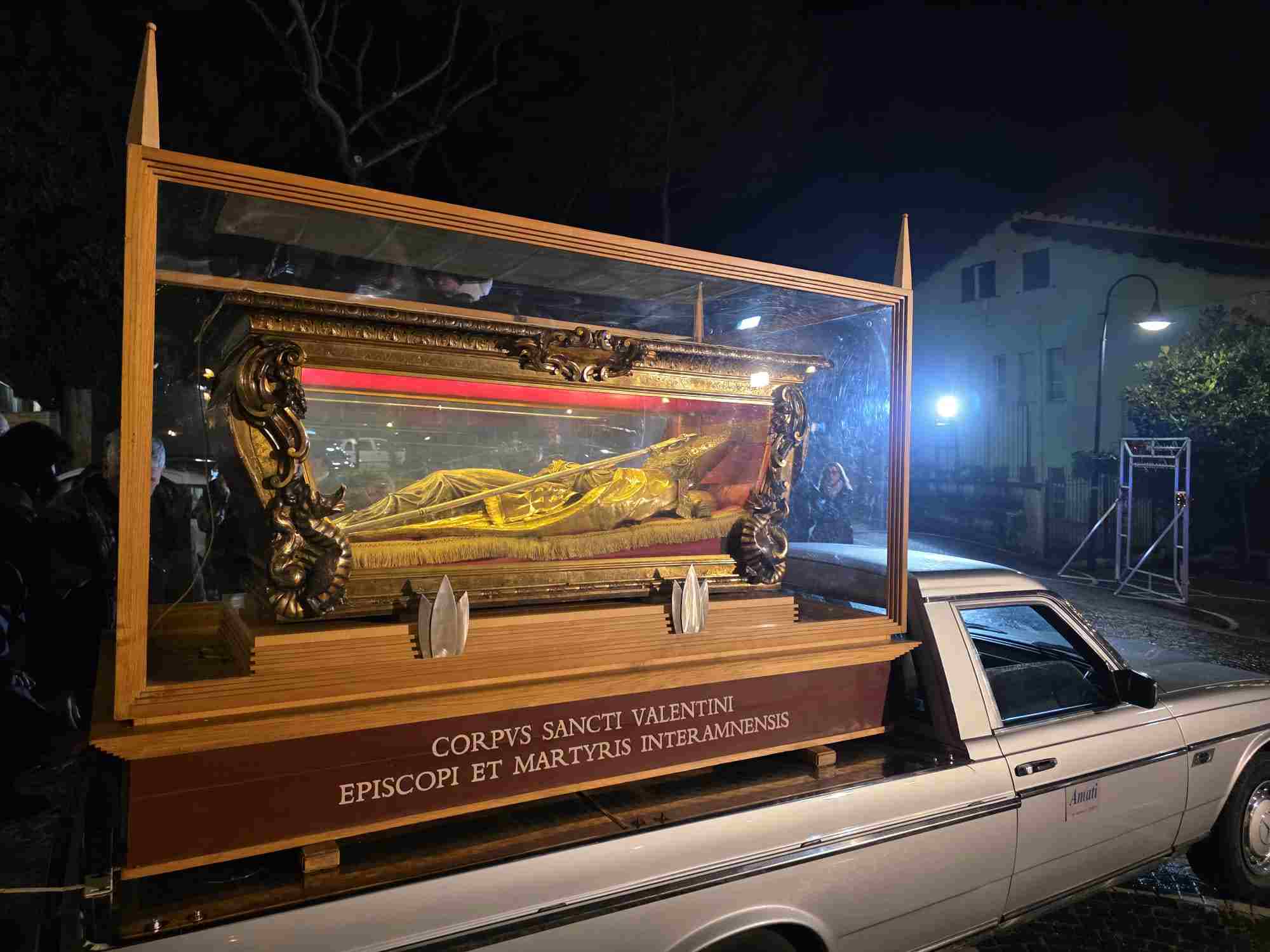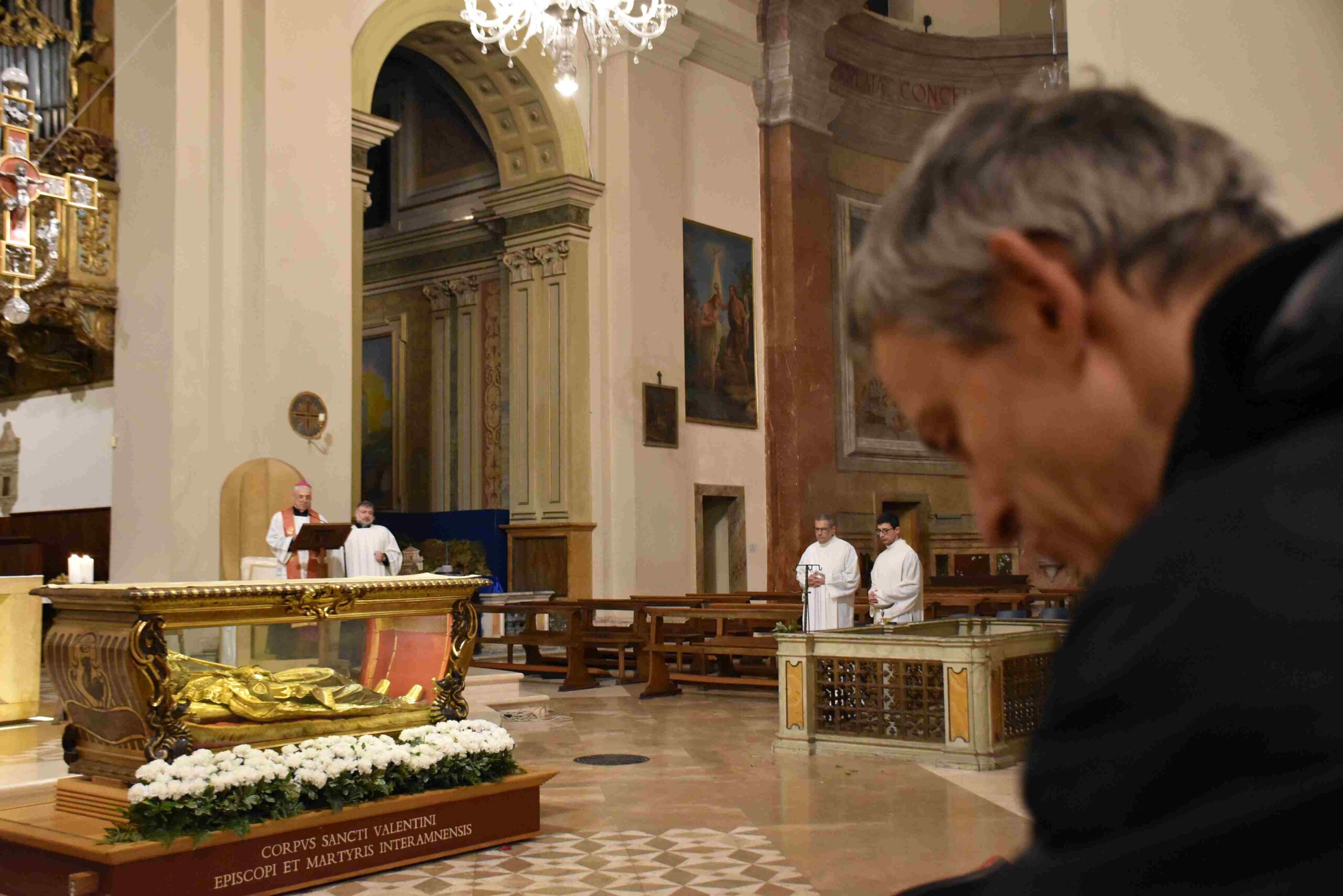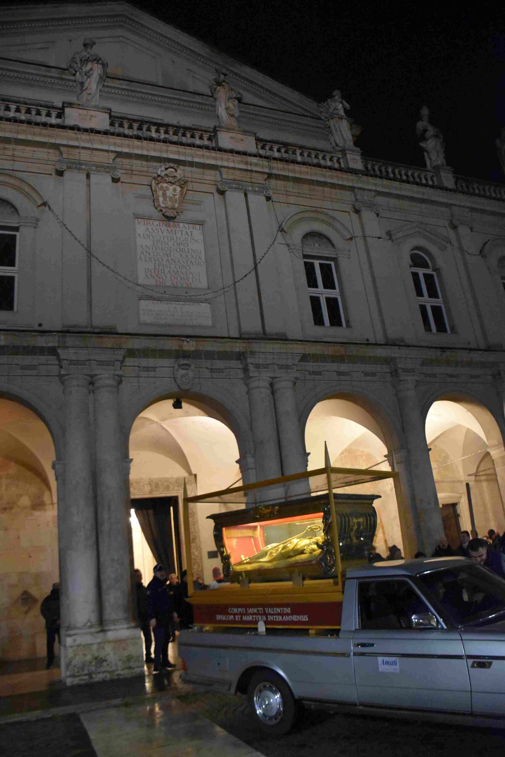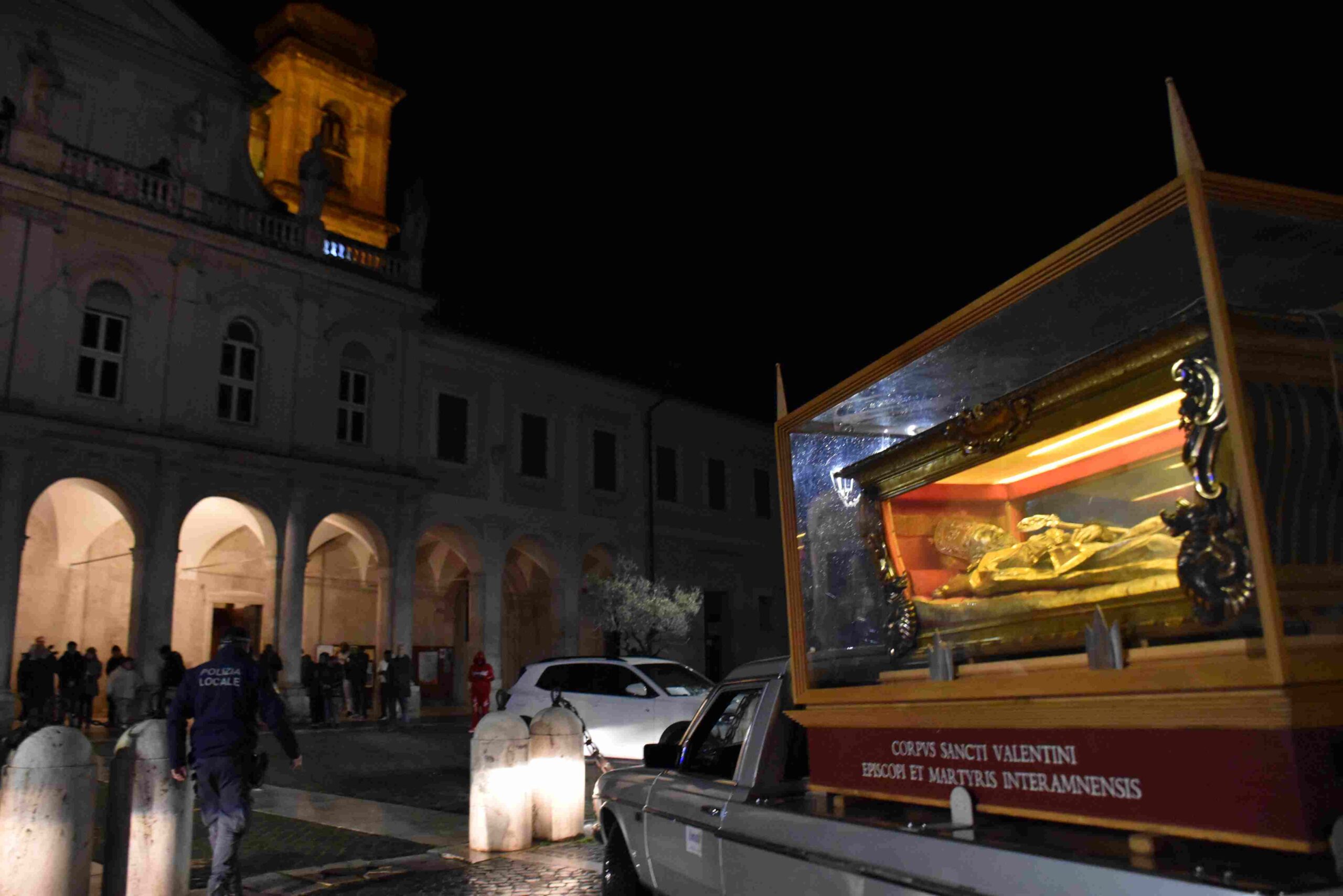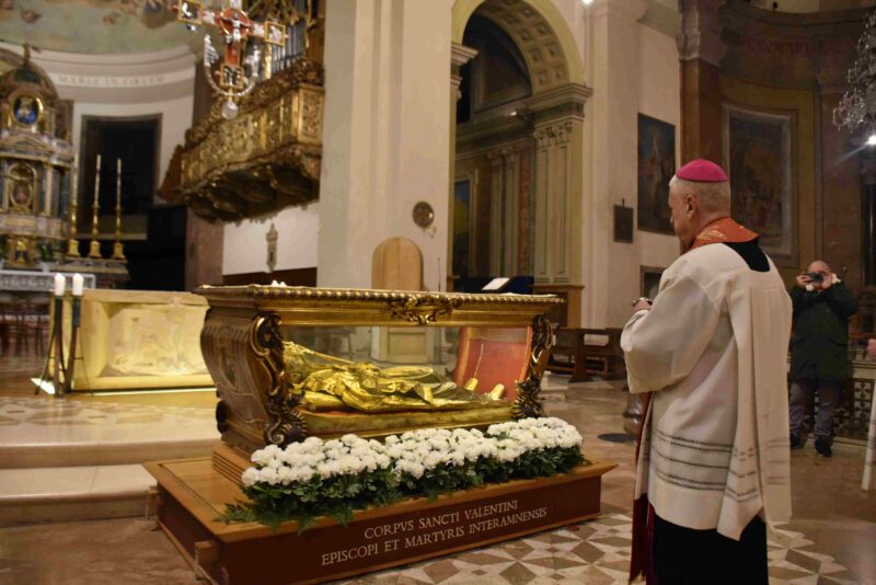 L’urna con le reliquie di San Valentino è arrivata in Cattedrale a Terni nella tarda serata di sabato 14 febbraio, scortata dalle forze dell’ordine e accolta sul sagrato della cattedrale dal vescovo Francesco Antonio Soddu e dal vicario genarale don Salvatore Ferdinandi, dal parroco della Cattedrale don Alessandro Rossini, don Matteo Antonelli, don Marco Decesaris, don Enrico D’Urso e da diversi fedeli. Il vescovo, al canto dell’inno di San Valentino, ha incensato l’urna con le reliquie del Santo. Un breve momento di preghiera e d’invocazione al santo patrono di Terni che si è concluso con la preghiera del Padre Nostro e quindi recitata la preghiera a San Valentino e il vescovo ha impartito la benedizione. E’ seguito un breve momento di preghiera e venerazione personale da parte dei fedeli presenti.