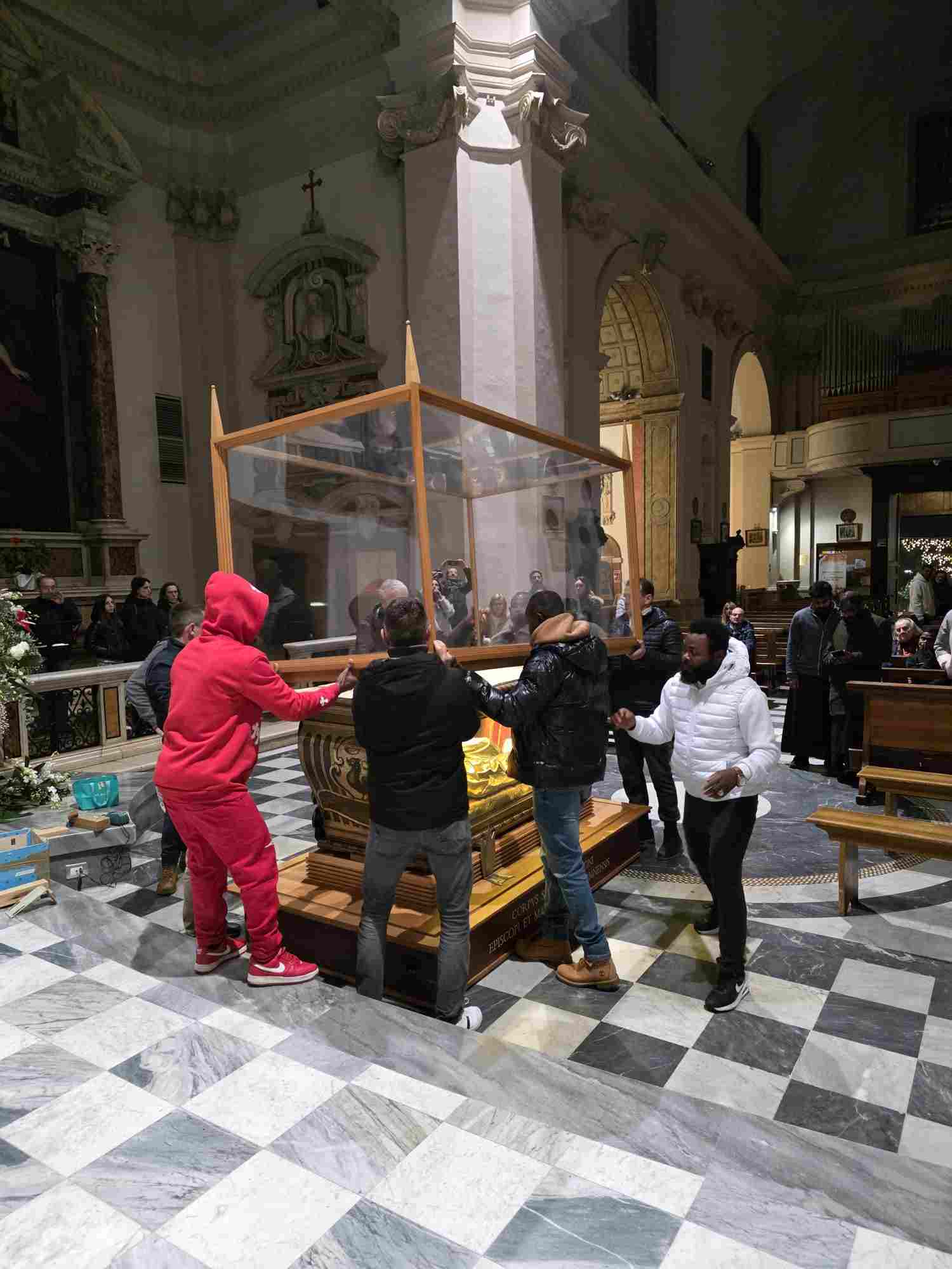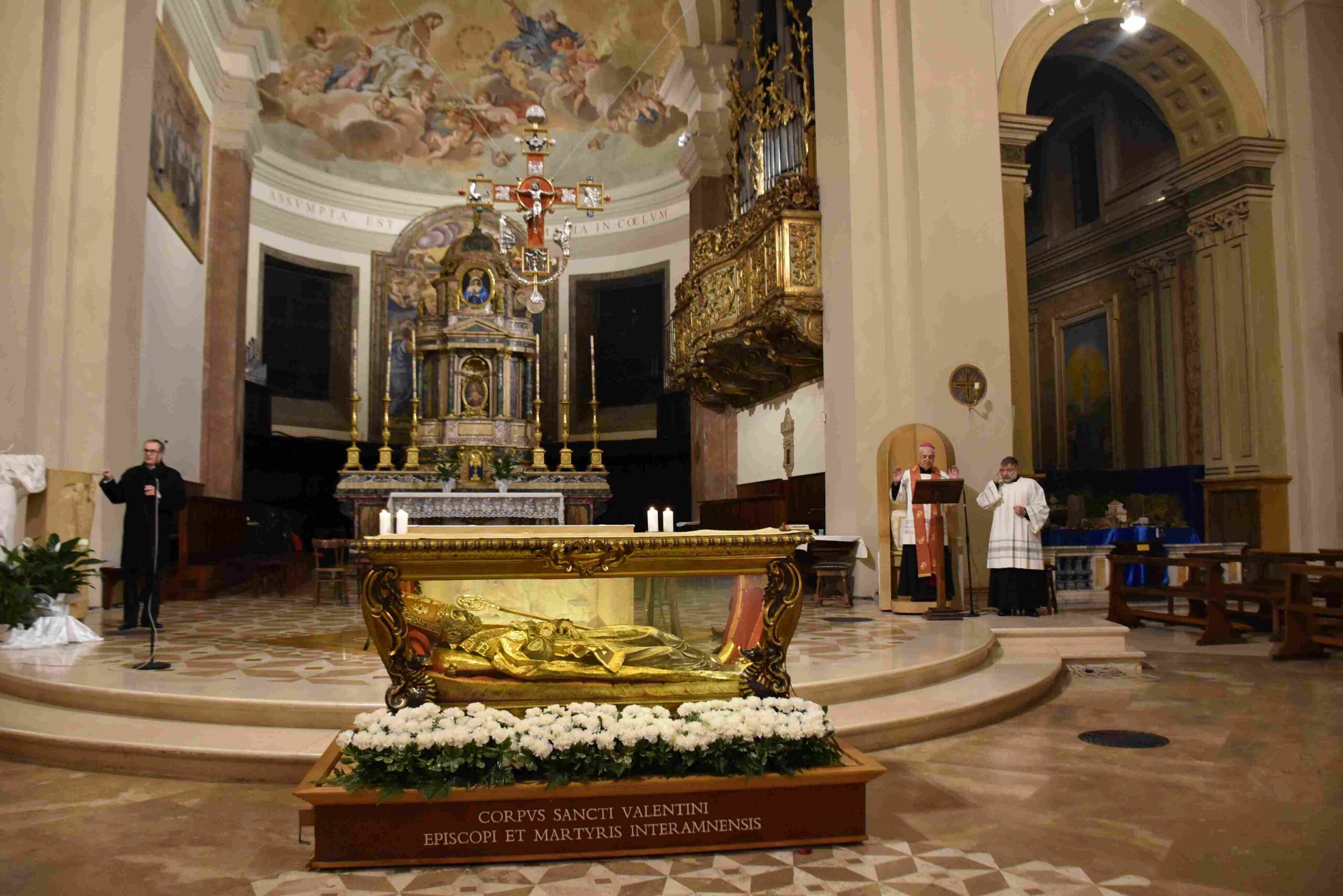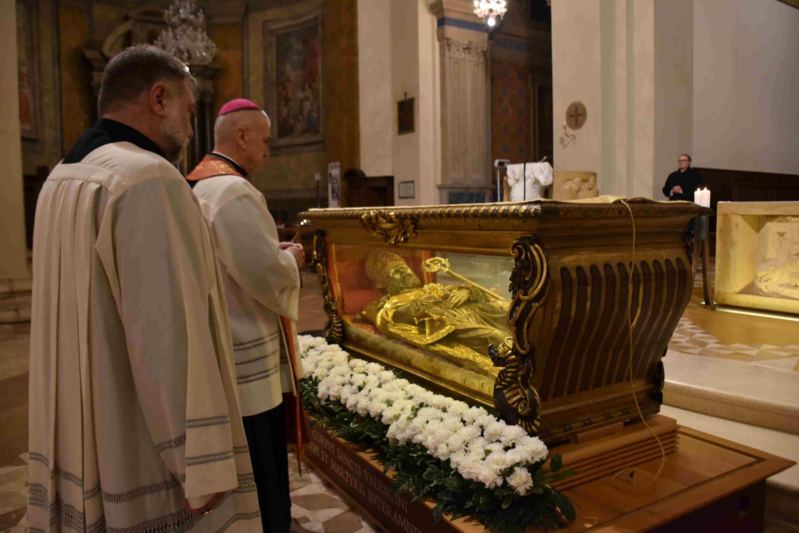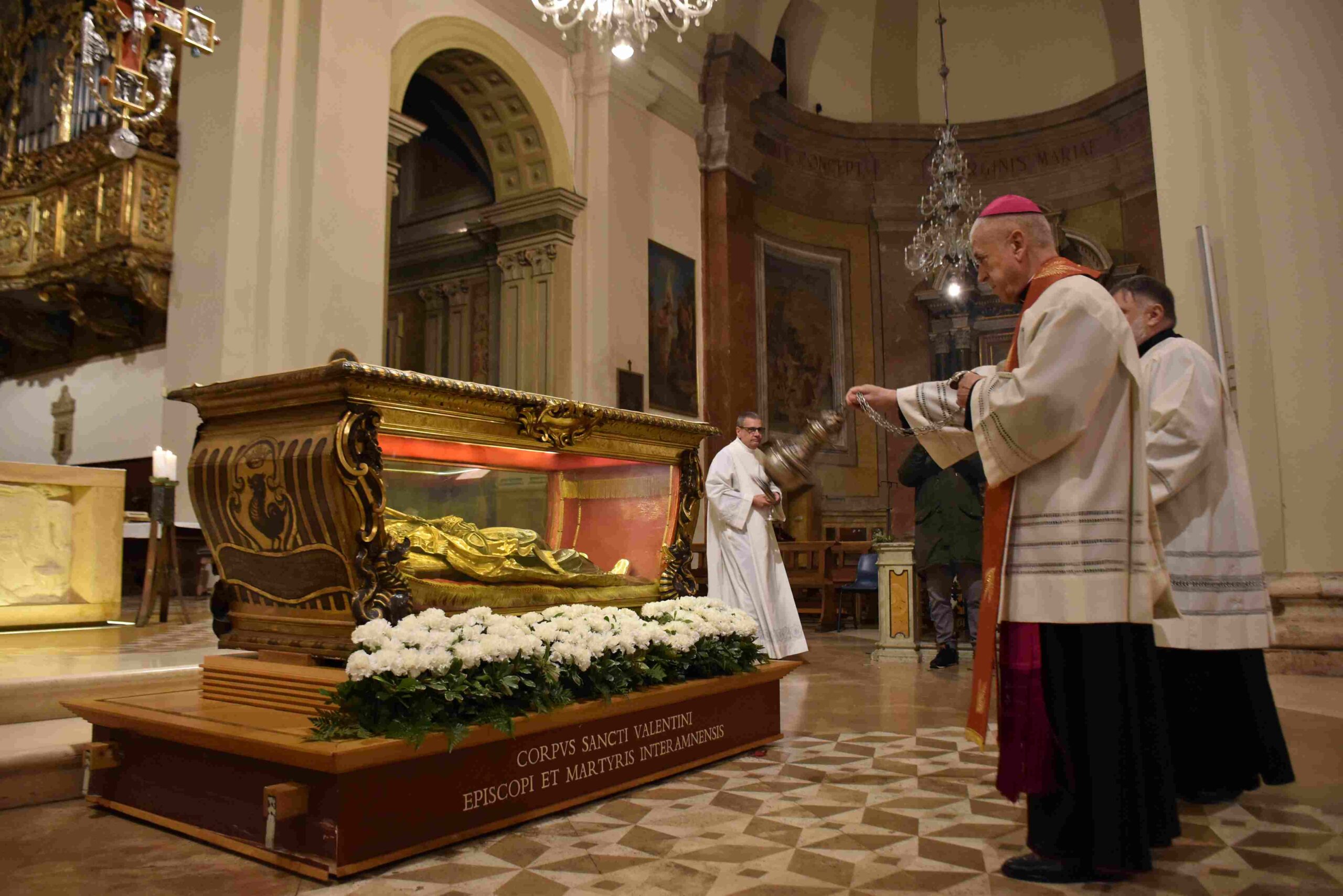 L’urna con le reliquie di San Valentino è arrivata in Cattedrale a Terni nella tarda serata di sabato 14 febbraio, scortata dalle forze dell’ordine e accolta sul sagrato della cattedrale dal vescovo Francesco Antonio Soddu e dal vicario genarale don Salvatore Ferdinandi, dal parroco della Cattedrale don Alessandro Rossini, don Matteo Antonelli, don Marco Decesaris, don Enrico D’Urso e da diversi fedeli. Il vescovo, al canto dell’inno di San Valentino, ha incensato l’urna con le reliquie del Santo. Un breve momento di preghiera e d’invocazione al santo patrono di Terni che si è concluso con la preghiera del Padre Nostro e quindi recitata la preghiera a San Valentino e il vescovo ha impartito la benedizione. E’ seguito un breve momento di preghiera e venerazione personale da parte dei fedeli presenti.