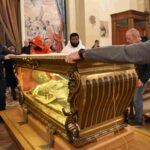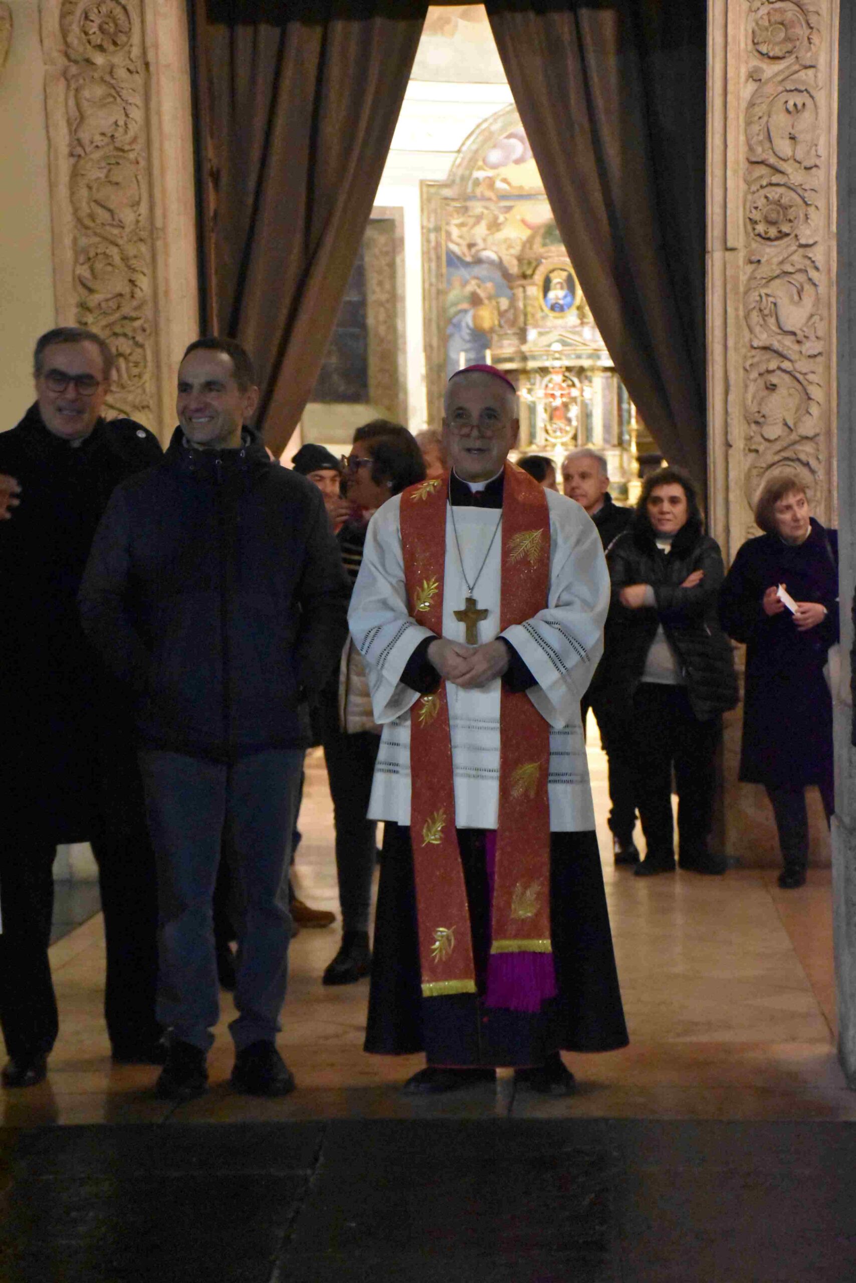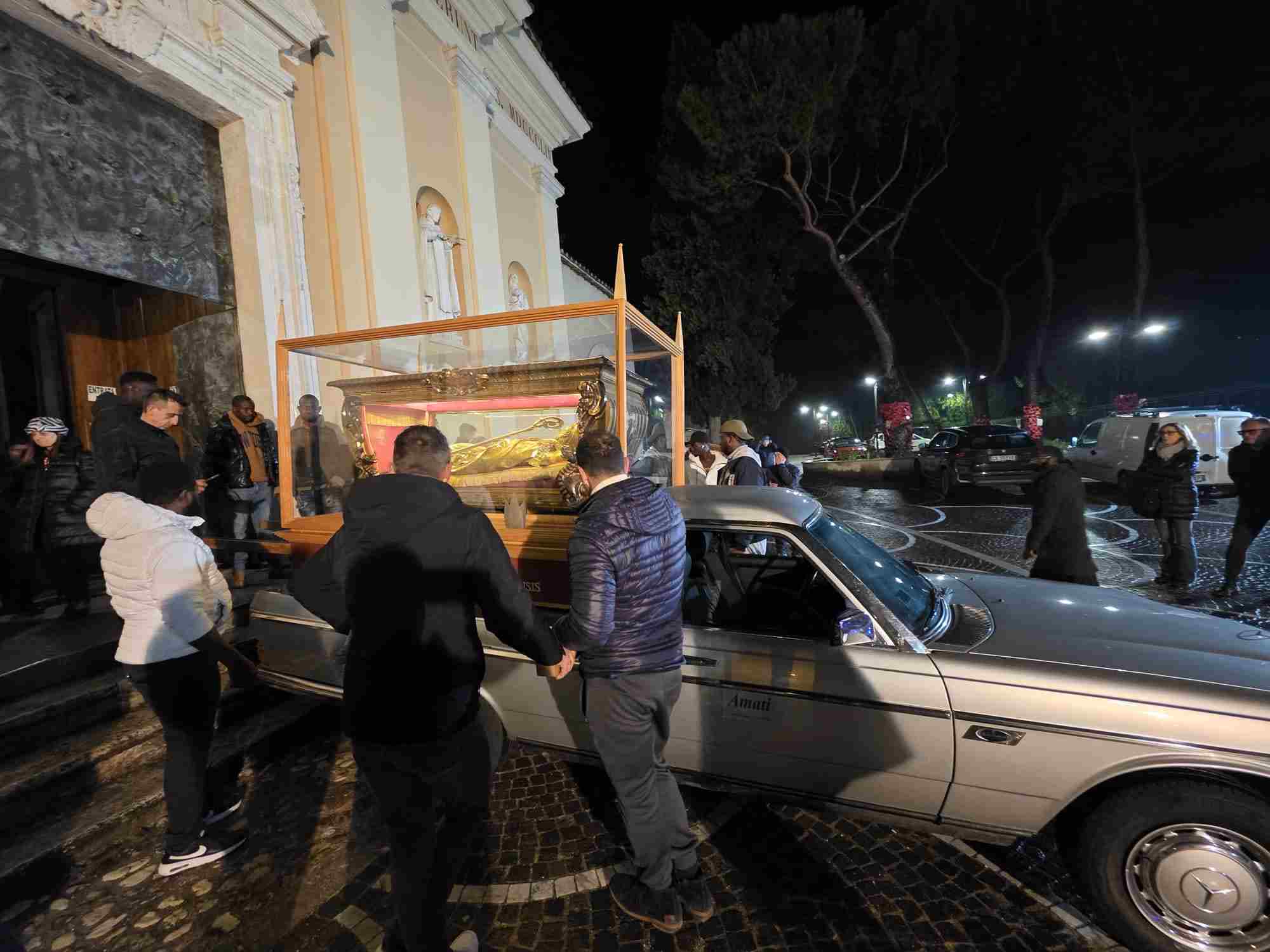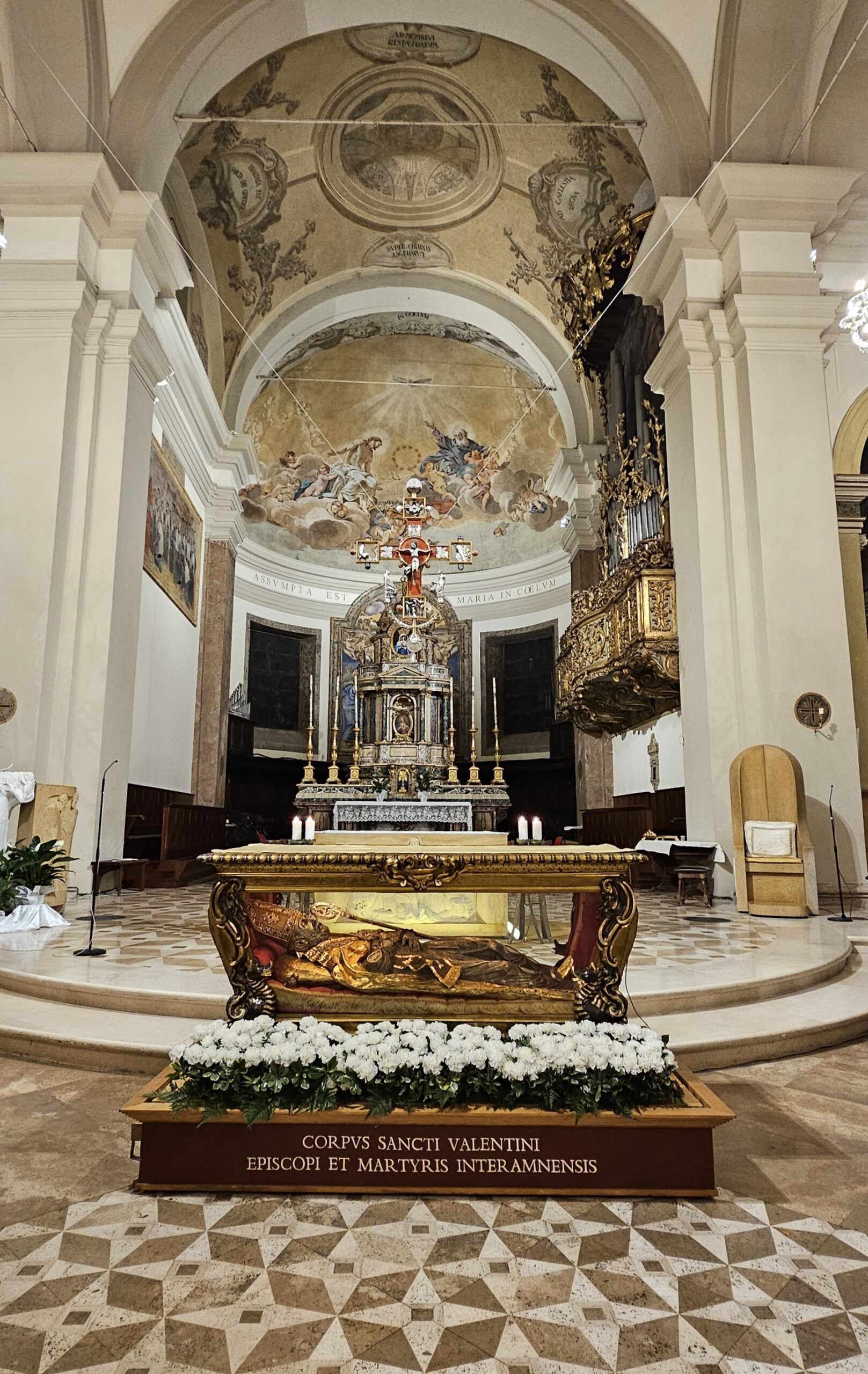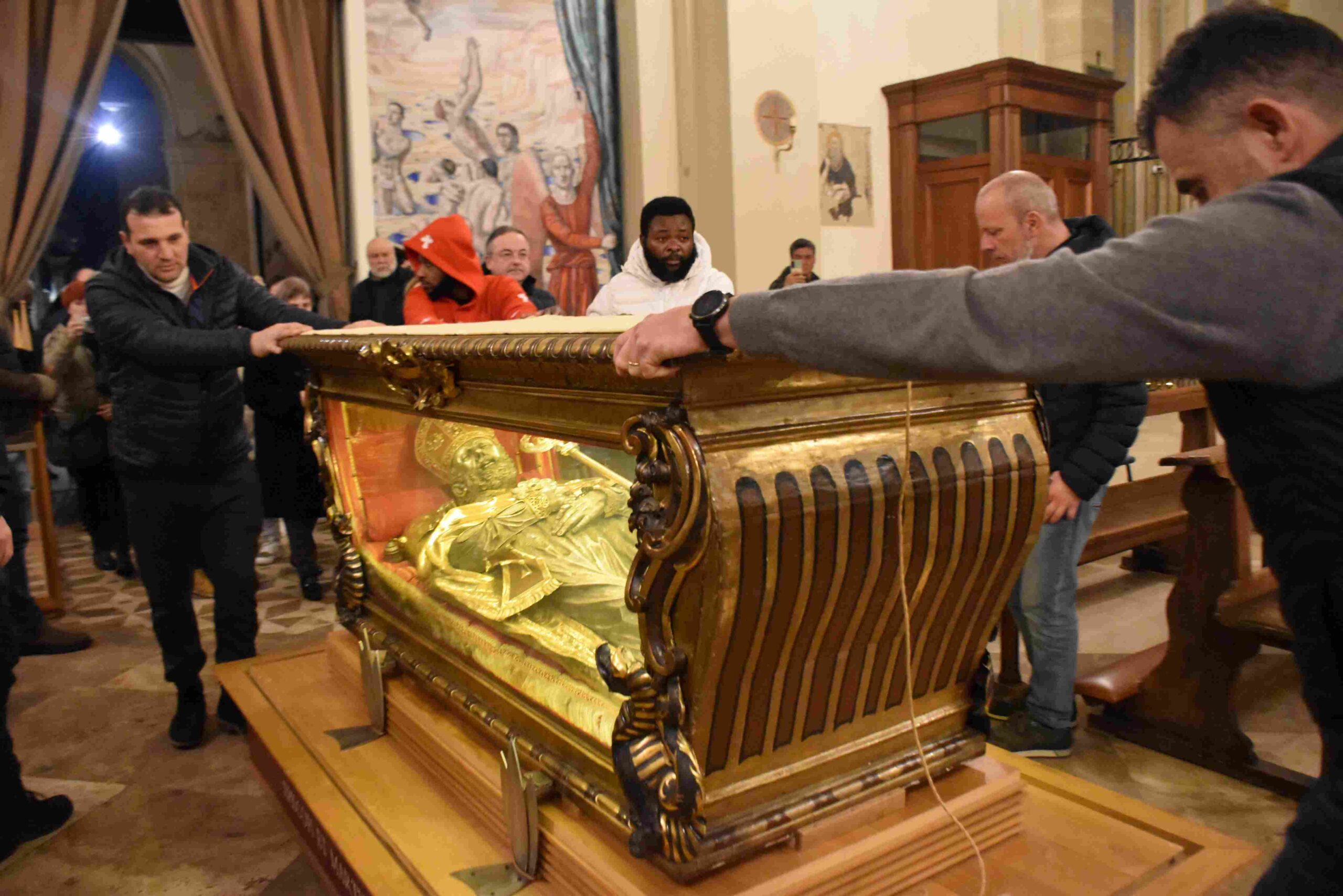 L’urna con le reliquie di San Valentino è arrivata in Cattedrale a Terni nella tarda serata di sabato 14 febbraio, scortata dalle forze dell’ordine e accolta sul sagrato della cattedrale dal vescovo Francesco Antonio Soddu e dal vicario genarale don Salvatore Ferdinandi, dal parroco della Cattedrale don Alessandro Rossini, don Matteo Antonelli, don Marco Decesaris, don Enrico D’Urso e da diversi fedeli. Il vescovo, al canto dell’inno di San Valentino, ha incensato l’urna con le reliquie del Santo. Un breve momento di preghiera e d’invocazione al santo patrono di Terni che si è concluso con la preghiera del Padre Nostro e quindi recitata la preghiera a San Valentino e il vescovo ha impartito la benedizione. E’ seguito un breve momento di preghiera e venerazione personale da parte dei fedeli presenti.