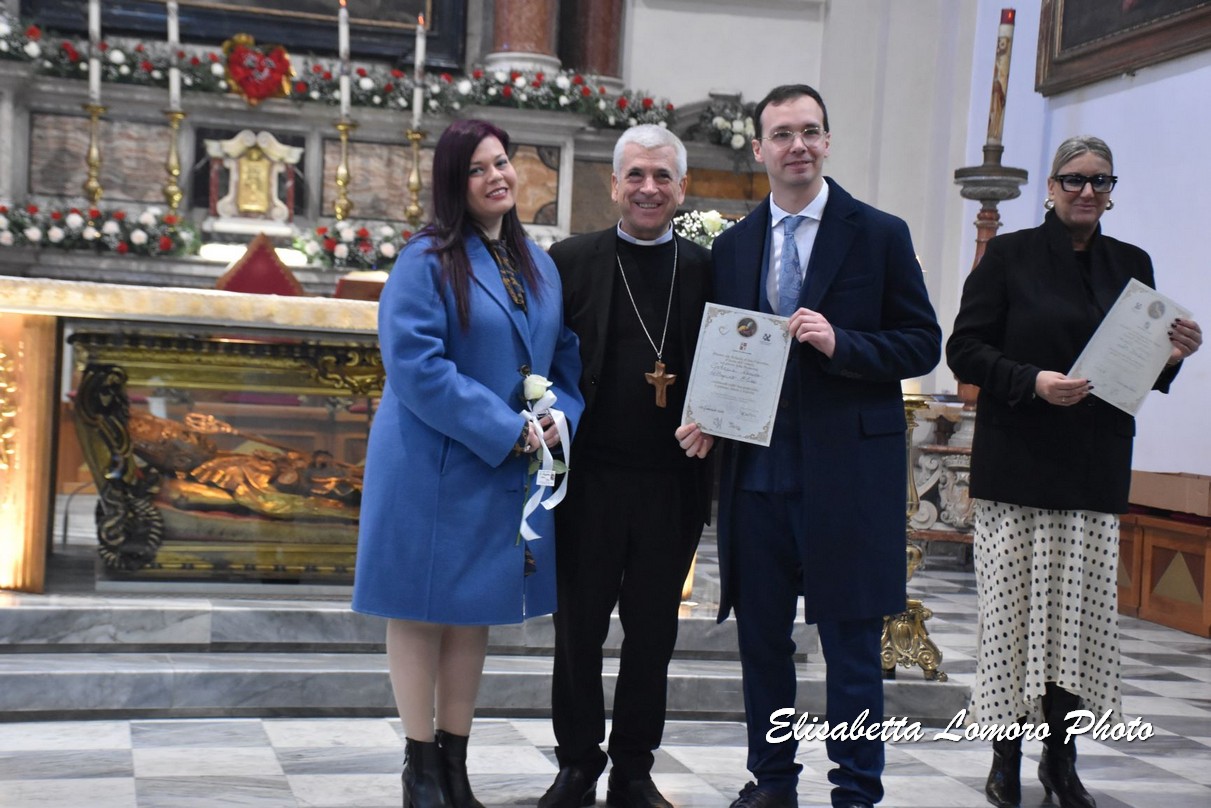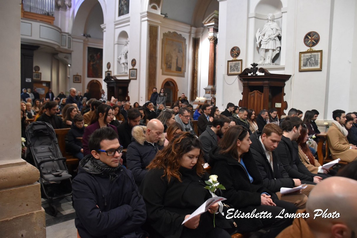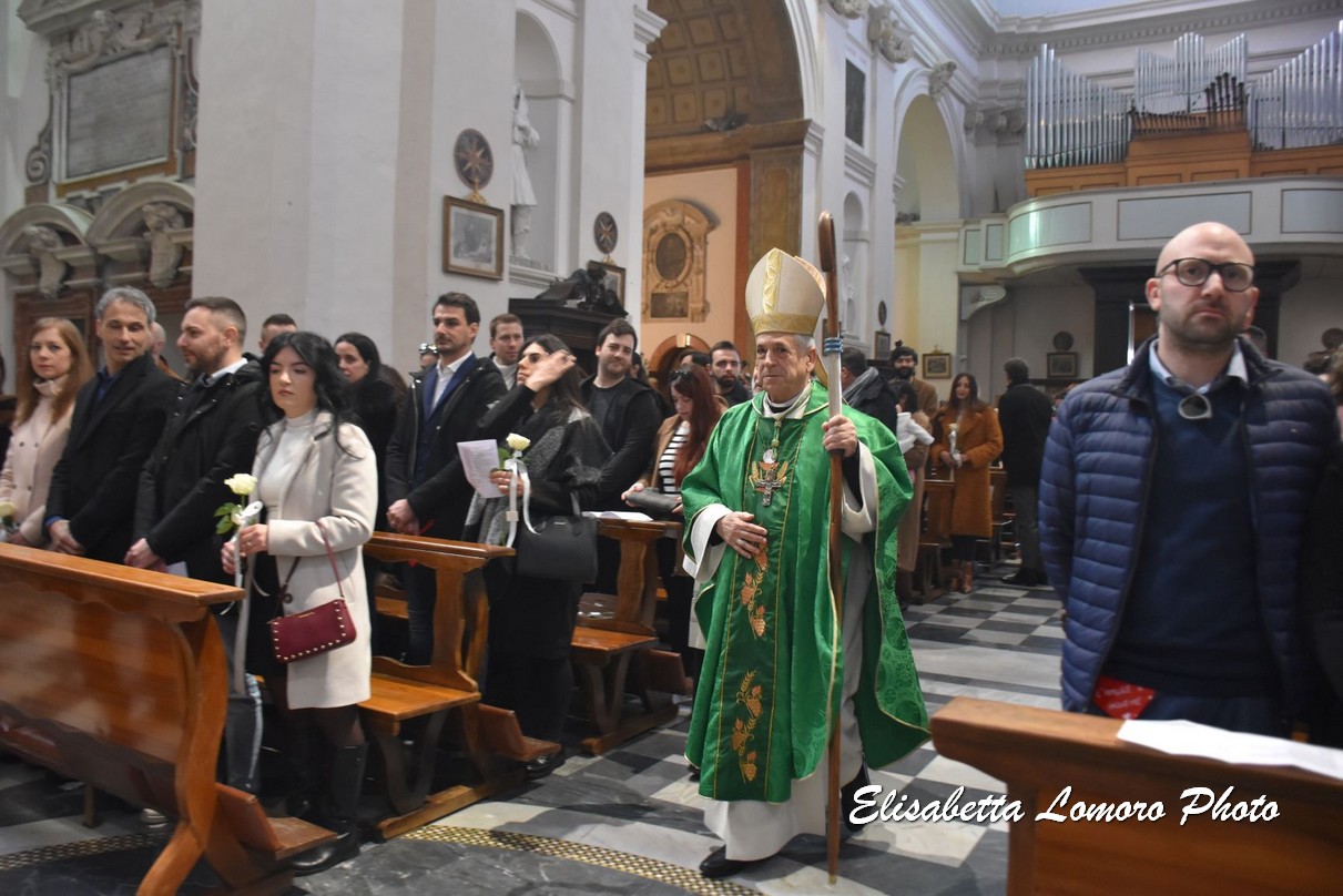 «La promessa che vi scambiate davanti a san Valentino è la vita stessa che intendete fondare l’uno sull’altra, nel prendersi cura l’una dell’altra, come uno sbocciare continuo dell’amore». È l’augurio che il vescovo Francesco Antonio Soddu ha rivolto alle 50 coppie di fidanzati che hanno partecipato alla celebrazione della promessa d’amore dei fidanzati nella basilica di San Valentino, uno dei momenti più significativi delle celebrazioni religiose in onore di san Valentino patrono di Terni e degli innamorati.