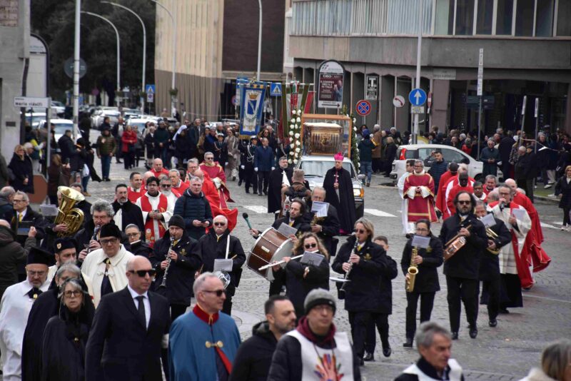 Terminato il pontificale, la processione cittadina ha accompagnato l’urna del santo per il rientro nella basilica di San Valentino, lungo le vie della città, passando davanti al palazzo Comunale, la chiesa del Sacro Cuore a città Giardino e quella di Santa Maria del Carmelo, fino al colle dove si trova la chiesa che custodisce le reliquie e la memoria del Santo.