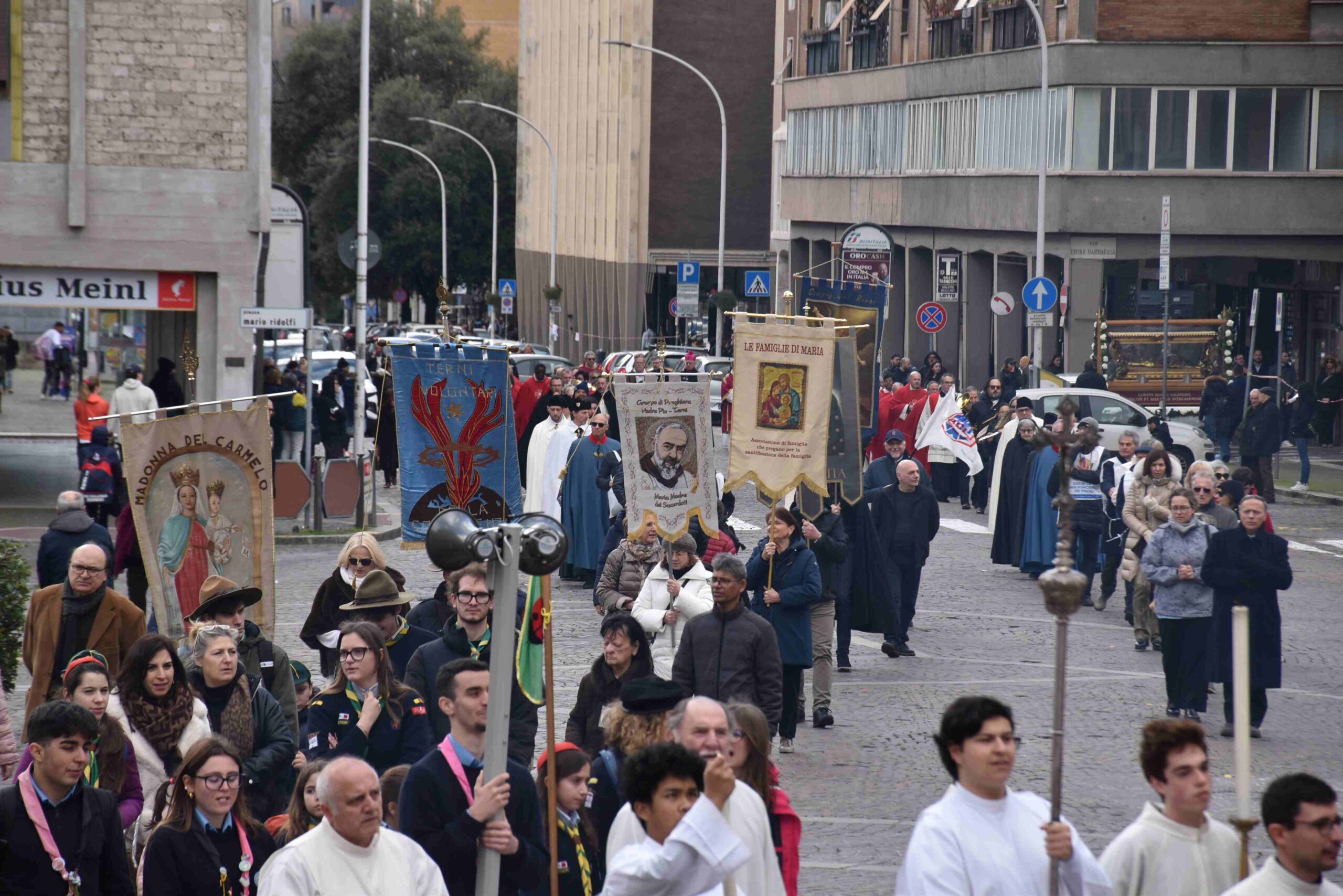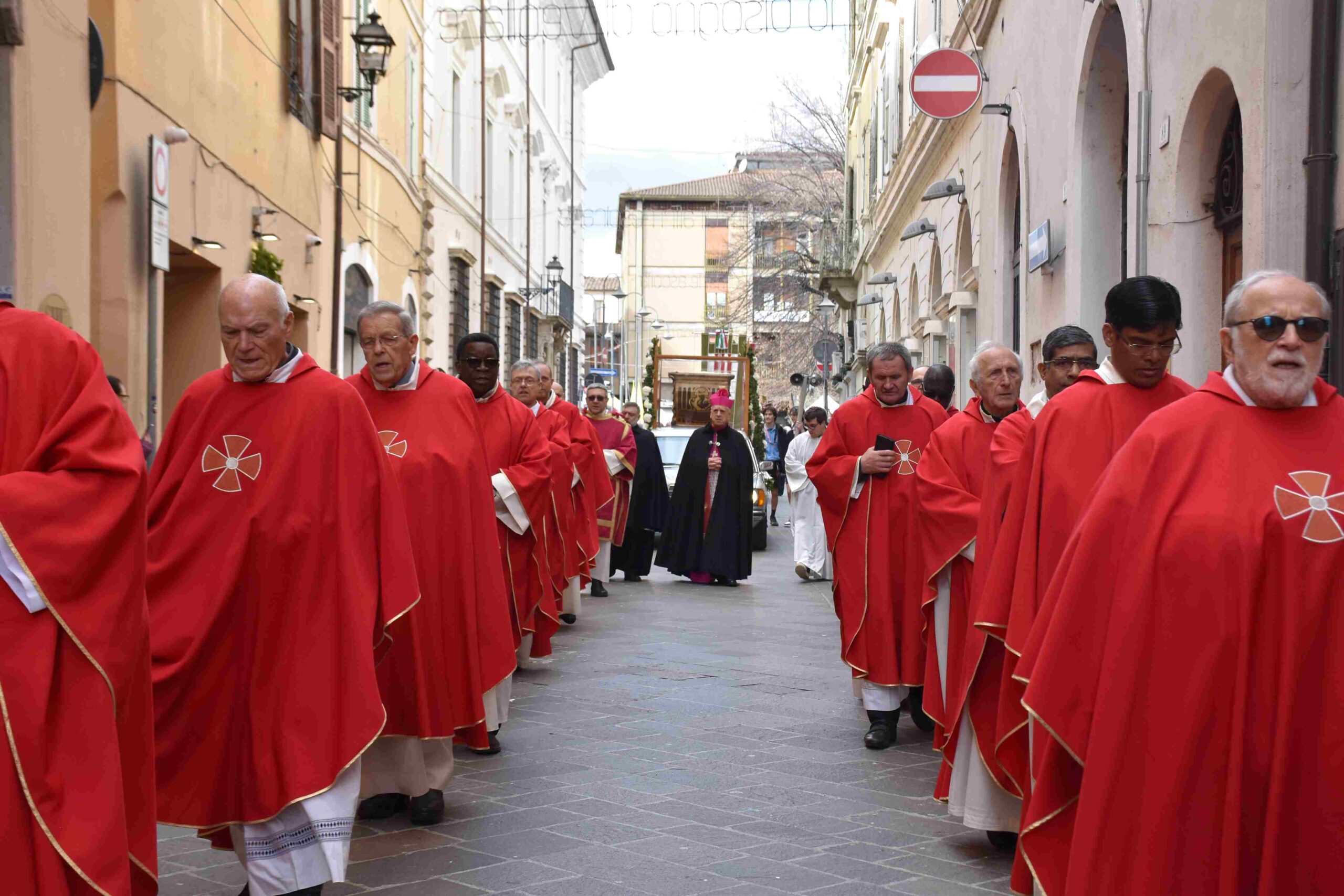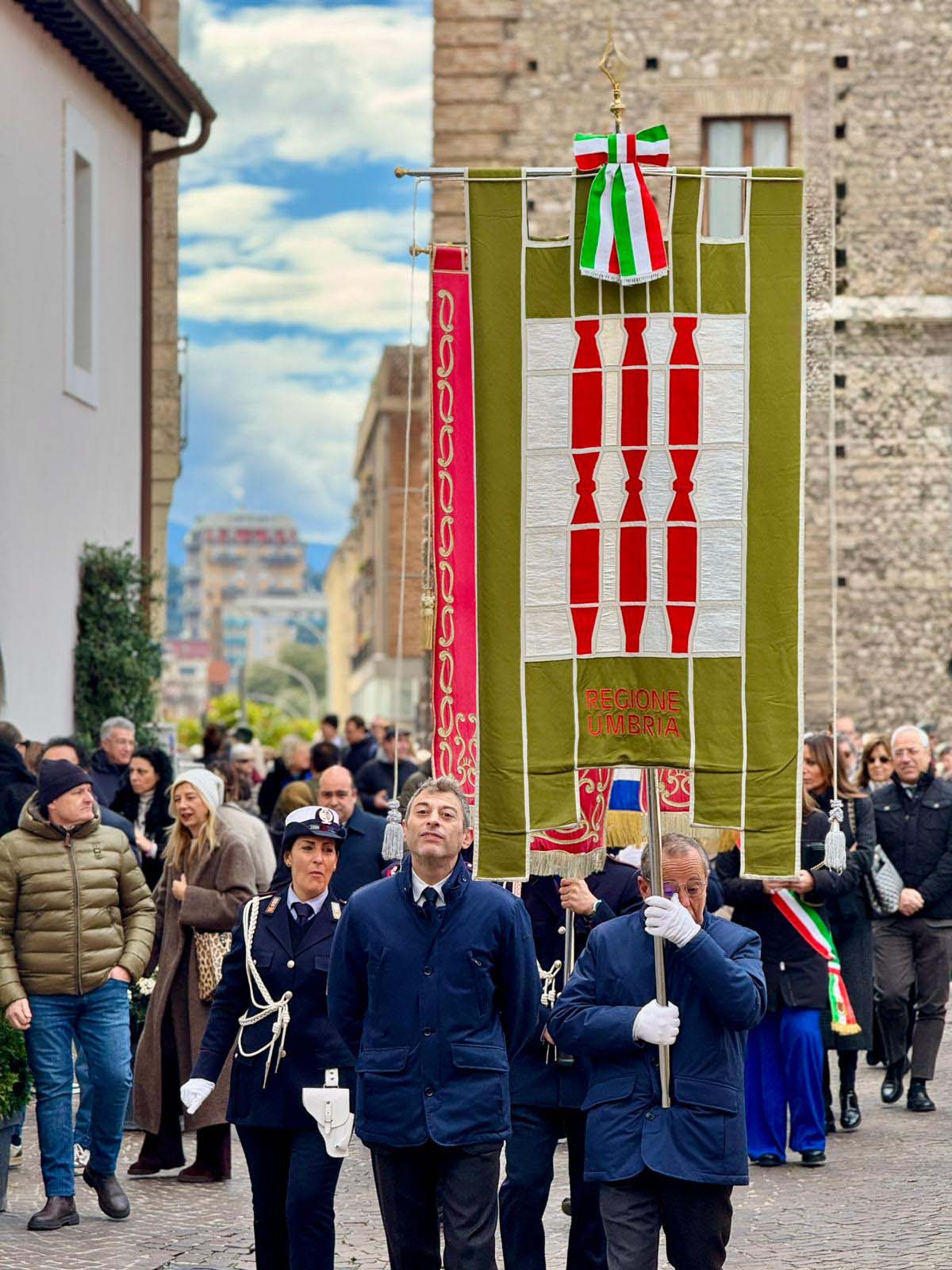 La processione è stata accompagnata dai gonfaloni del Comune, Regione e Provincia e da quelli delle confraternite, insieme ai rappresentanti di movimenti e associazioni diocesane, dalle istituzioni civili e militari presenti alla celebrazione del pontificale, dai figuranti in abiti storici del 1600 e dai tamburini e musici del terziere di Mezule di Narni, della banda musicale di Cesi.