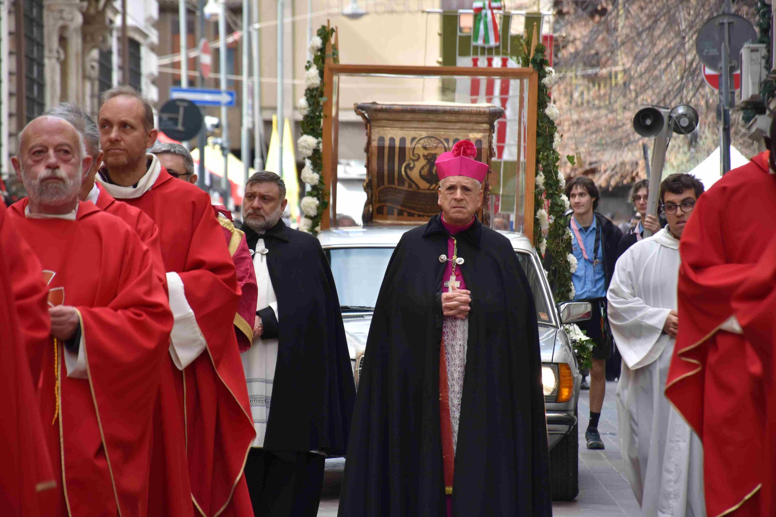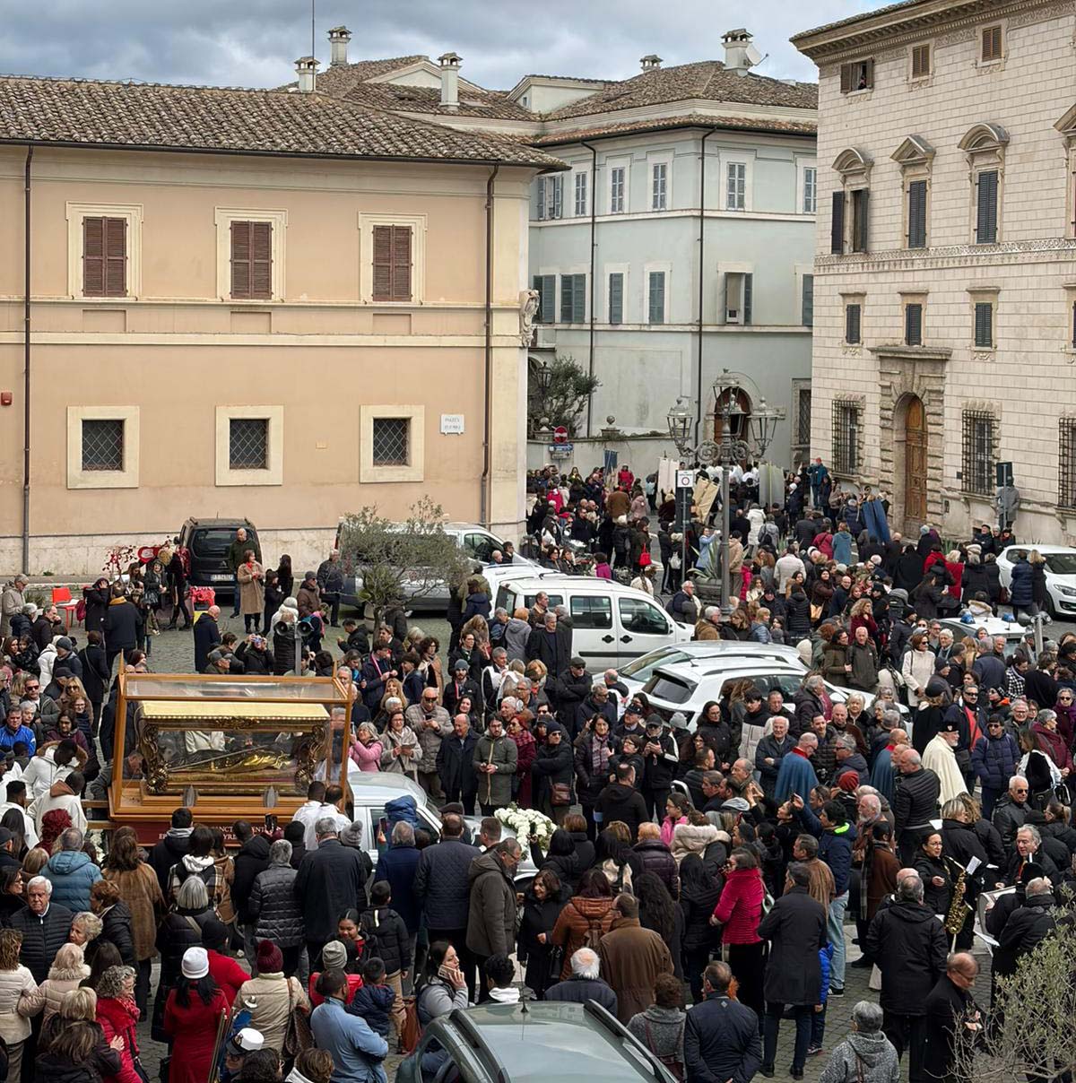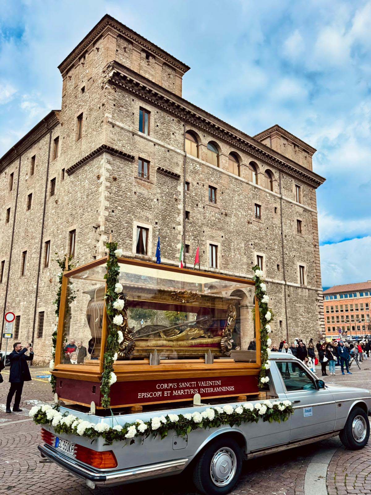 Terminato il pontificale, la processione cittadina ha accompagnato l’urna del santo per il rientro nella basilica di San Valentino, lungo le vie della città, passando davanti al palazzo Comunale, la chiesa del Sacro Cuore a città Giardino e quella di Santa Maria del Carmelo, fino al colle dove si trova la chiesa che custodisce le reliquie e la memoria del Santo.