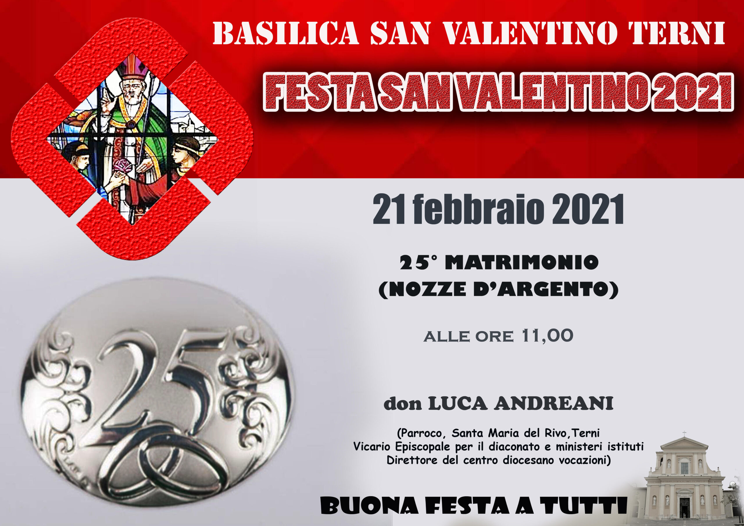 Domenica 21 febbraio alle ore 11 nella basilica di San Valentino si terrà la celebrazione per la festa delle nozze d’argento. Circa venti coppie di Terni, rinnoveranno davanti all’urna di San Valentino gli impegni consacrati sull’altare nel giorno del matrimonio. La celebrazione sarà presieduta da don Luca Andreani, parroco di Santa Maria del Rivo e direttore del Centro diocesano Vocazioni.