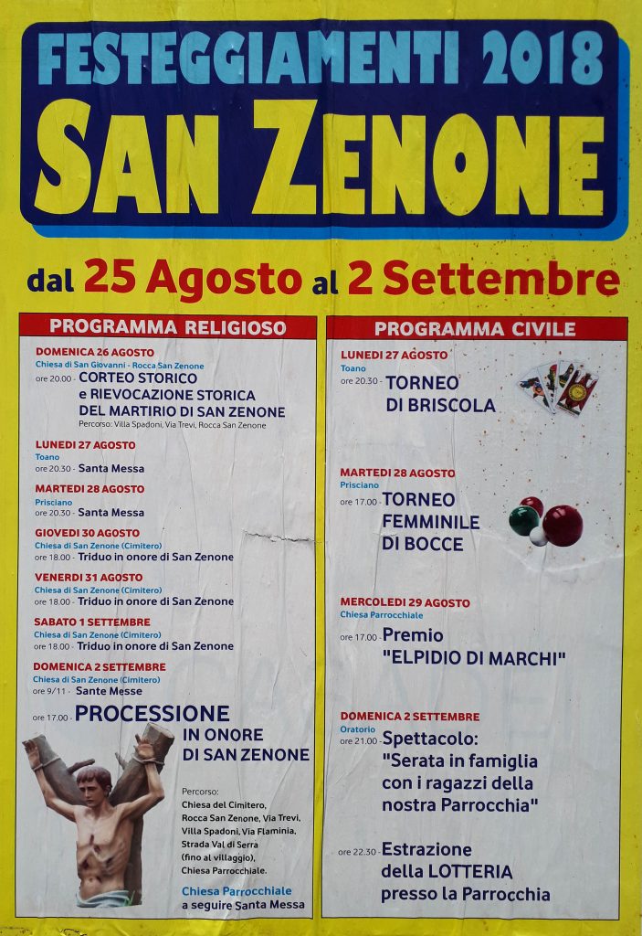 Domenica 2 settembre, festività liturgica di San Zenone, saranno celebrate le messe alle ore 9, 11 presso la chiesa del cimitero, alle 17 ci sarà la processione dalla chiesa del Cimitero lungo Rocca San Zenone, via Trevi, Villa Spadoni, via Flaminia, strada Val di Serra fino alla chiesa parrocchiale dove sarà celebrata la santa messa solenne.