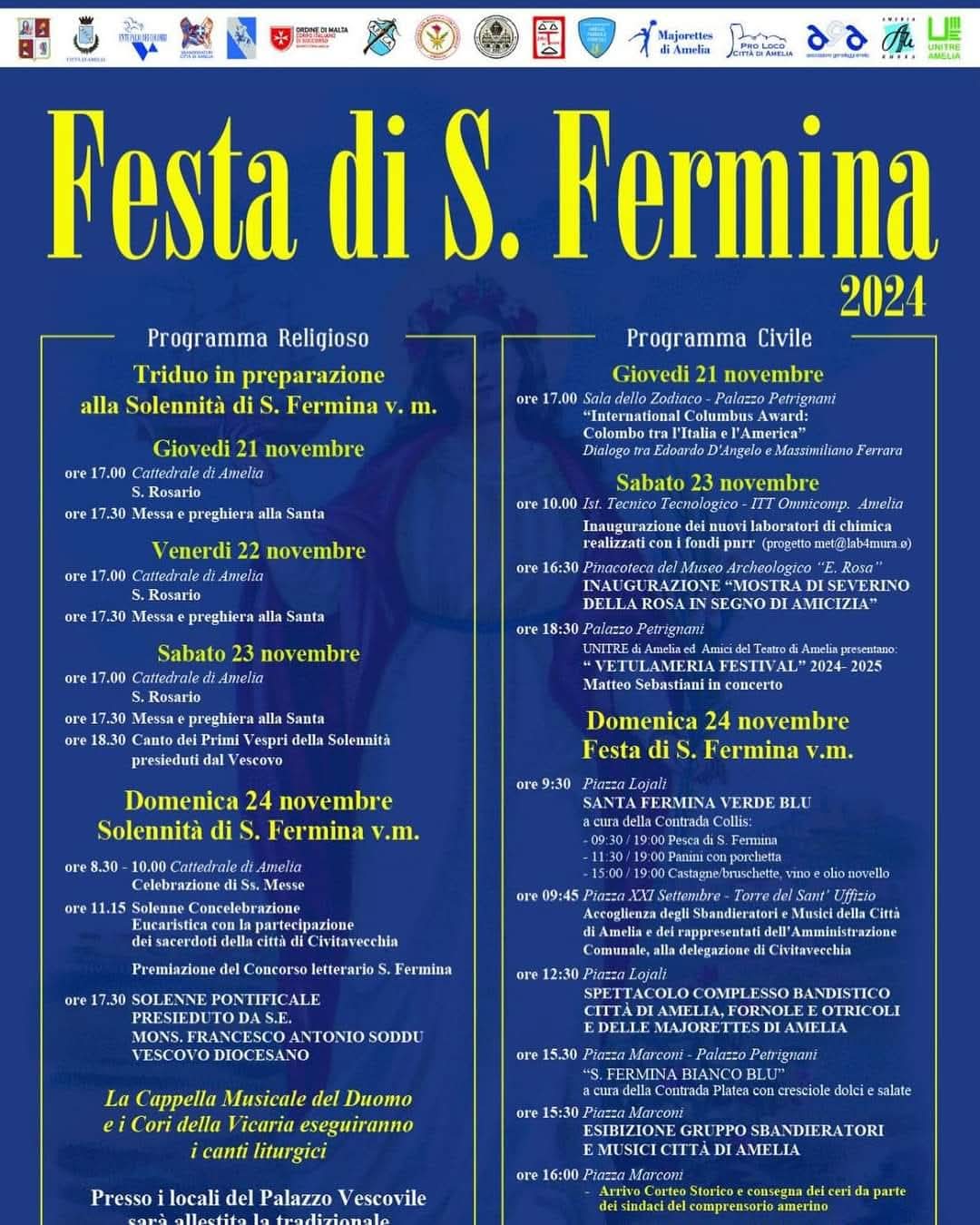 Domenica 24 novembre ad Amelia si celebra la festa di santa Fermina, patrona della città e copatrona della diocesi di Terni-Narni-Amelia. Una celebrazione che è un evento religioso e civile, un incontro tra Amelia e Civitavecchia per rinsaldare il gemellaggio tra le due città nel nome della comune patrona Fermina, giovane martire del III secolo.