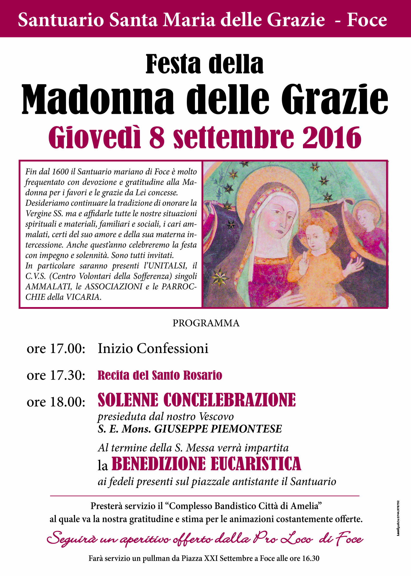 Martedì 8 settembre alle ore 17.00 ci sarà la recita del rosario e le confessioni. Alle ore 18 la solenne concelebrazione presieduta dal vescovo Giuseppe Piemontese alla presenza dei sacerdoti della vicaria di Amelia, fedeli e malati.