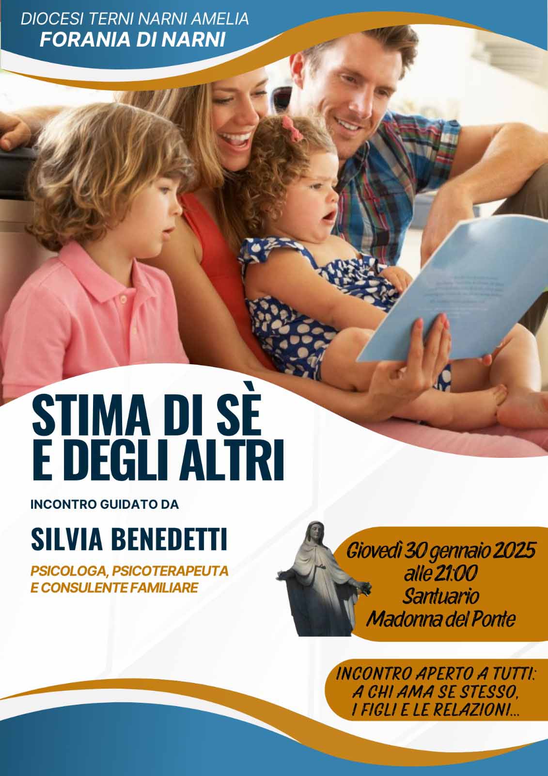 La Forania di Narni organizza al santurio della Madonna del Ponte, giovedì 30 gennaio alle ore 21 un incontro “Stima di sé e degli altri” dedicato all’approfondimento delle relazioni interpersonali e familiari, guidato da Silvia Benedetti psicologa, psicoterapeuta e consulente familiare.