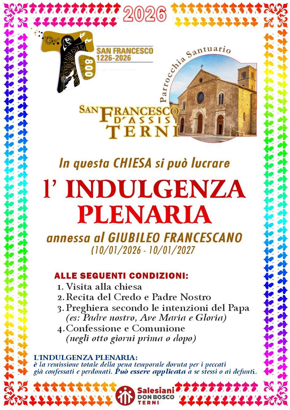 Nel Giubileo Francescano 2026, negli 800 anni della morte di San Francesco di Assisi, nella chiesa santuario di San Francesco a Terni si può lucrare l’indulgenza plenaria alla seguenti condizioni: visita alla chiesa, recita del Credo e del Padre Nostro, preghiera secondo lel intenzioni del Papa, confessione e comunione (negli otto giorni prima o dopo).