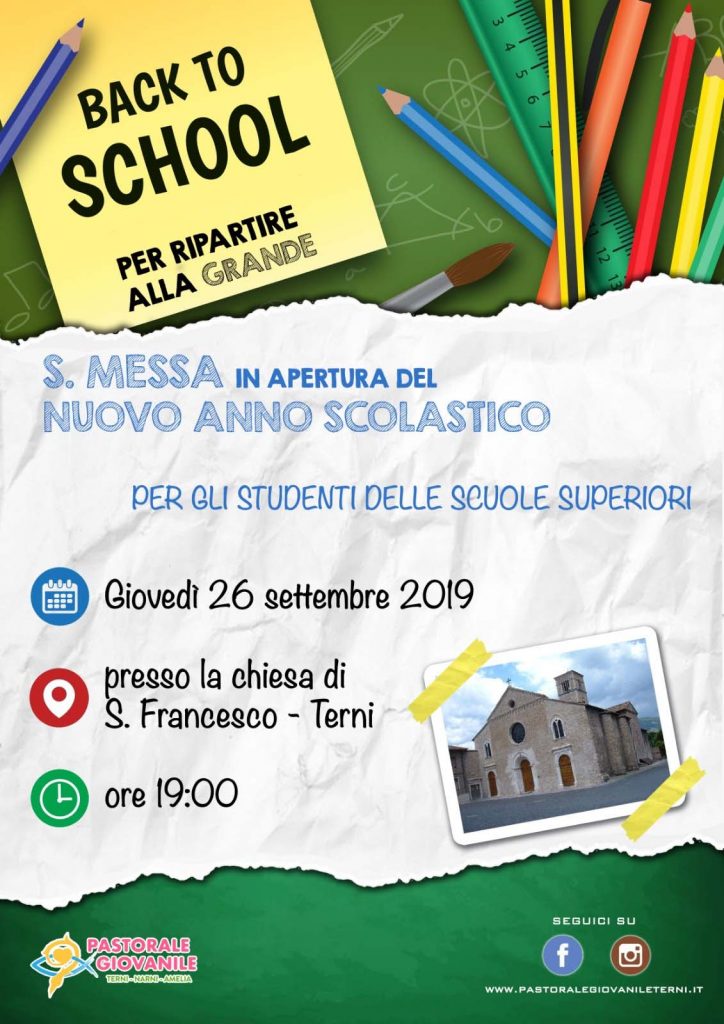 Giovedì 26 settembre maggio alle ore 19.00 nella Chiesa di San Francesco a Terni ci sarà la Messa per tutti studenti e docenti ad inizio anno scolastico. Un momento per affidare al Signore gli studi, le fatiche e i desideri, a Lui che “Ti scruta e Ti conosce”.