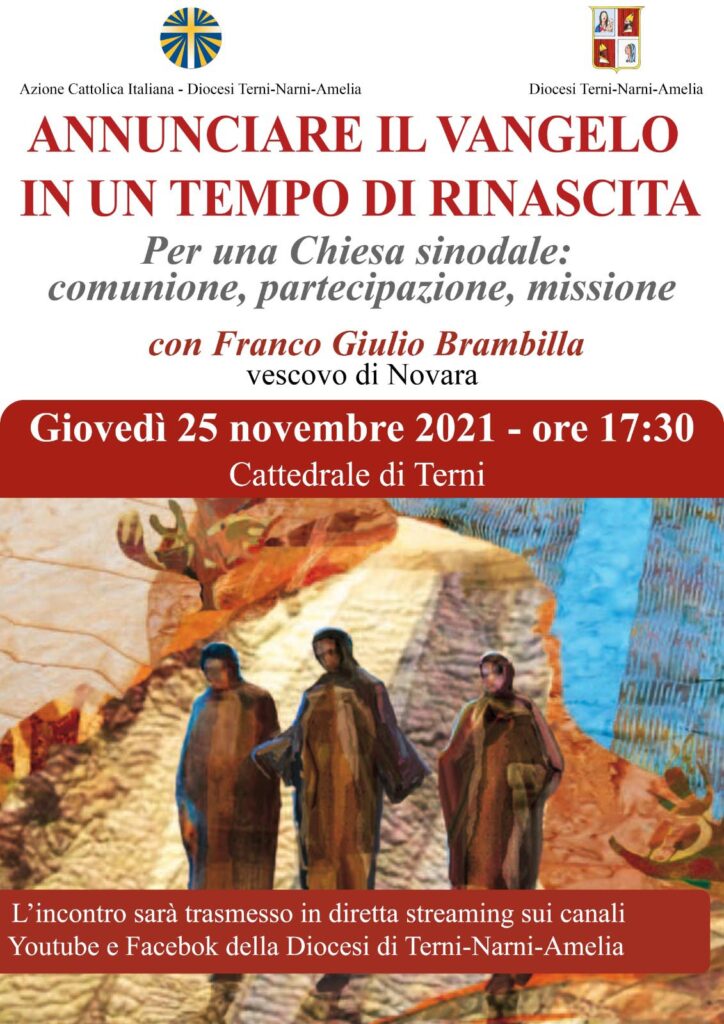 Nel cammino diocesano sinodale con varie tappe per gli approfondimenti, consultazione, di reciproco ascolto e di riflessione sulla vita delle comunità, nelle parrocchie e nelle foranie sui temi sinodali, il secondo appuntamento sarà giovedì 25 novembre alle ore 17.30 presso la cattedrale di Terni con la riflessione guidata da mons. Franco Giulio Brambilla, vescovo di Novara sul tema “Per una Chiesa sinodale: comunione, partecipazione e missione”.