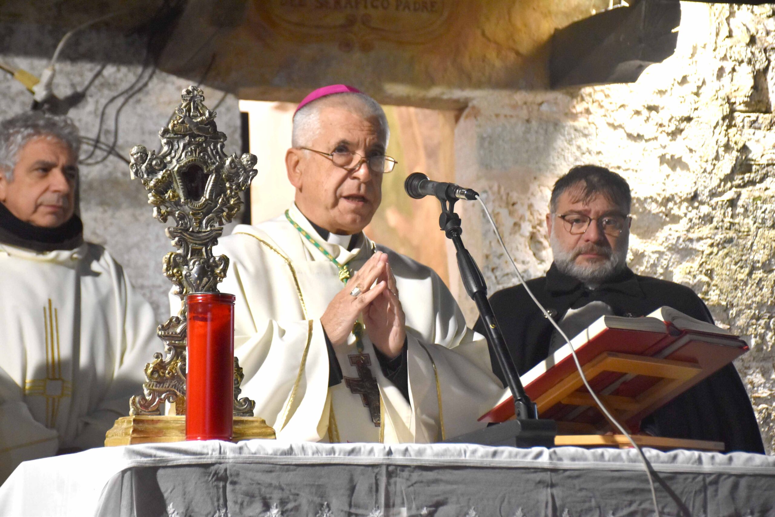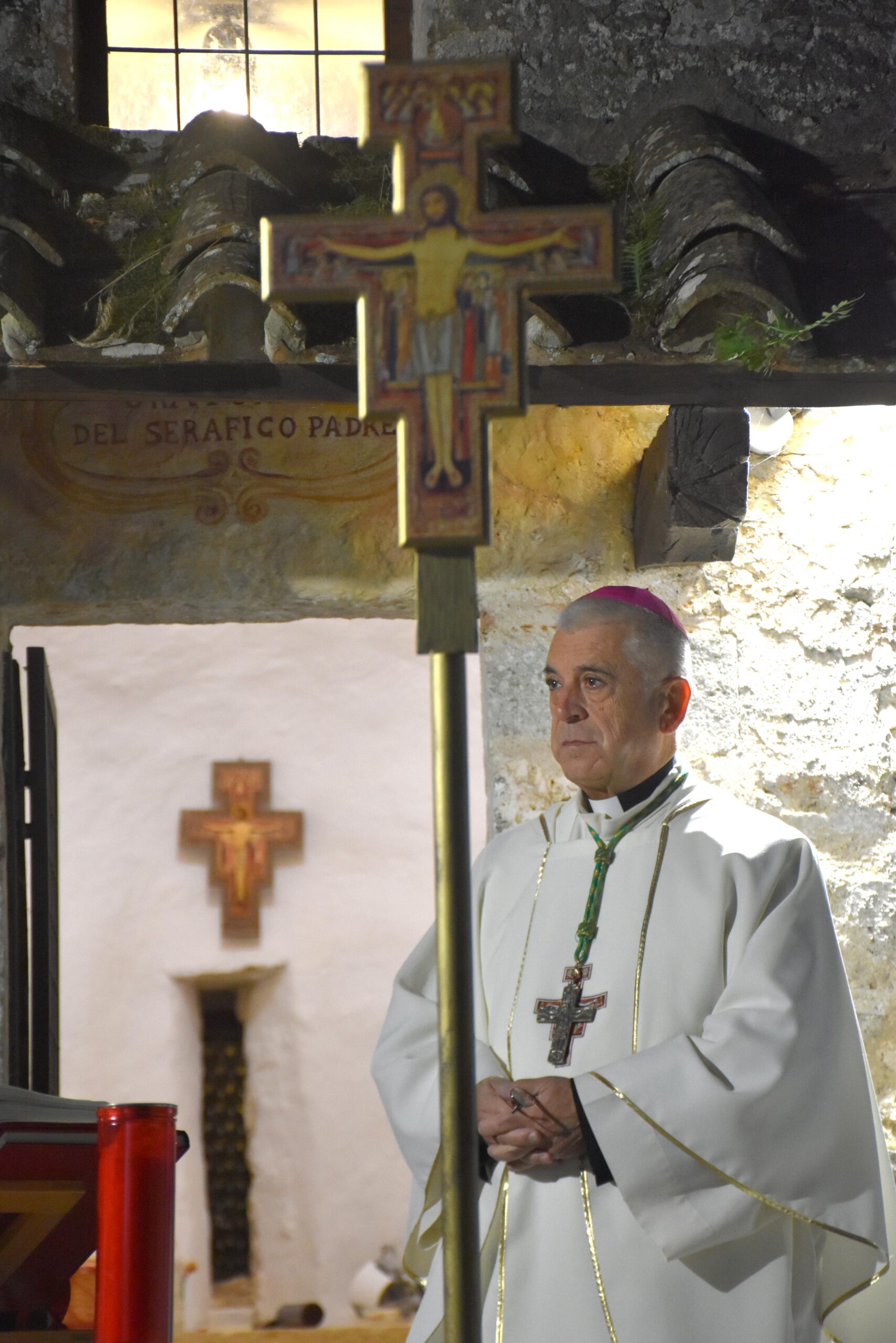 “Siamo venuti pellegrini in questo luogo francescano – ha detto il vescovo Soddu – guidati da Francesco, seguendo il suo esempio di vita, immagine viva di Gesù. Egli così giovane è vicino a noi e ci suggerisce la giusta via. Nella quotidianità ci troviamo ad essere strattonati quà e là, e davanti alle scelte da prendere, san Francesco ci insegna la radicalità evangelica che è fondata sulla Croce, non su una o più croci qualsiasi, ma sulla Croce di Cristo, per mezzo della quale il mondo è stato salvato. Certo le croci quali strumenti di morte sono da allontanare e scongiurare, e quante croci vengono ancora piantate nella storia della umanità, specialmente quelle che inchiodano e mettono a morte gli altri. Sulla croce di Cristo tutti ci si deve ritrovare perchè quella è lo strumento della nostra salvezza. E’ necessario rinnegare il proprio io, il proprio egoismo e seguire Gesù che esorta a cambiare direzione ad andare controcorrente e affidarci a Lui. Gesù da strumento strumento di distruzione ha fatto della croce strumento di redenzione con la pienezza del suo amore. L’incontro con Cristo cambia la vita e siamo oggi qui per incontrarlo perchè la nostra vita cambi con l’amore di Dio”.