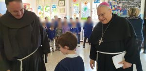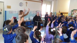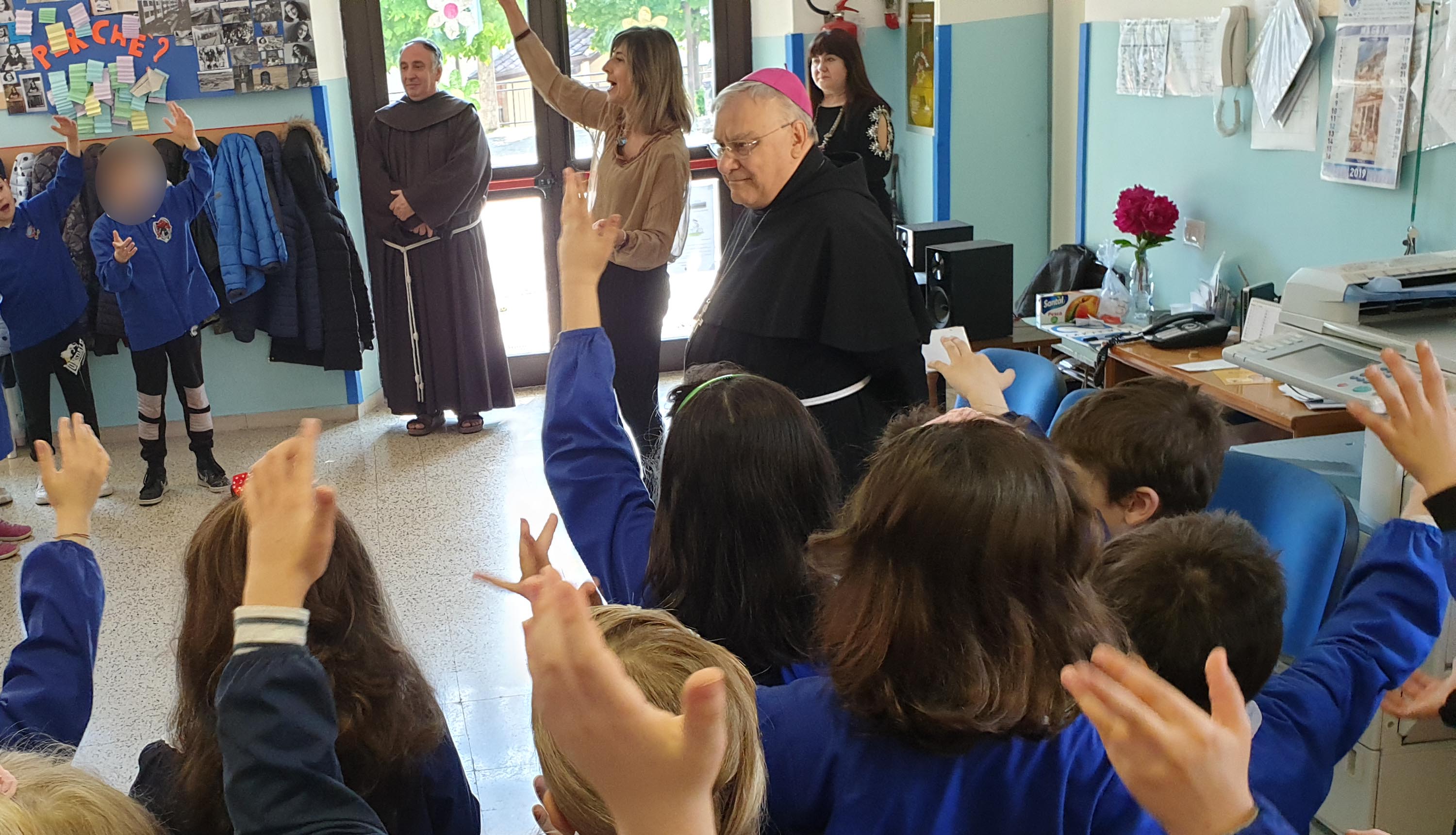 Un incontro gioioso e festante con i bambini che hanno accolto il vescovo con dei canti e balli e un grande cartellone di benvenuto con i volti di alcuni ragazzi. I ragazzi della quinta classe hanno posto delle domande sulla missione del vescovo e sulla sua vocazione, sulla fede e il rapporto con il Signore. Il vescovo ha parlato loro del suo ministero, della visita pastorale, dell’amore di Gesù, di San Francesco e del suo amore per il creato e per ogni creatura che chiamava fratello e sorella, recitando un brano del Cantico delle Creature.