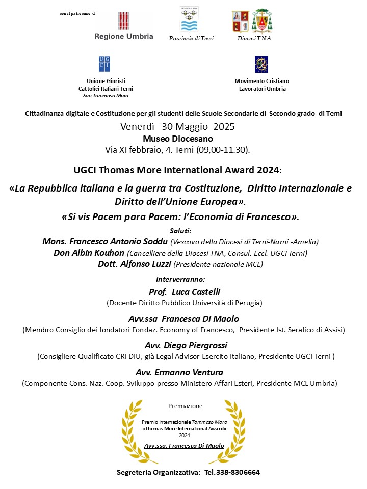L’Unione Giuristi Cattolici Italiani sezione di Terni “San Tommaso Moro”, il Movimento Cristiano Lavoratori Umbria, nell’ambito del progetto nell’ambito del Progetto Cittadinanza digitale e Costituzione per gli studenti delle Scuole Secondarie di secondo grado, promuovono il convegno “La Repubblica italiana e la guerra tra Costituzione, Diritto Internazionale e Diritto dell’Unione Europea”. “Si vis Pacem para Pacem: l’Economia di Francesco”, che si terrà venerdì 30 maggio 2025 dalle ore 9 alle 11.30 presso il Museo Diocesano di Terni.