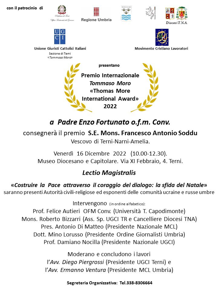 Venerdì 16 dicembre 2022 alle ore 10 al Museo Diocesano e Capitolare di Terni si terrà la cerimonia di consegna del Premio Internazionale “Tommaso Moro 2022” a Padre Enzo Fortunato o.f.m. Conv. consegnerà il premio mons. Francesco Antonio Soddu Vescovo di Terni-Narni-Amelia, e la lectio magístralis «Costruire la Pace attraverso il coraggio del dialogo: la sfida del Natale»