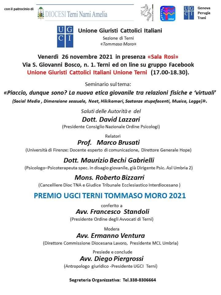 Unione Giuristi Cattolici Italiani della sezione di Terni (UGCI Terni) promuovere la conoscenza delle problematiche giovanili e le possibili soluzioni, con l’incontro «Piaccio, dunque sono? La nuova etica giovanile tra relazioni fisiche e ‘virtuali’ (Social Media, Dimensione sessuale, Neet, Hikikomori, Sostanze stupefacenti, Musica, Legge)», venerdì 26 novembre 2021, alle ore 17.00 presso la Sala Rosi della parrocchia San Francesco di Assisi, nel rispetto delle norme anti covid 19 (per la partecipazione in presenza è richiesto Green Pass), in modalità mista (in presenza, ed on line Facebook Unione Giuristi Cattolici Italiani di Terni).