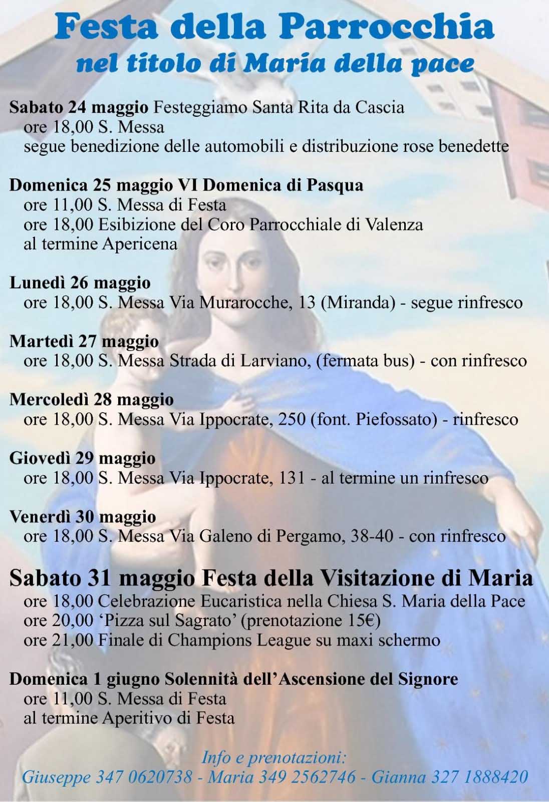 Sabato 31 maggio, festa della Visitazione di Maria – ore 18 Celebrazione Eucaristica nella Chiesa S. Maria della Pace. Ore 20 ‘Pizza sul Sagrato’ (prenotazione 15€). Ore 21 Finale di Champions League su maxi schermo