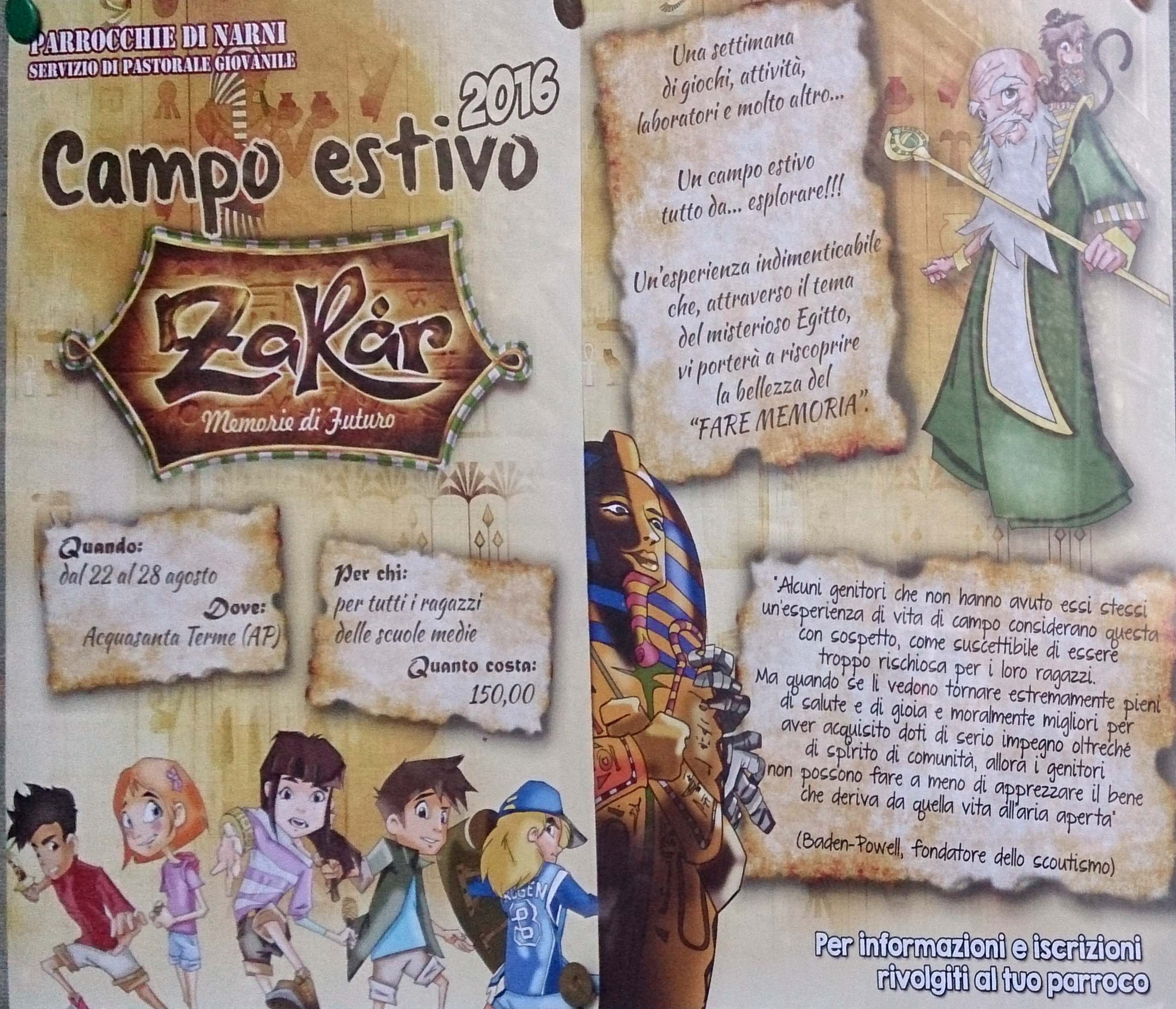 Le parrocchie della zona di Narni e il servizio di pastorale giovanile organizzano un campo estivo dal 22 al 28 agosto ad Acquasanta terme per tutti i ragazzi delle scuole medie. Una settimana di giochi, attività, lavoratori, un campo estivo tutto da esplorare. Per iscrizioni rivolgersi al proprio parroco.
