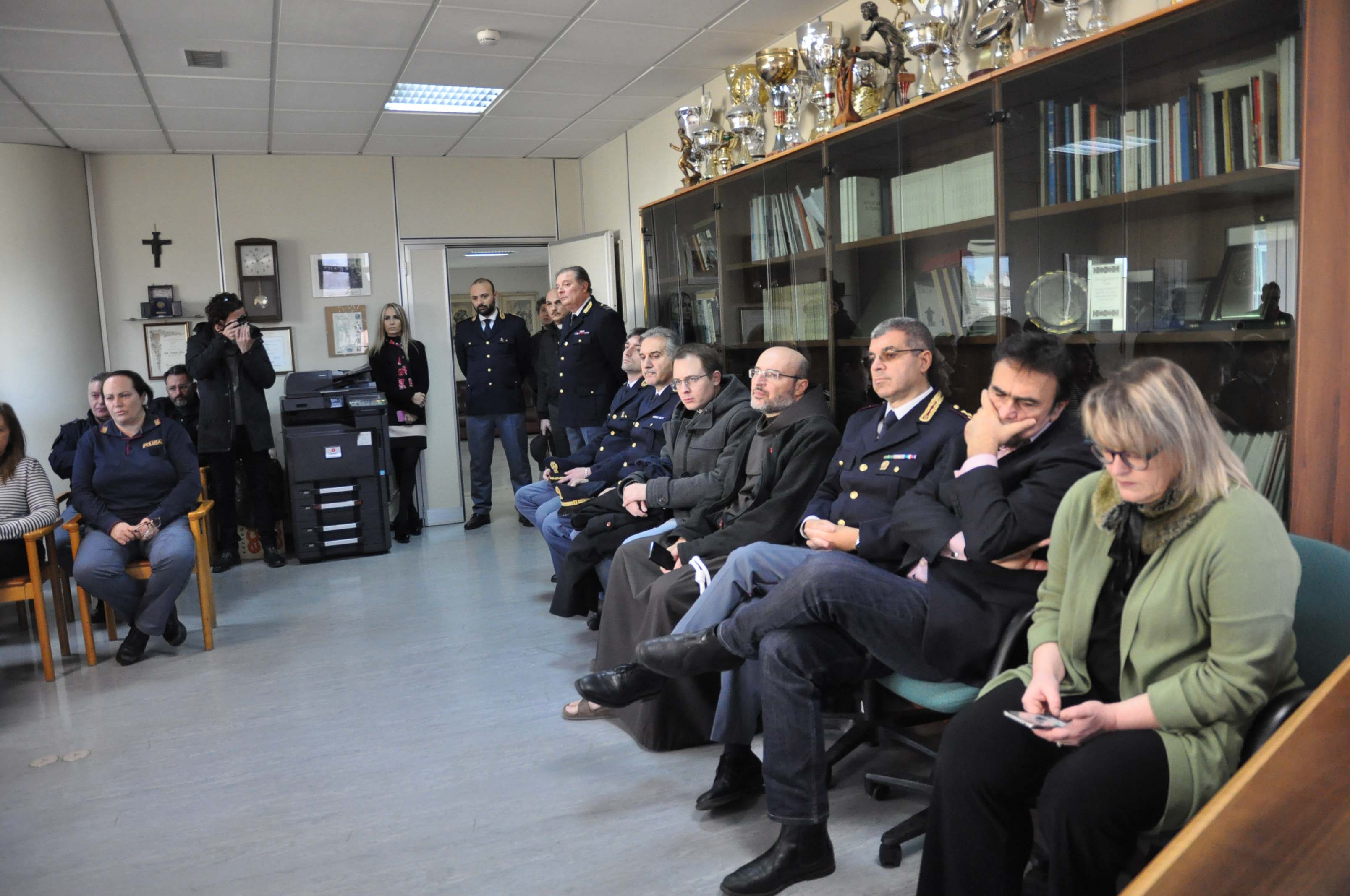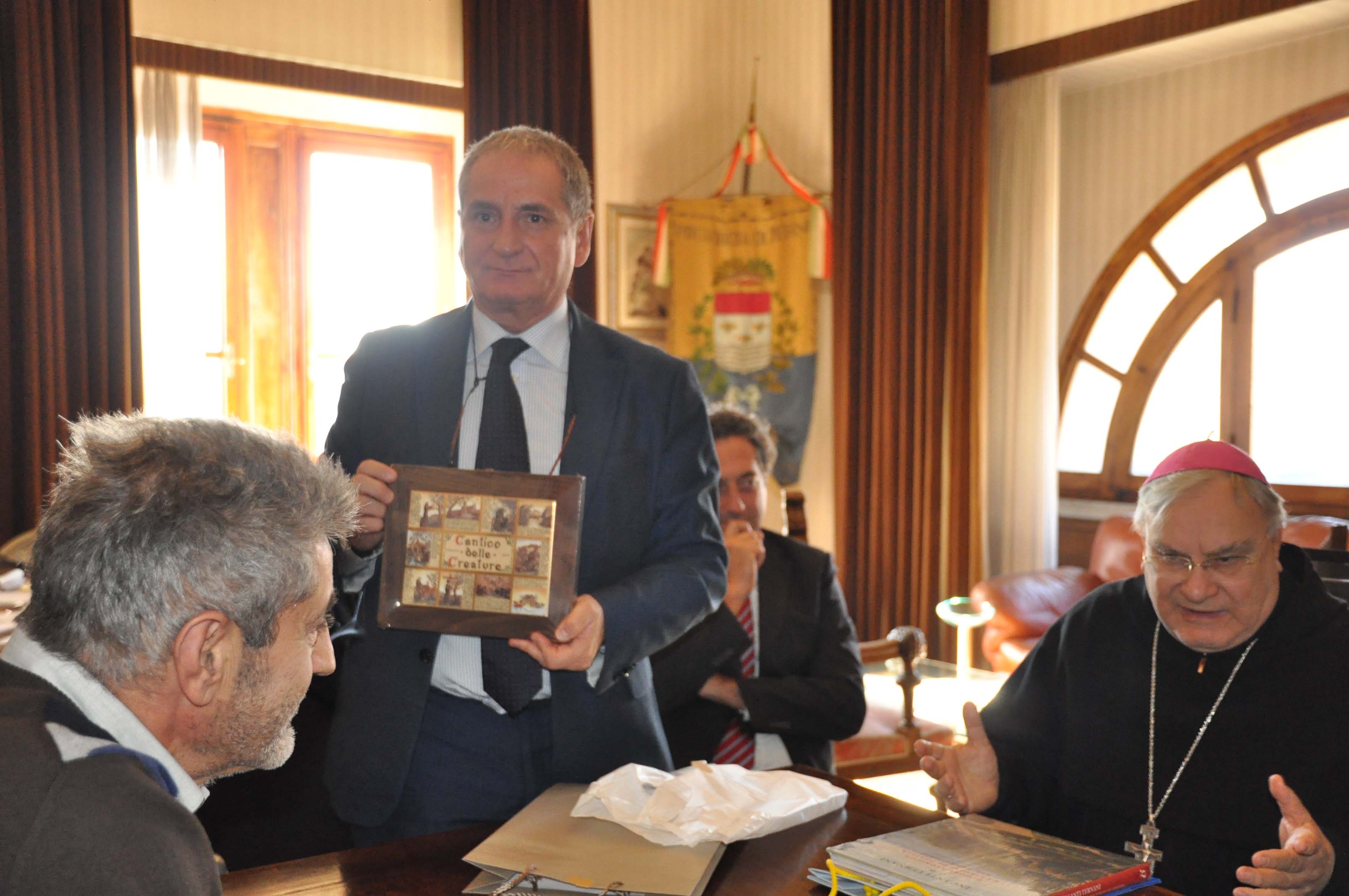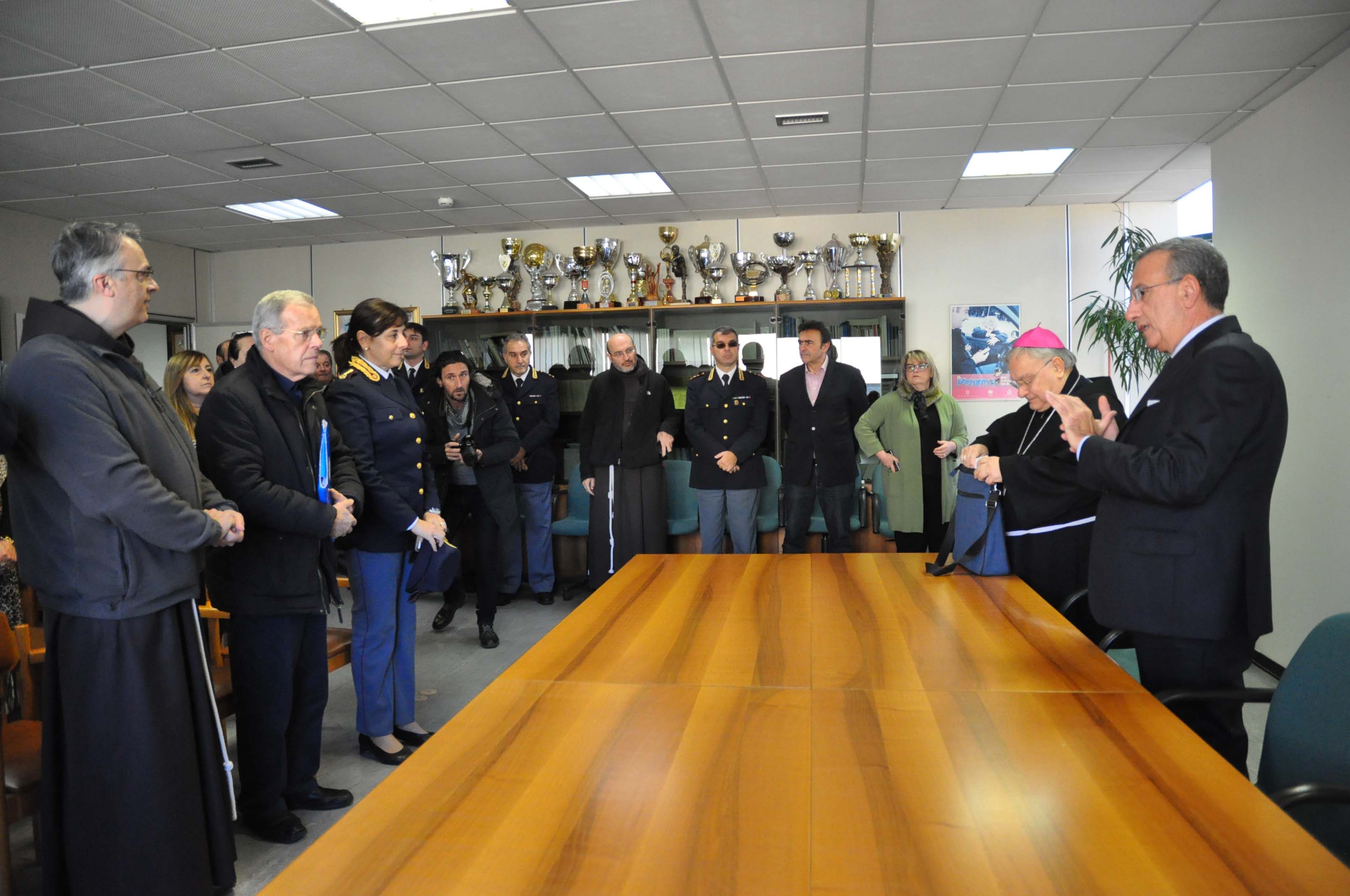 Il Vescovo ha ringraziato la Polizia per quello che fa, in uno spirito di collaborazione per operare per un fine comune; un lavoro per molti tratti simile, come ha detto il Questore Antonino Messineo, un’unità di intenti, in aiuto dei più deboli e delle persone in difficoltà. A ricordo della visita, il Questore ha consegnato una targa al Vescovo, che ha contraccambiato con un quadro raffigurante il “Cantico delle Creature” di San Francesco.