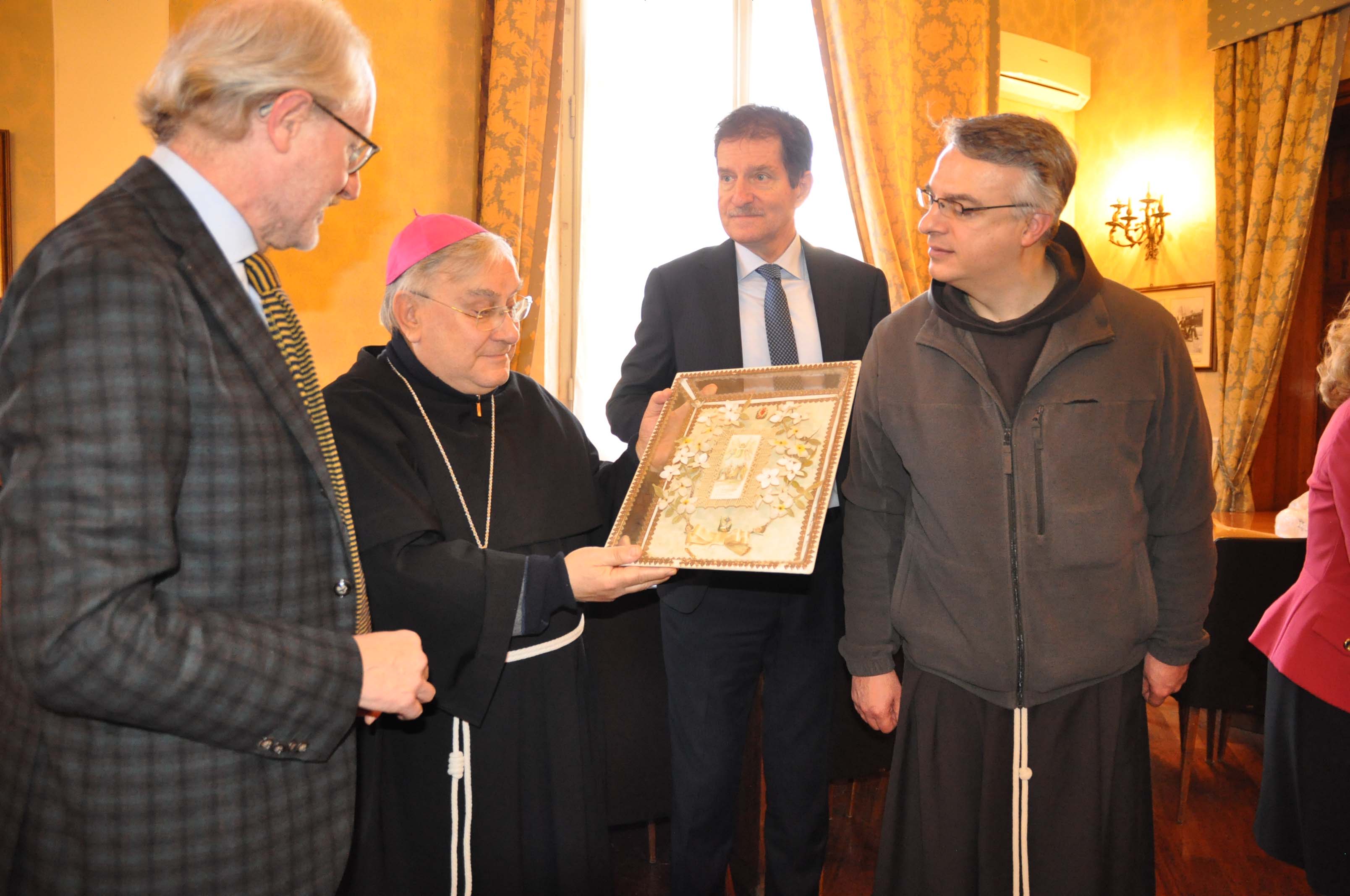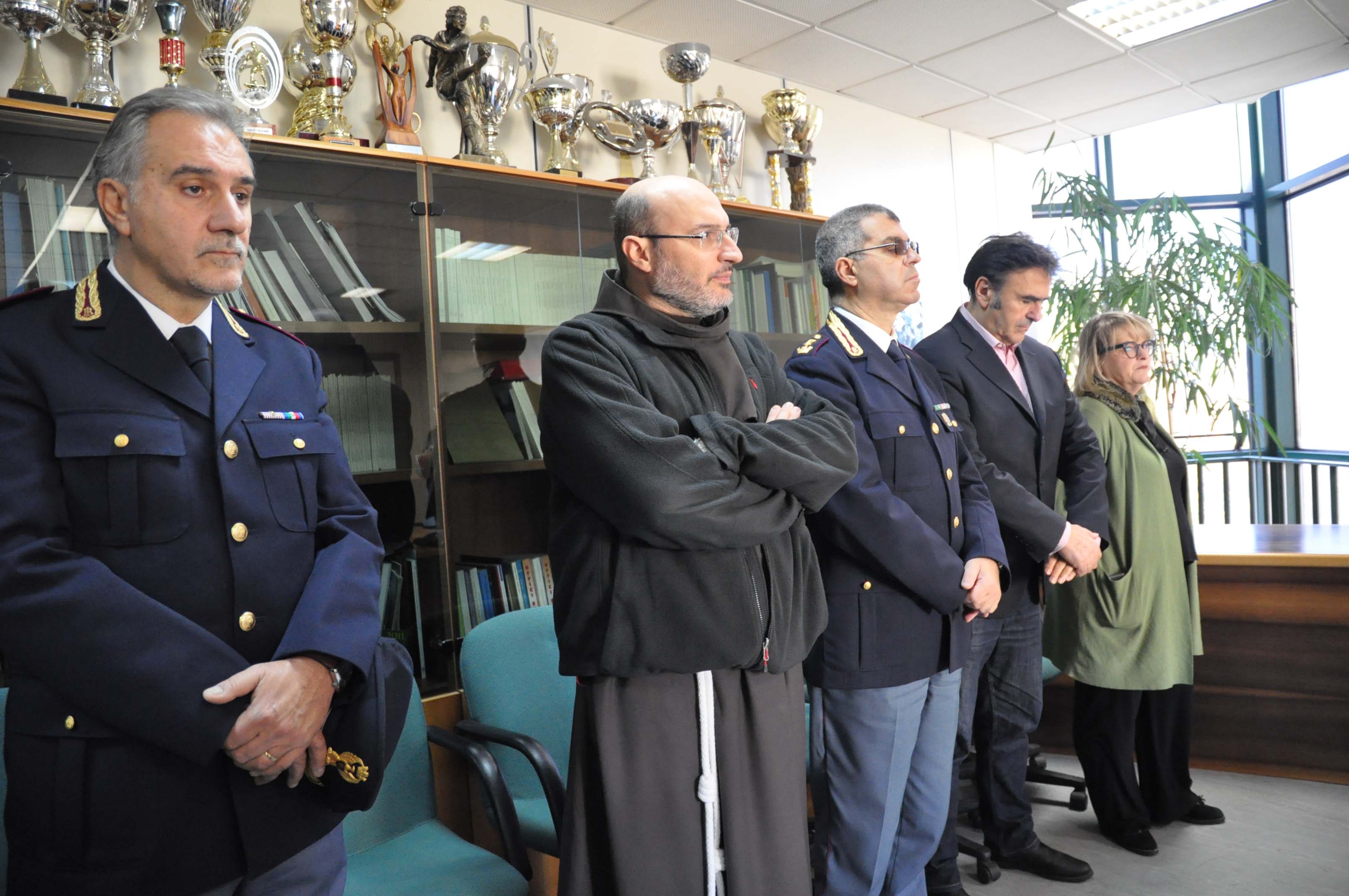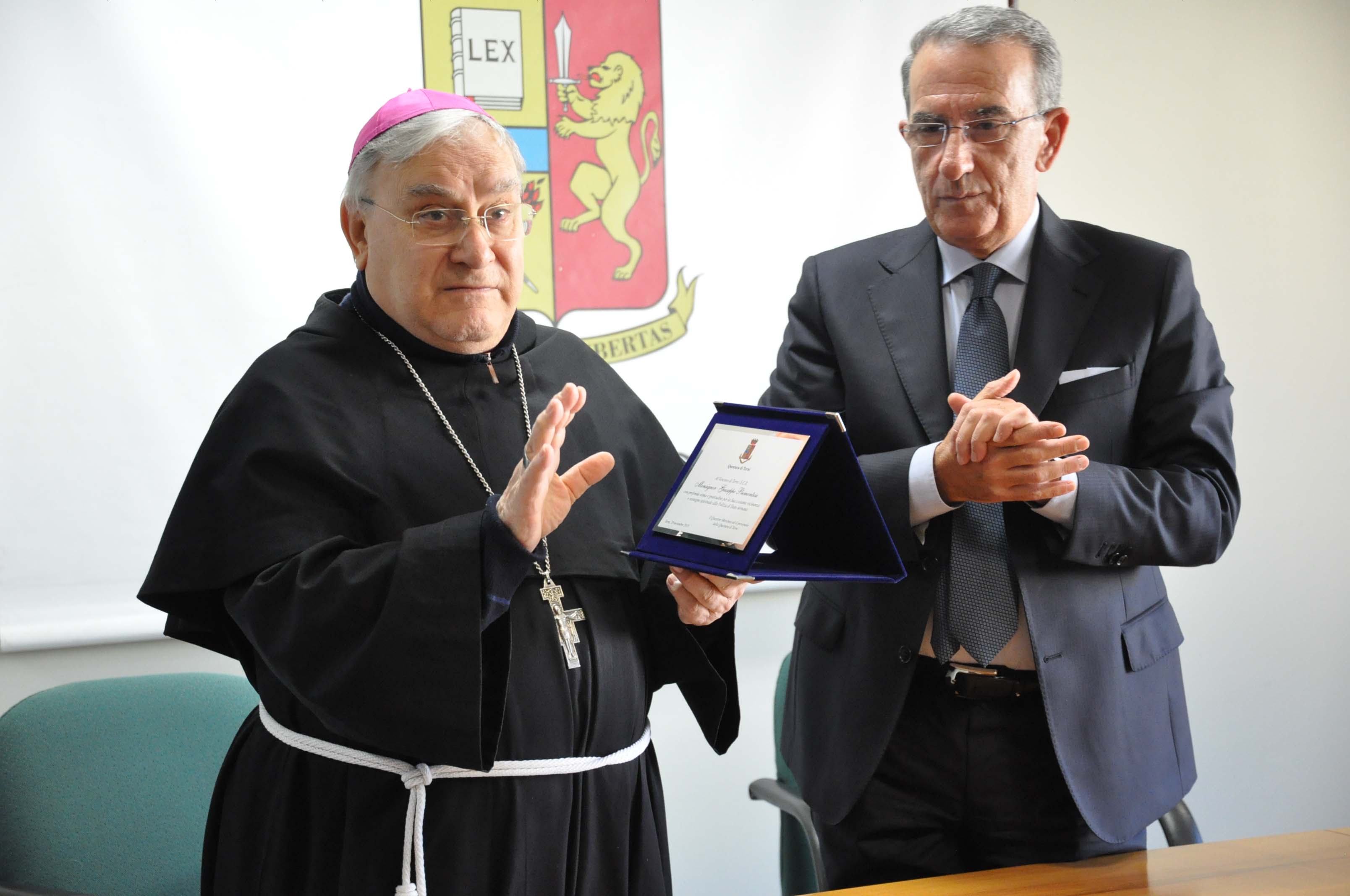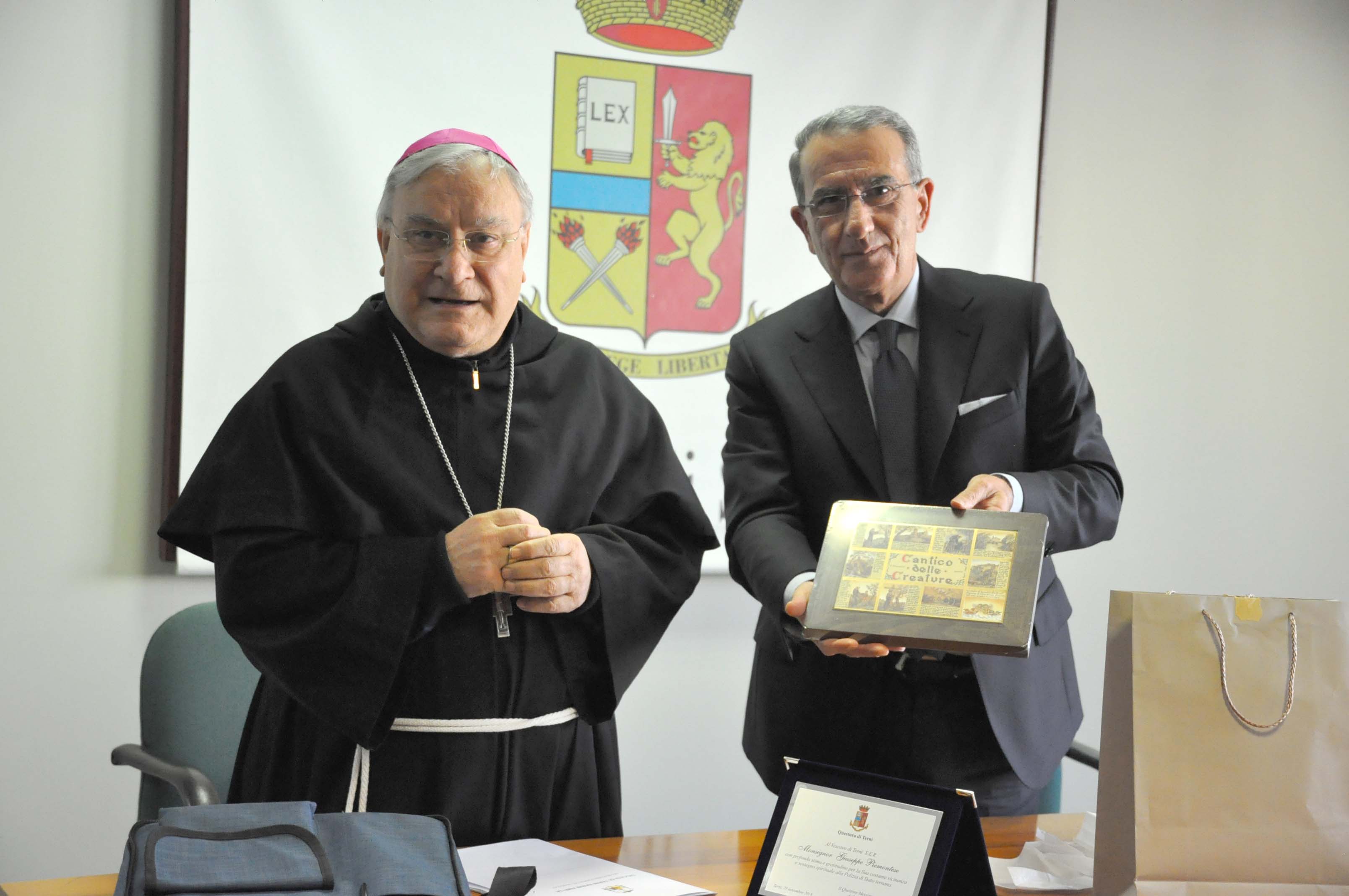 Il Vescovo ha ringraziato la Polizia per quello che fa, in uno spirito di collaborazione per operare per un fine comune; un lavoro per molti tratti simile, come ha detto il Questore Antonino Messineo, un’unità di intenti, in aiuto dei più deboli e delle persone in difficoltà. A ricordo della visita, il Questore ha consegnato una targa al Vescovo, che ha contraccambiato con un quadro raffigurante il “Cantico delle Creature” di San Francesco.