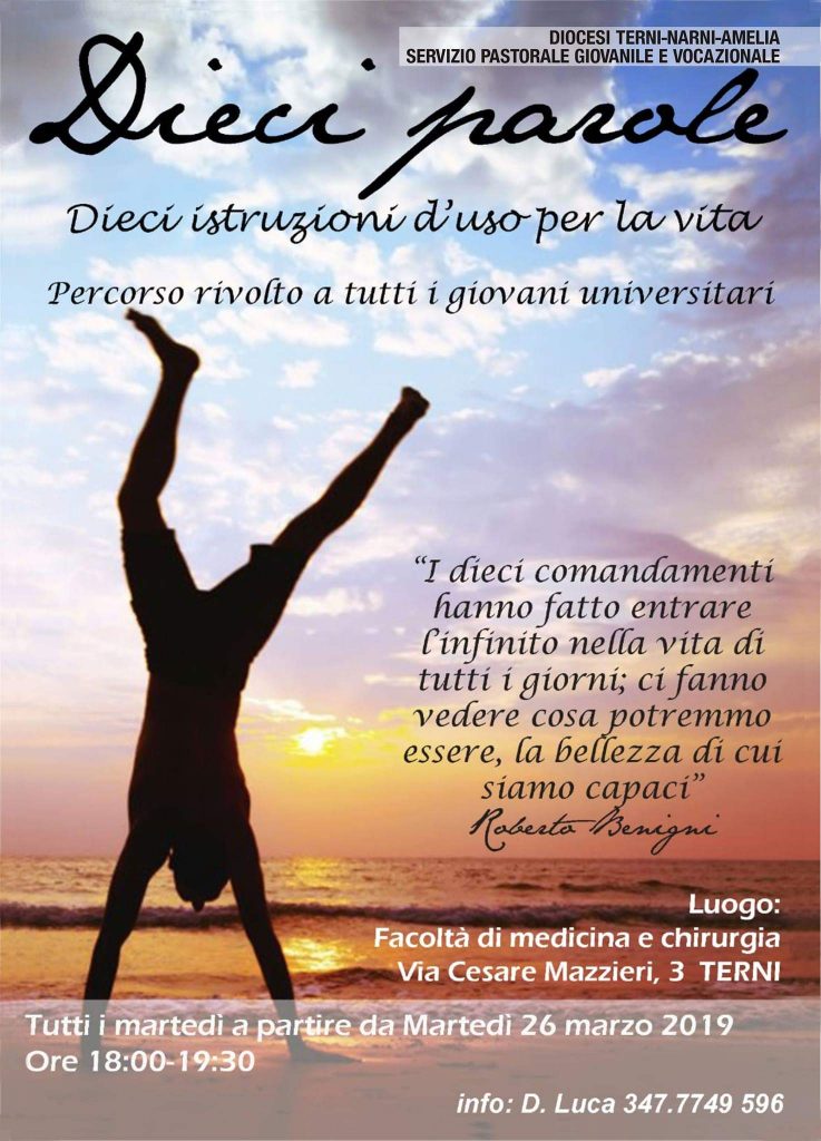 “Le 10 Parole” è il percorso di catechesi per scoprire la bellezza di vivere come Dio ci ha pensati, rivolto a tutti i giovani universitari , promosso dal Servizio di Pastorale Giovanile e Vocazionale della Diocesi. La catechesi si terrà tutti i martedì dal 26 marzo dalle ore 18.00 alle 19.30 presso la facoltà di medicina e chirurgia a Terni, guidata da don Luca Andreani.