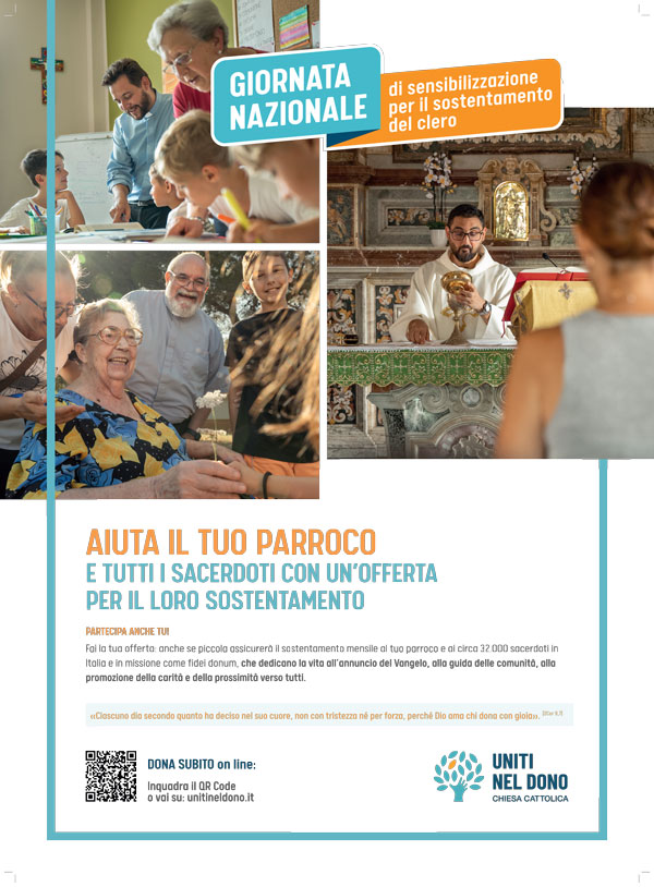 “La Giornata Nazionale – spiega il responsabile del Servizio Promozione per il Sostegno Economico alla Chiesa cattolica, Massimo Monzio Compagnoni – richiama l’attenzione sull’importanza della missione dei sacerdoti, sulla bellezza del loro servizio e sulla corresponsabilità richiesta alla comunità cattolica. È un’opportunità per esprimere gratitudine verso uomini di fede, speranza e prossimità, che ogni giorno offrono la loro vita per il bene delle comunità. Sostenerli non è solo un atto economico, ma un segno concreto di appartenenza e partecipazione ecclesiale”.